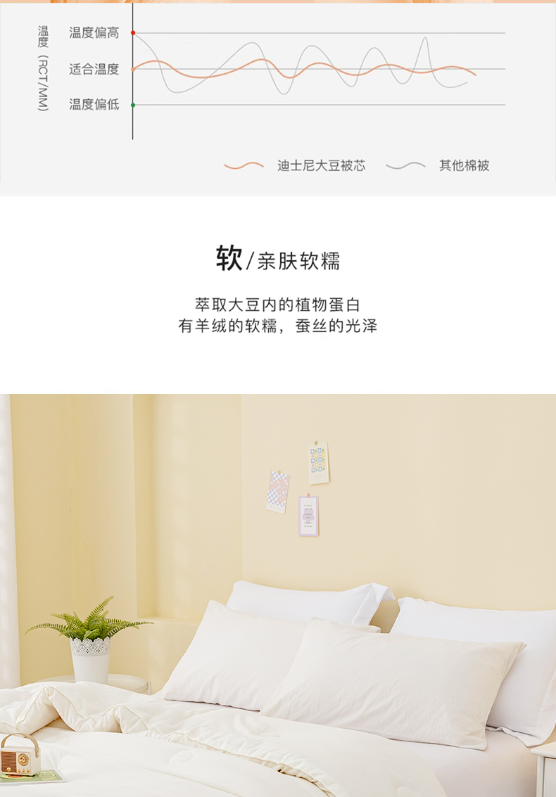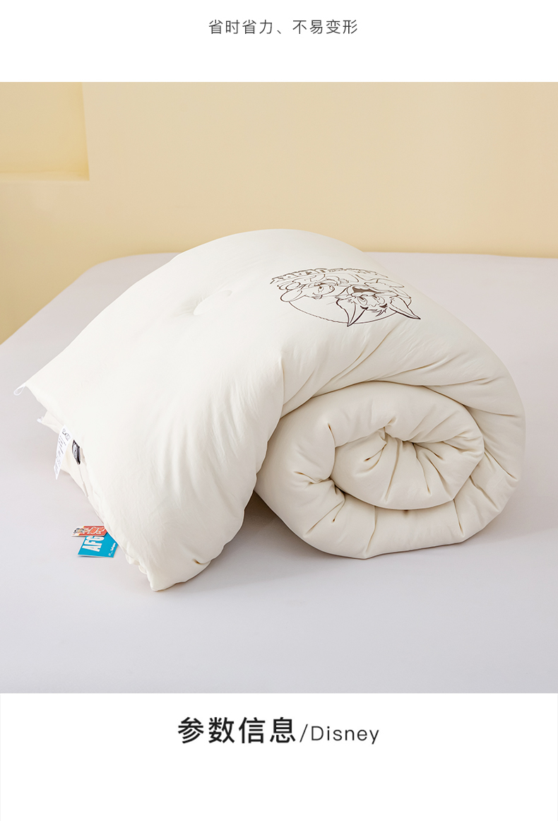 主要材质:面料:聚酯纤维 填充:10%大豆改性纤维90%聚酯纤维 产品重量(净/毛重) :2kg 产品尺寸:150*200cm 1、全网家纺品类正版授权卡通IP,可爱卡通形象深入人心 2、10%大豆纤维填充,吸湿、保暖性强拥有舒适睡眠质量 3、被子松软舒服手感柔软细腻,母婴A类级更亲肤 4、做工精细,精致绗缝工艺,亲肤整张棉填充不板结不跑棉不易变形