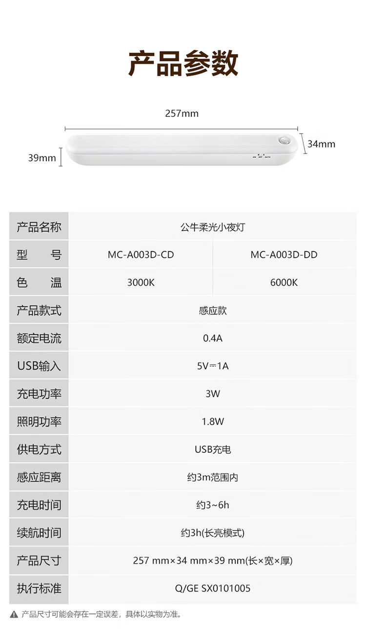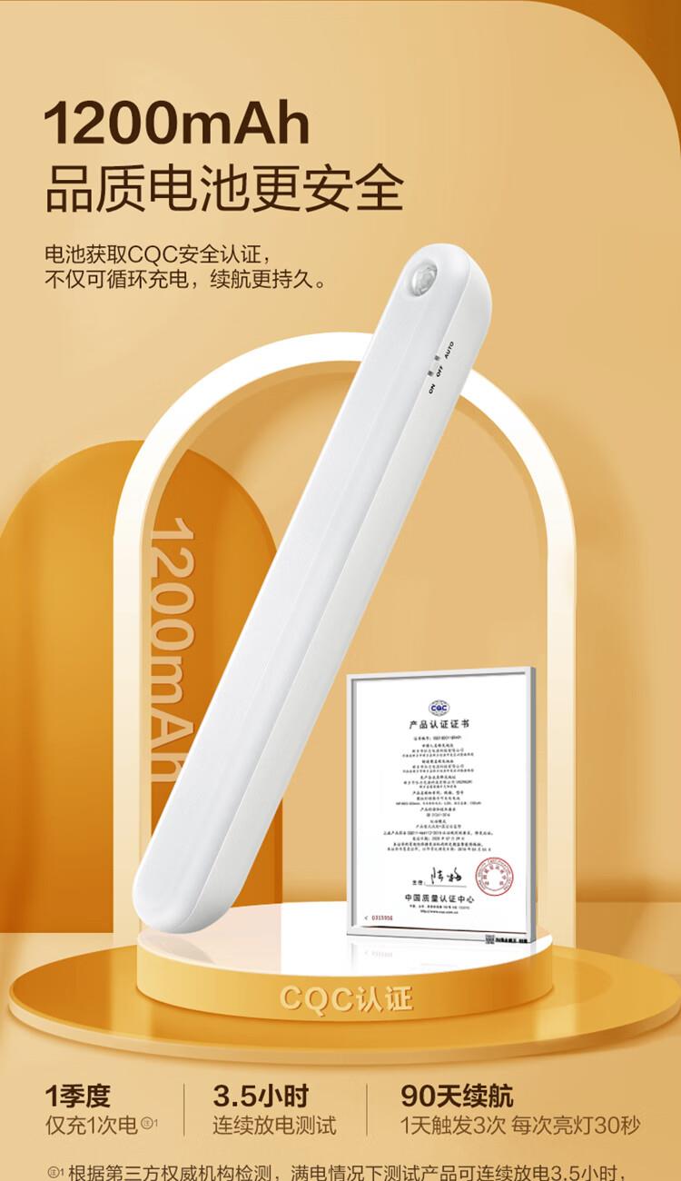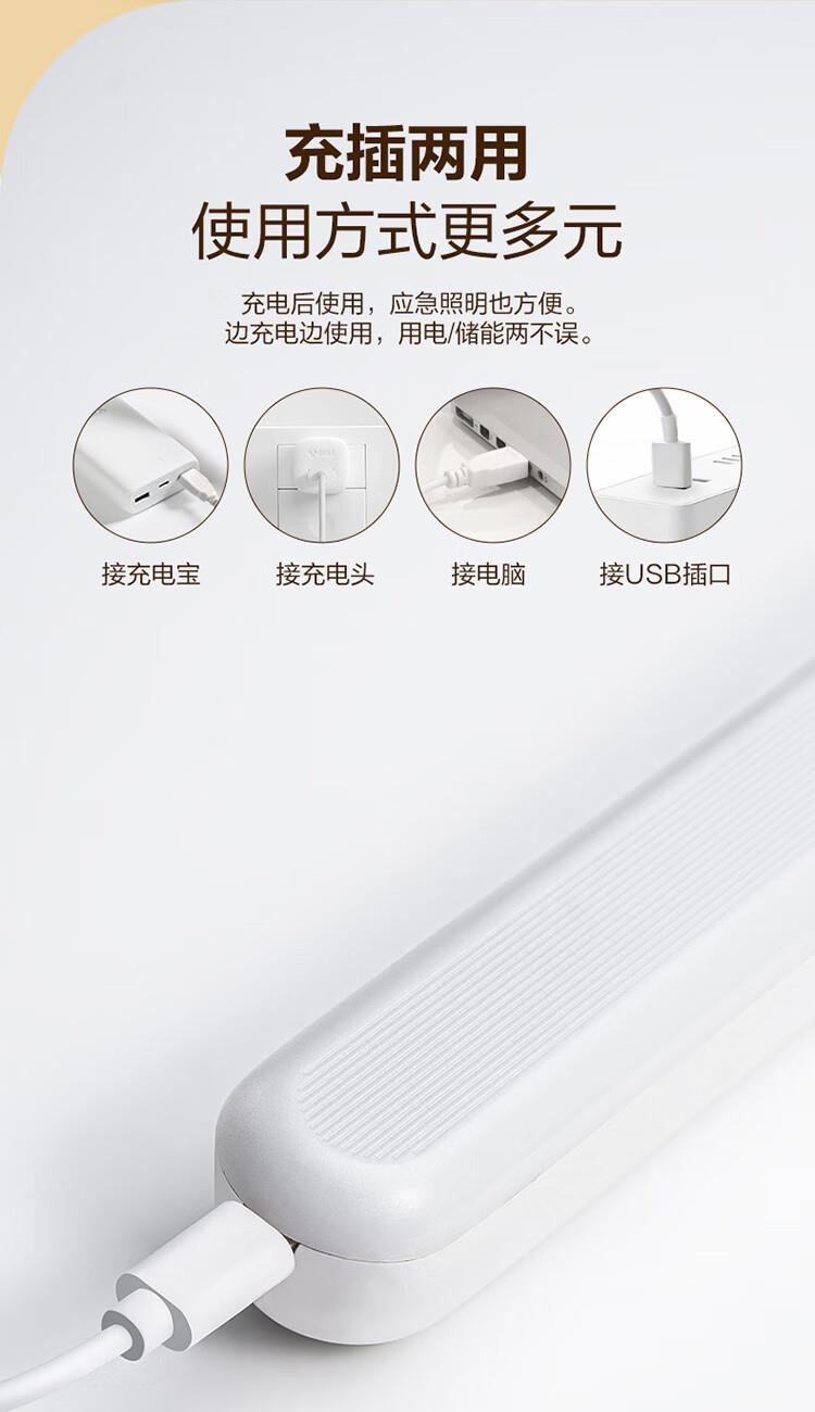 卖点: 1.3m感应距离 100°广角感应区域 ,昏暗环境下,人来即亮,反应灵敏。 2.人感+光感 双重感应触发更及时 昏暗环境下 人离开30s内灯光自动熄灭 。 3.品质电池更安全电池获取CQC安全认证,不仅可循环充电,续航更持久 4.充插两用 使用方式更多元充电后使用,应急照明也方便。 边充电边使用,用电/储能两不误。