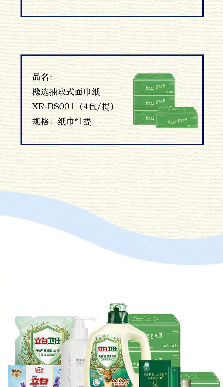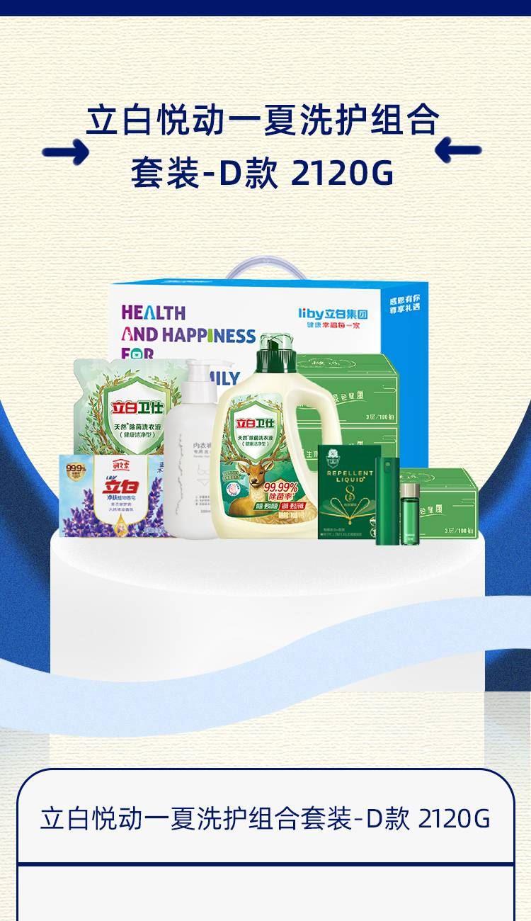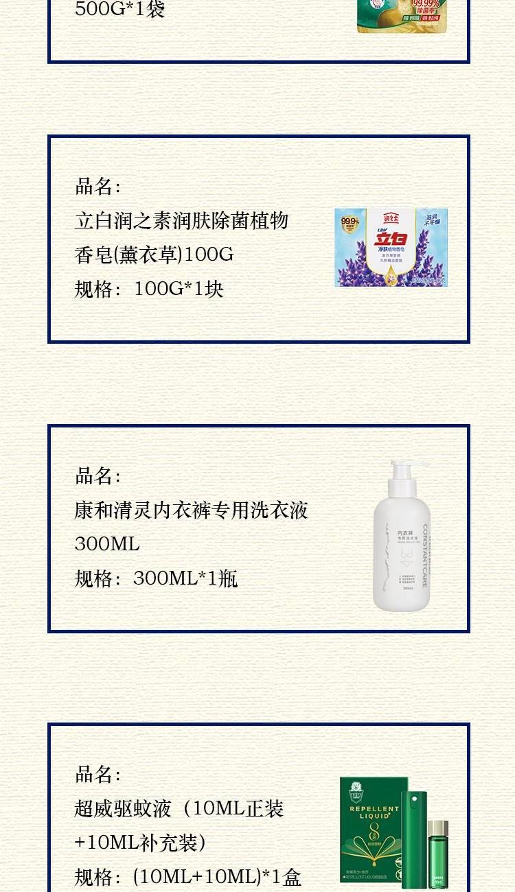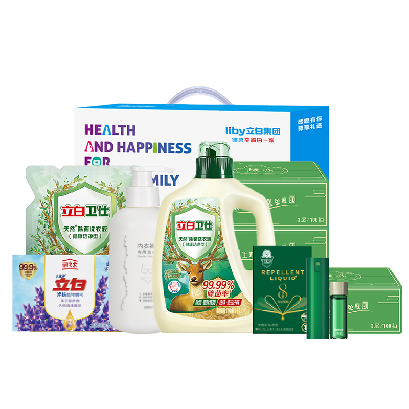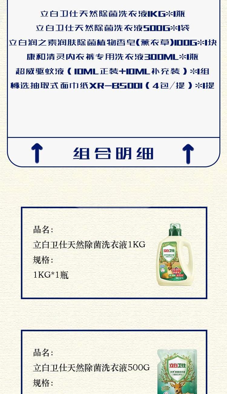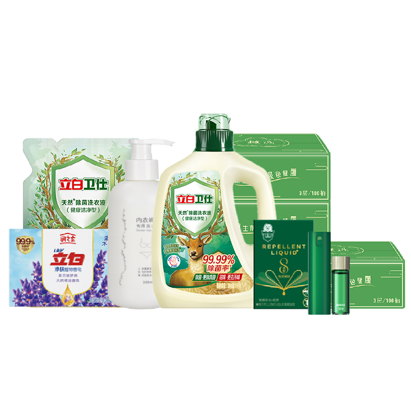 配置: 立白卫仕天然除 菌洗衣液1kg*1瓶 立白卫仕天然除 菌洗衣液500g*1袋 立白润之素润肤除 菌植物香皂(薰衣草)100g*1块 康和清灵内衣裤专用洗衣液300mL*1瓶 超威驱蚊液(10ml正装+10ml补充装)*1组 橼选抽取式面巾纸XR-BS001(4包/提)*1提 核心卖点: 立白卫仕,除 菌洗衣液,除 菌和洗涤性能、天然的香味、人性化的包装设计、防霉效果、安全性以及祛味功能。深入衣物纤维,去除各种异味,留下淡淡的自然清香。 夏天清凉组合套装的不二之选。