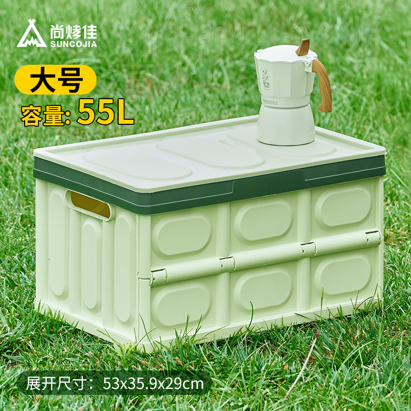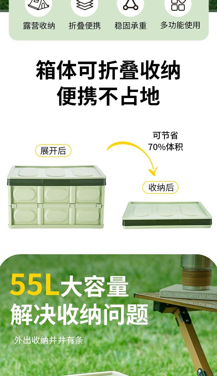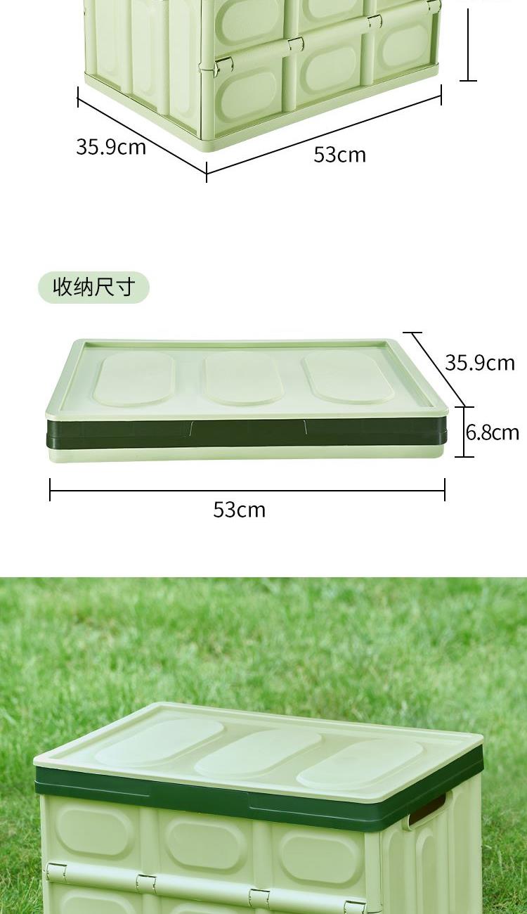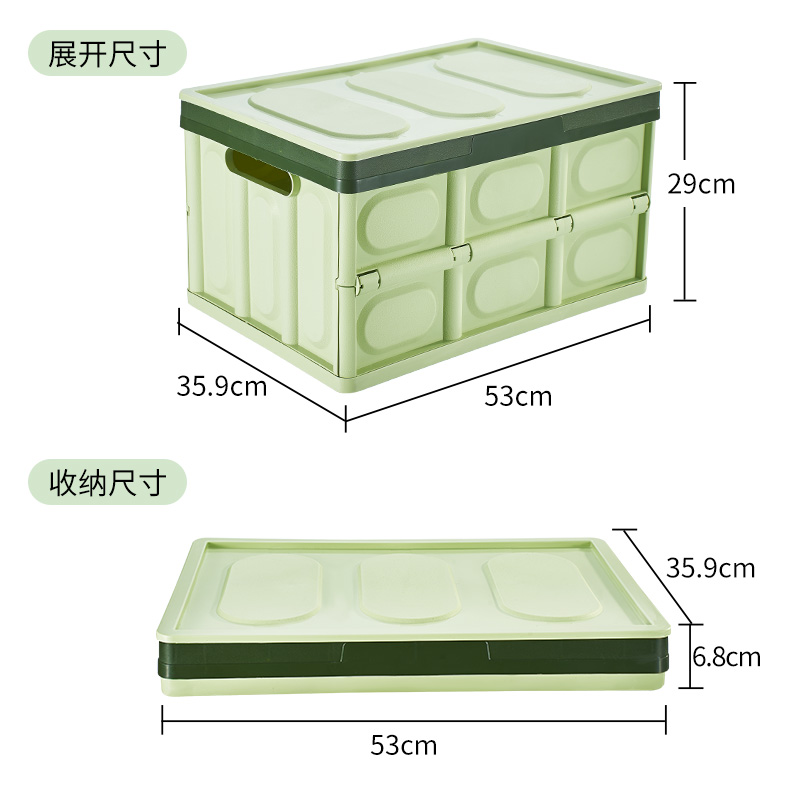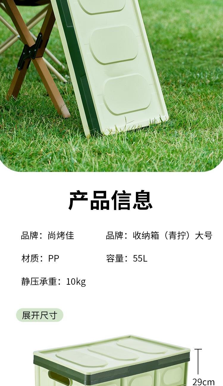 材质:PP 容量:55L 静压承重:10kg 展开尺寸:长53cm*宽35.9cm*高29cm 收纳尺寸:长53cm*宽35.9cm*高6.8cm
