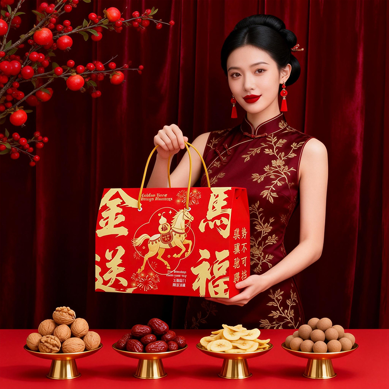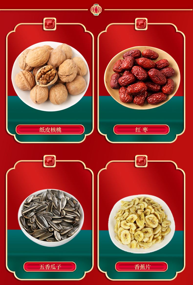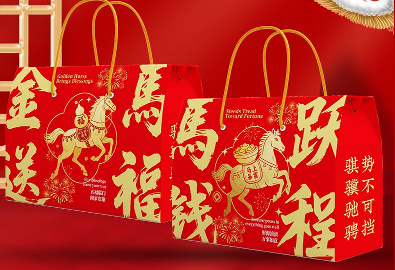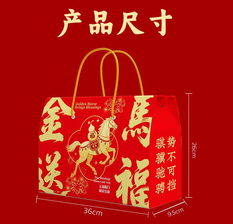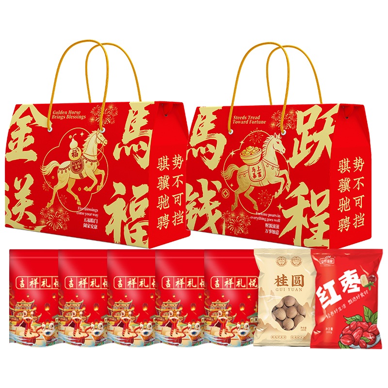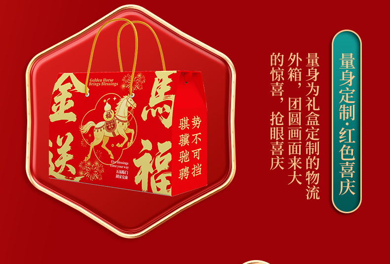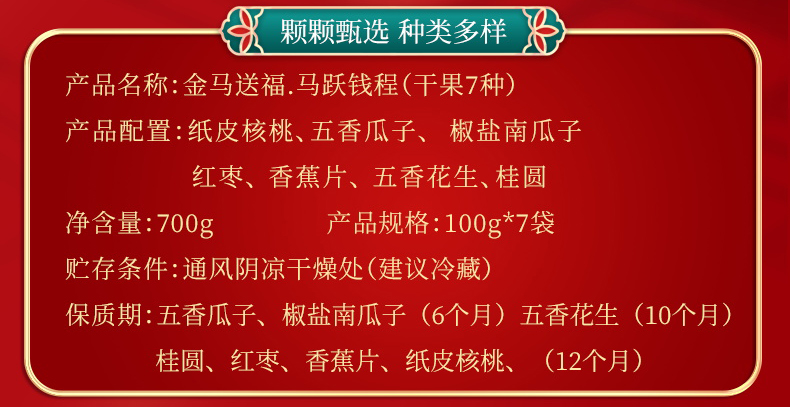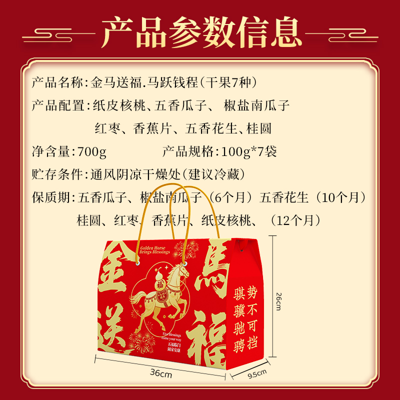 礼盒:金马送福·马跃钱程 净含量:700g 产品规格配置:纸皮核桃、五香瓜子、桂圆、椒盐南瓜子红枣、香蕉片、五香花生(100gx7袋) 盒尺寸:36*26*9.5cm 箱尺寸:60*28*38 箱重量:6.6kg 箱体积:0.064方