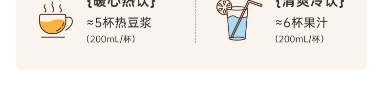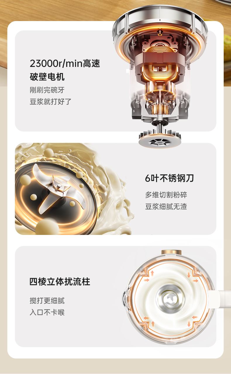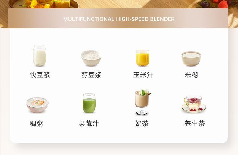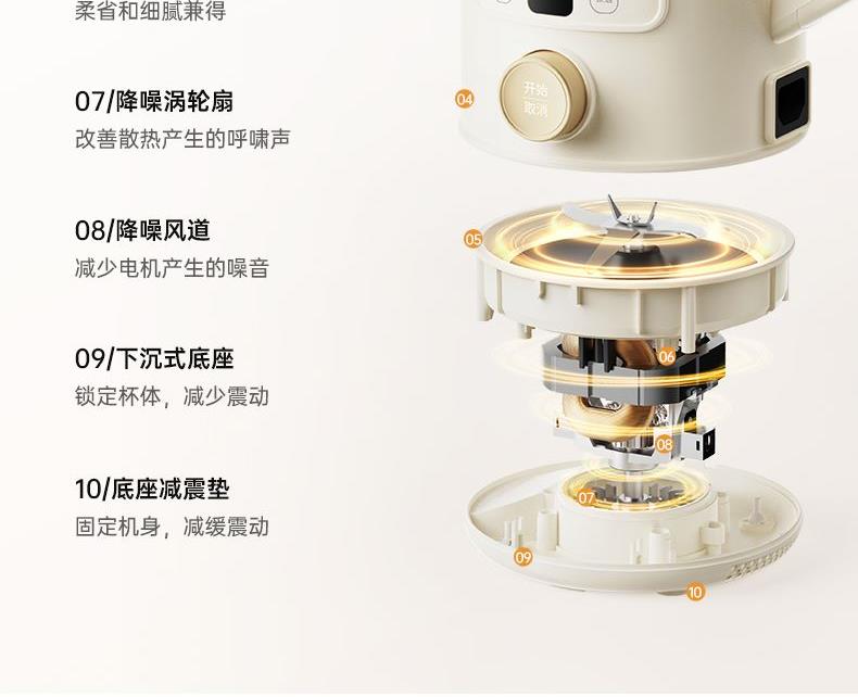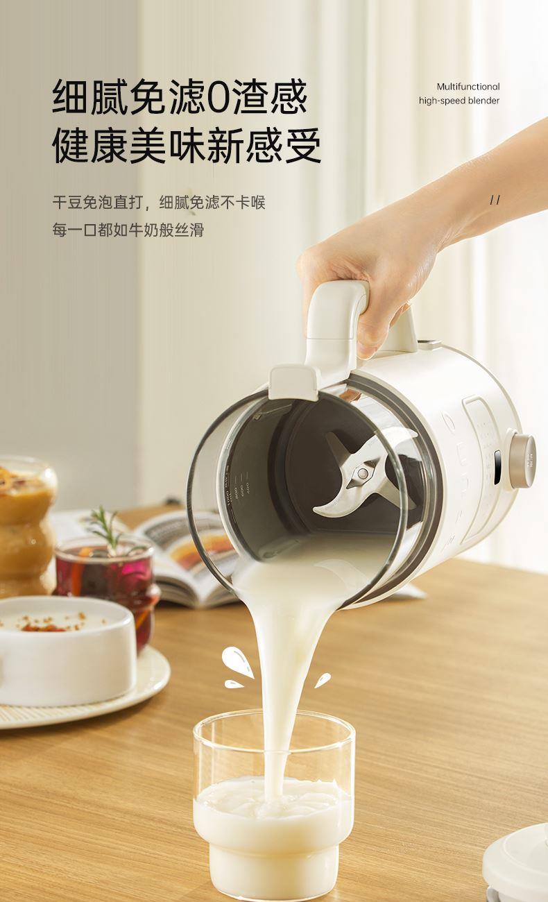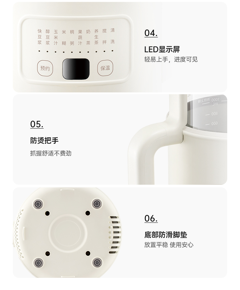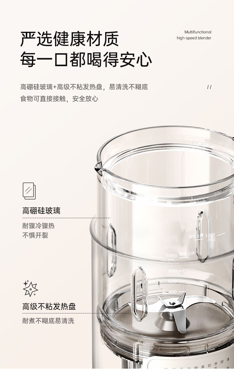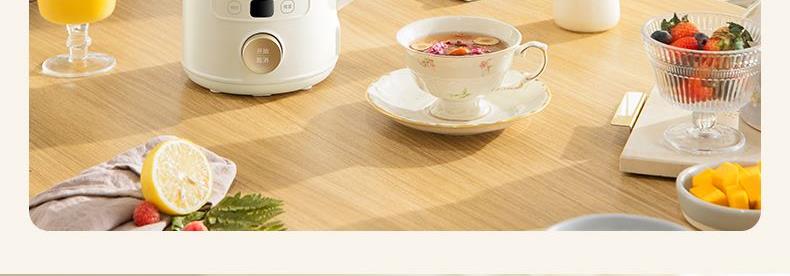 花样饮品随心做,健康养生双倍快乐 严选健康材质,每一口都喝得安心 细腻免滤0渣感,健康美味新感 ①简煮一壶茶汤,感受生活小美好(选配不锈钢茶漏功能) ②10大降噪技术,轻音破壁不扰眠 ③每天多睡1小时,清晨美味与元气并存 ④开放式保温,锁住营养和温度 ⑤懒人解放双手,生活从此更从容(一键高温自动清洗) ⑥兼具轻盈与优雅,举握之间毫不费力(重量仅?kg) ⑦一次满足6杯量,闺蜜好友齐分享(1.2L大容量) ⑧智能防溢免看管,高海拔地区也能用