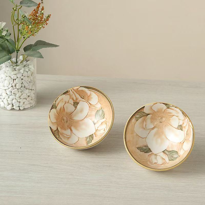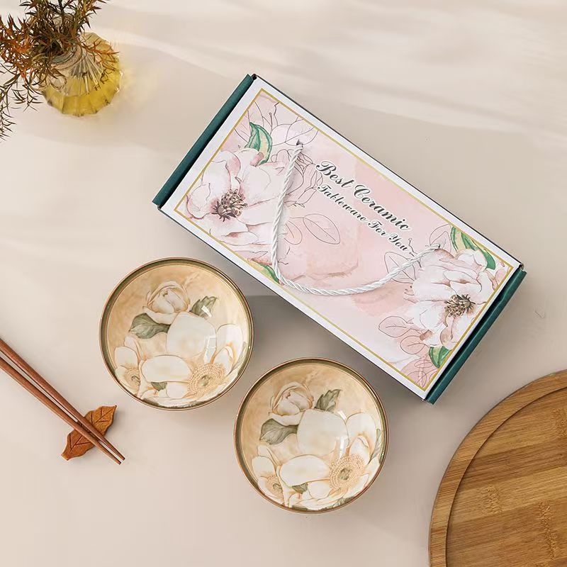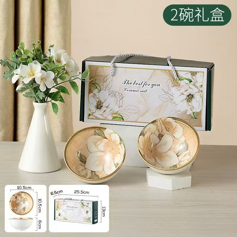 2碗套装:规格:25*6*12.5cm、466g 外箱尺寸:52*33*64cm 27kg 产品特点: 清新雅致的花瓷碗筷,仿佛能闻到花香。简单生活的美好,从这一餐开始🍽️✨ 高质量陶瓷碗,精美彩盒包装。有颜值兼具实用性,是送 礼的佳选