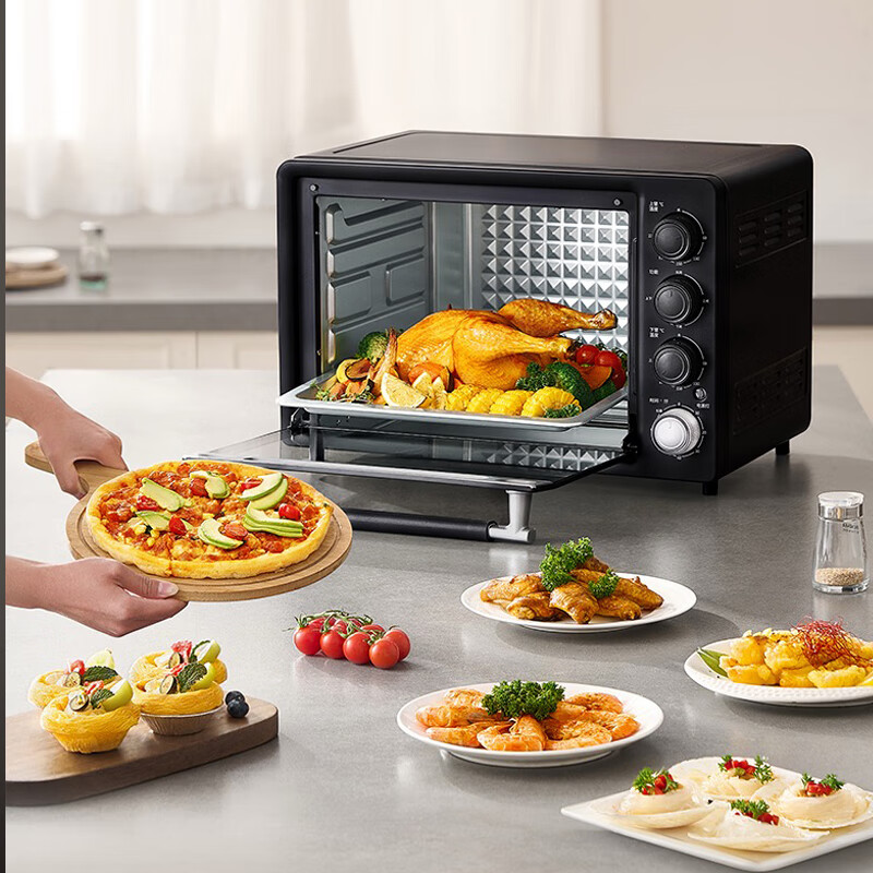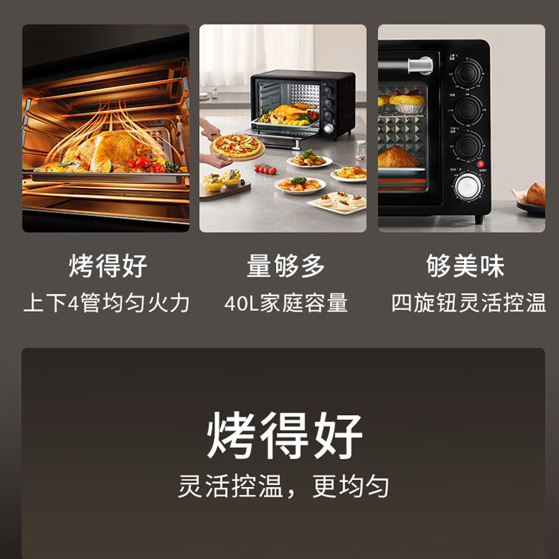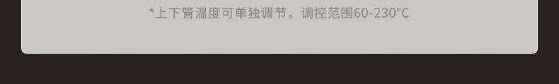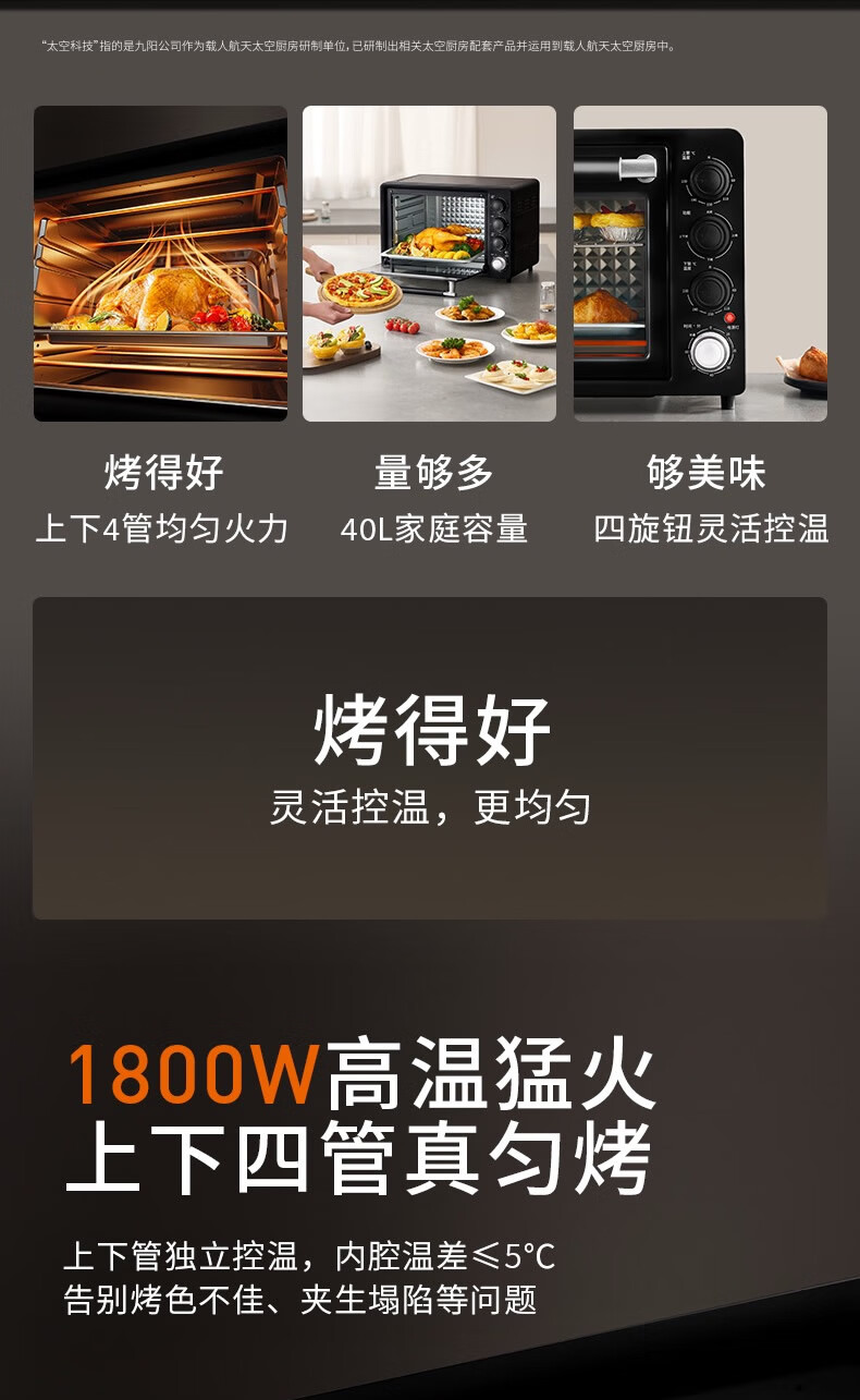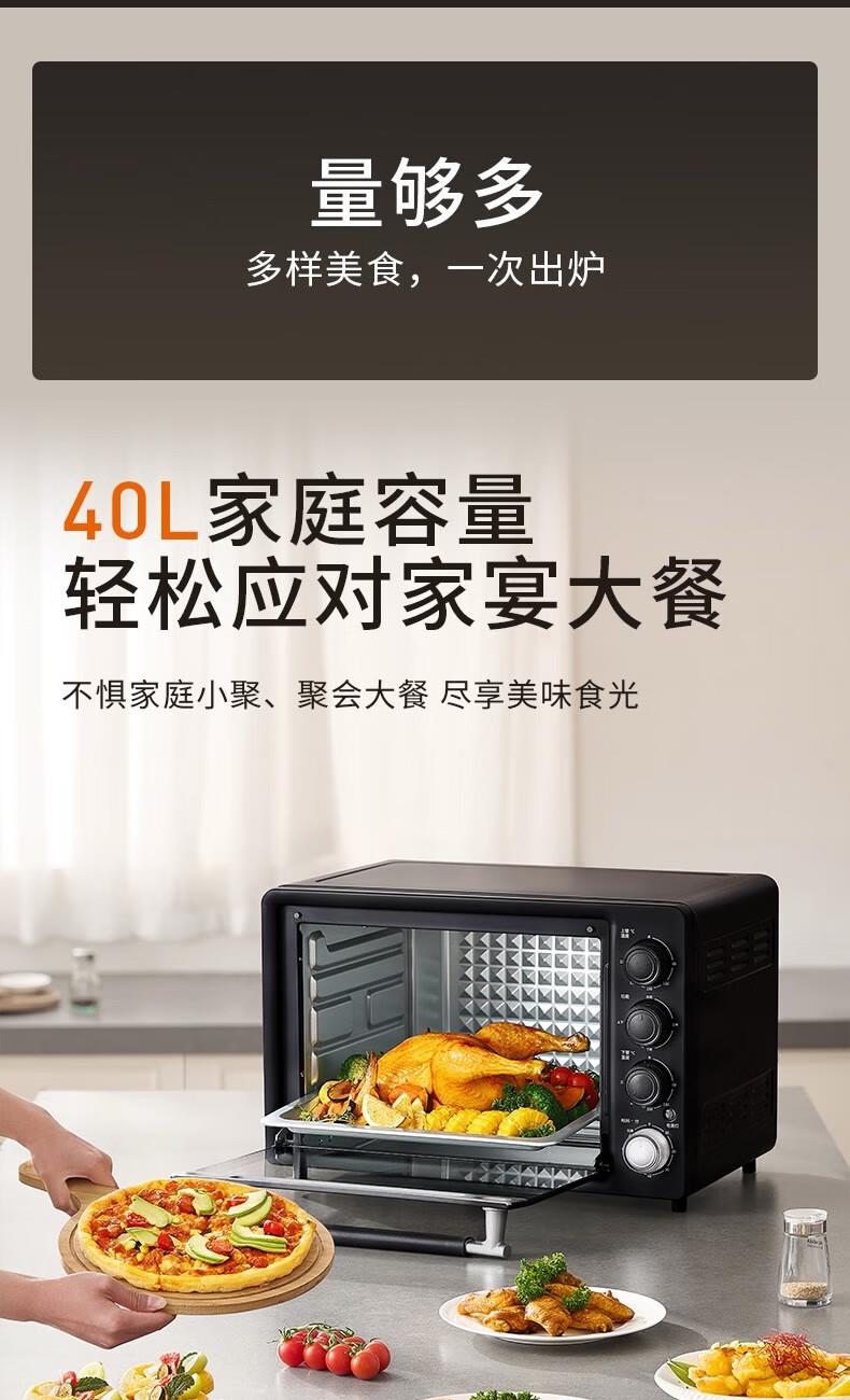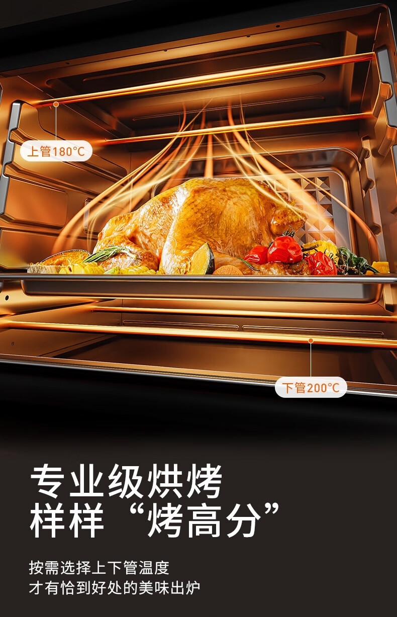 1、1800W高温猛火 2、上下四管独立控温 3、60-230度广域温控,日常美食需求全覆盖 4、40L容量,轻松应对家宴大餐 产品尺寸:505*422*340mm