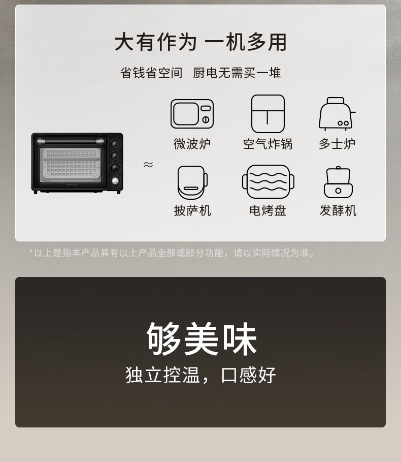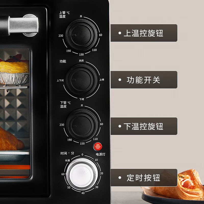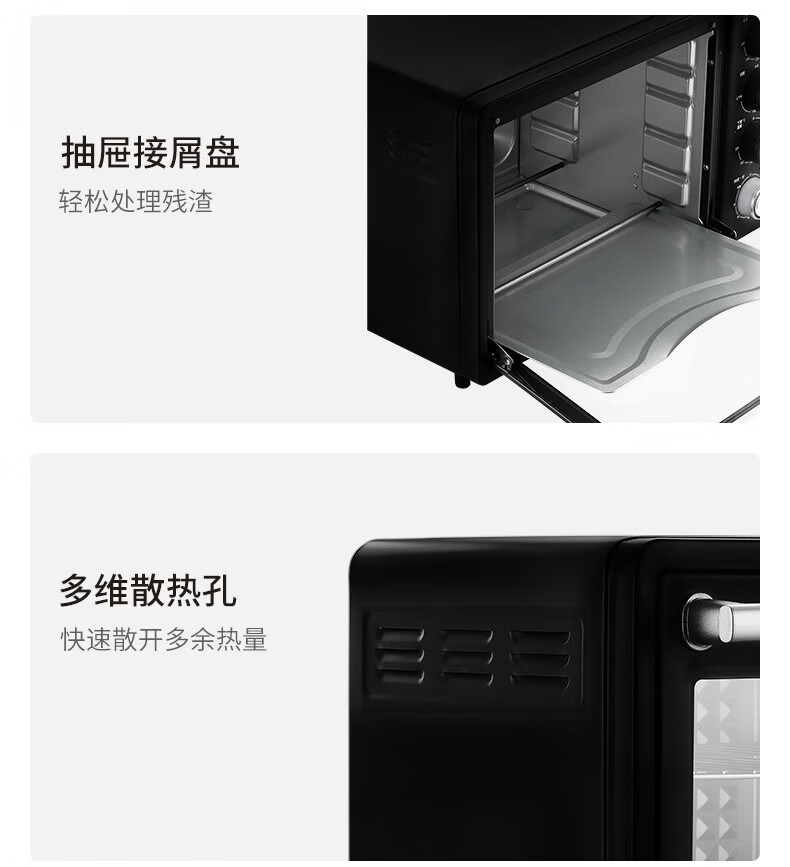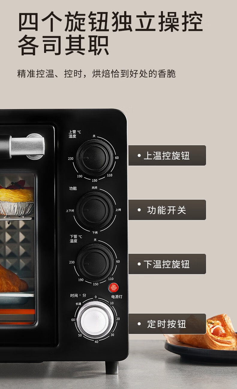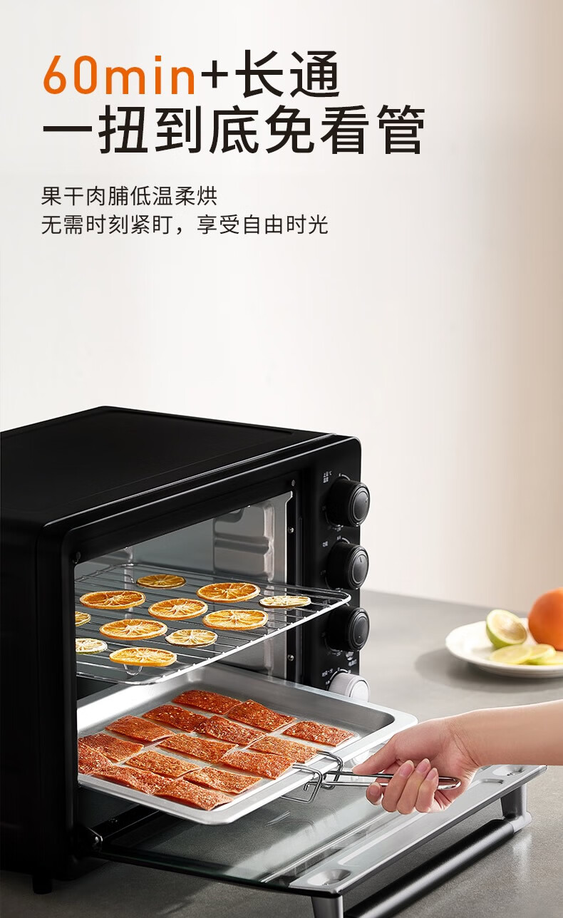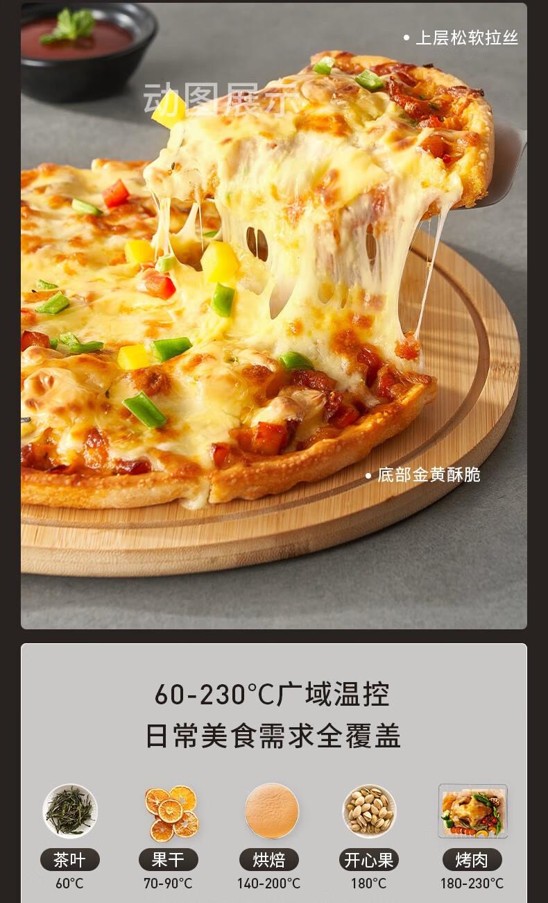 1、1800W高温猛火 2、上下四管独立控温 3、60-230度广域温控,日常美食需求全覆盖 4、40L容量,轻松应对家宴大餐 产品尺寸:505*422*340mm
