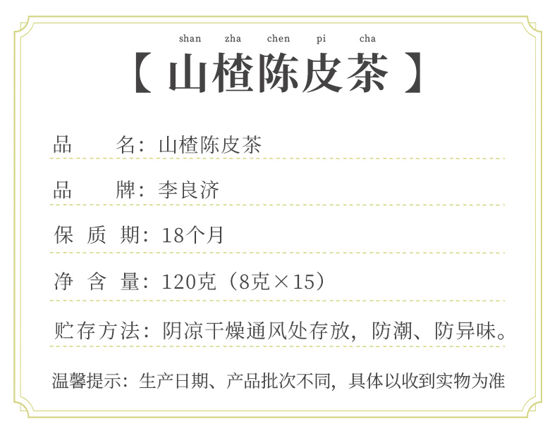 产品:李良济山楂陈皮茶 规格:净含量120克(8g*15包) 保质量:18个月 贮藏方法:阴凉干燥通风处存放,防潮,防异味 配料表:山楂、橘皮等 办公室饮品,商务接待,白领自饮 精致包装,送礼佳选