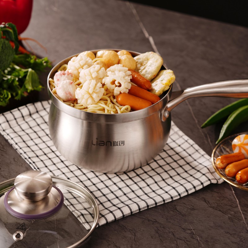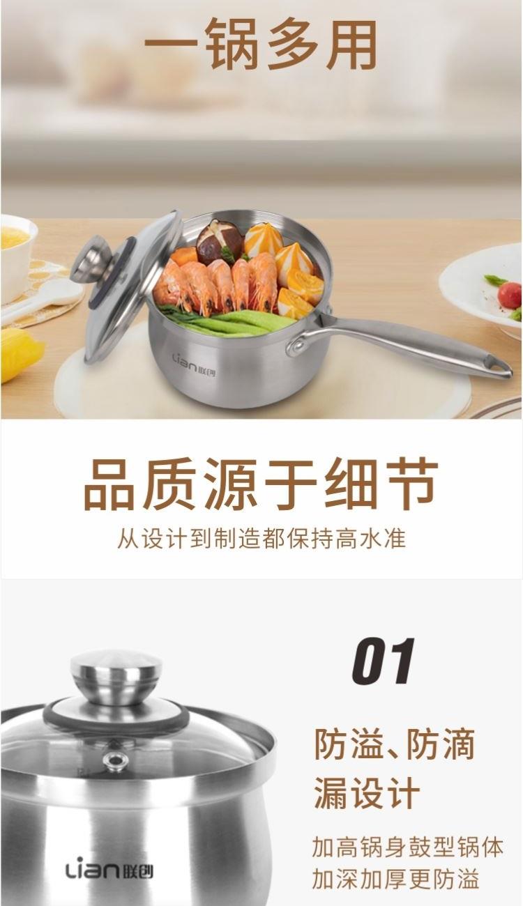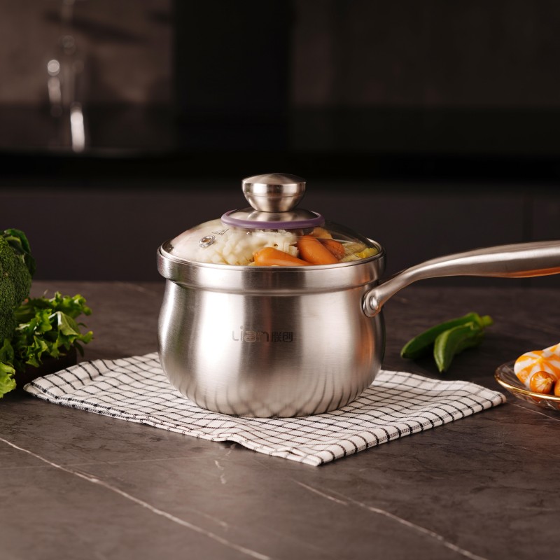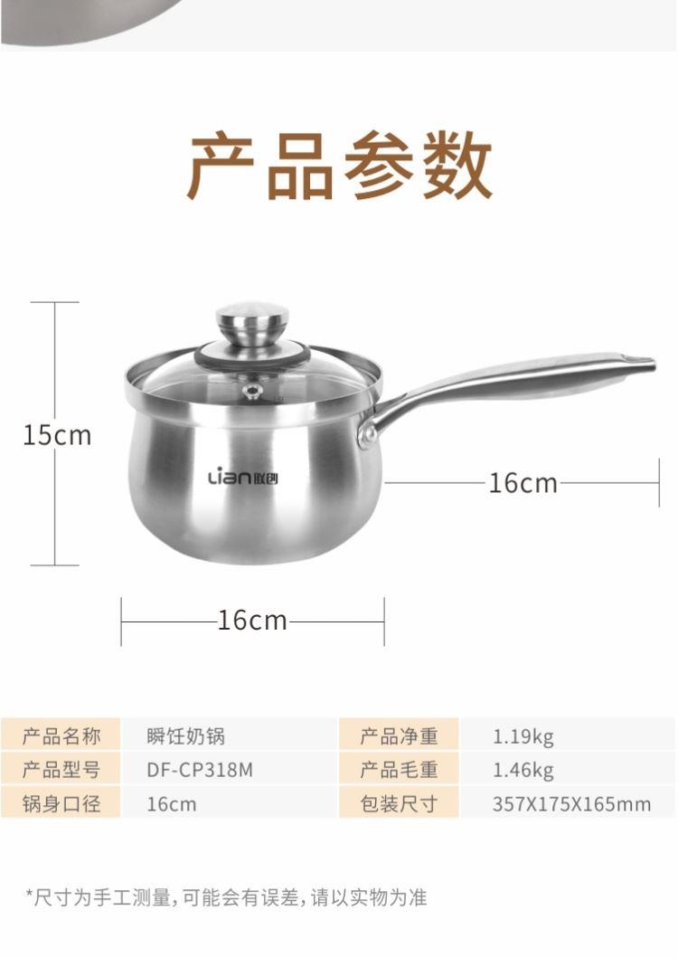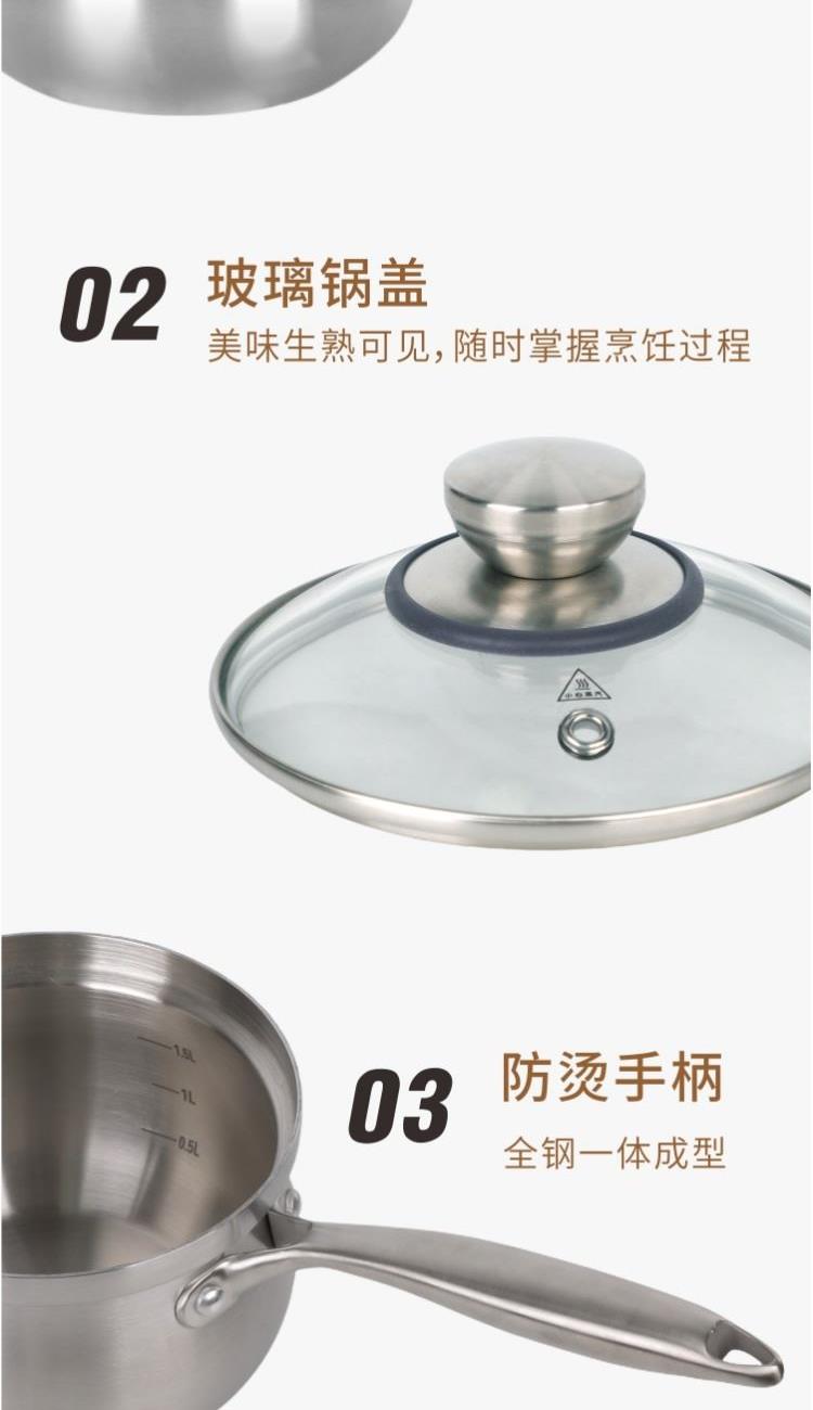 口径:16cm 产品净重:1.19kg 产品毛重:1.46kg 整箱毛重:17.8kg 产品尺寸:335 ⅹ 160 ⅹ 106mm 彩盒尺寸:193 ⅹ 135 ⅹ 331mm 外箱尺寸:730 ⅹ 440 ⅹ 410mm 材质:304不锈钢、钢化玻璃 1、聚能锅底,导热迅速。热能传递均匀节能省时省力; 2、优质加厚三层304不锈钢,锅身、锅底一体成型,结实耐用; 3、可视玻璃锅盖、全钢一体成型防烫手柄,防溢锅沿,导热锅底; 4、锅体翻边设计,倾倒顺畅出锅防漏,不易洒落; 5、锅底不挑炉具,受热迅速,导热更均匀,节能省时; 6、多重精致抛光,一抹即净易清洗。