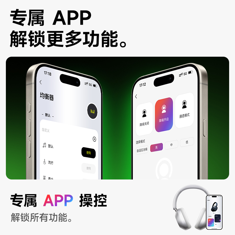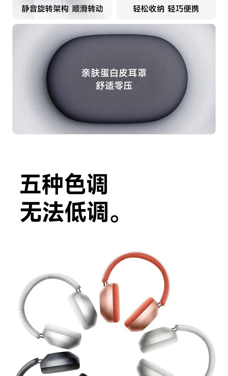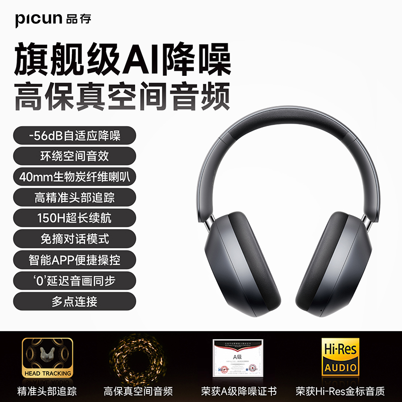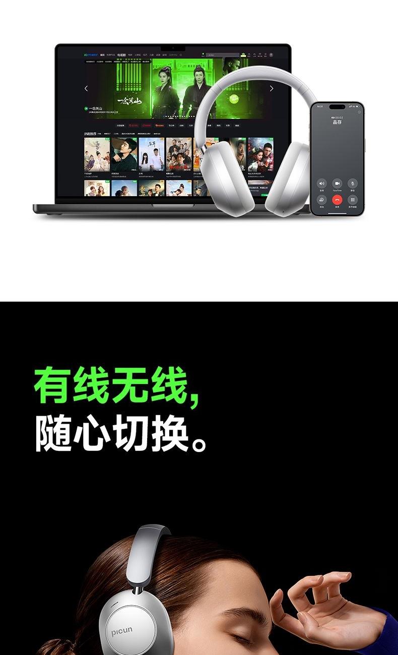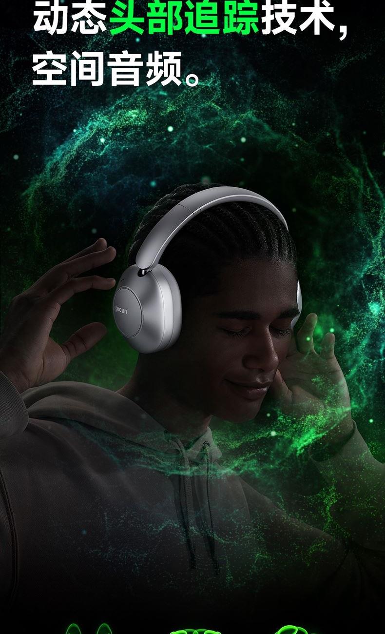颜色:粉色、天蓝色、深空灰、银色、 连接模式:插音频线、蓝牙 蓝牙方案:JL7018 蓝牙版本:V5.4 电池容量:1200mAh 使用时间(70%音量):120小时, 开启降噪100小时 接受距离:10m 降噪深度:-35dB 频响范围:20HZ-20KHZ 喇叭尺寸:40mm 喇叭灵敏度:105±3dB(1khz) 充电接口:Type-c 1、支持【picun品存】APP智能互联控制 2、4麦阵列先进混馈降噪技术, 降噪深度达38DB 3、千元HIFI无损音质 大师级调教+自定义音效+空间音频 4、1200毫安大容量电池,zui高可支持120小时续航 5、支持头部追踪定位 6、全景声空间音频