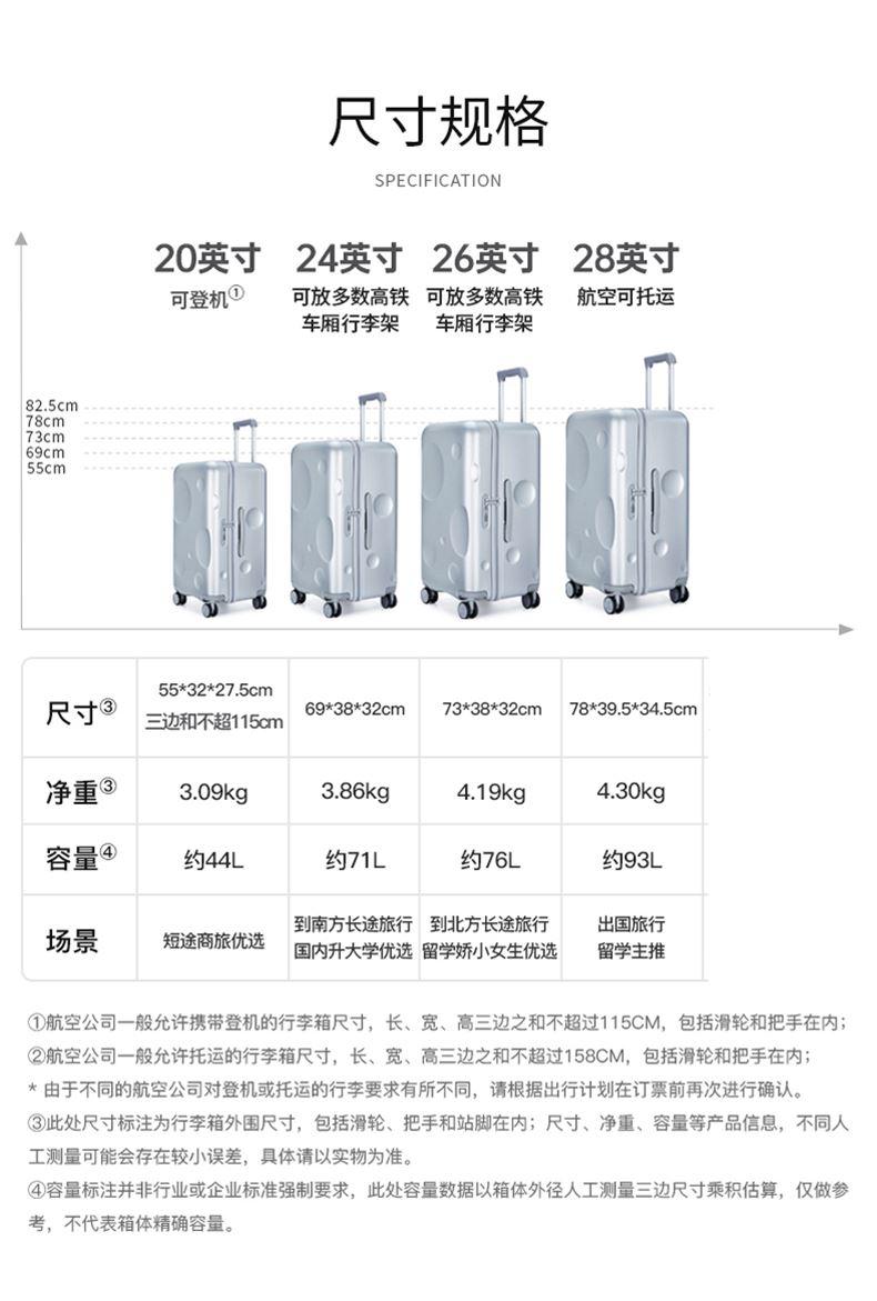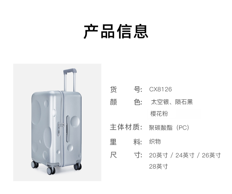 货号: CX8126-24 主体面料:聚碳酸酯(PC);里料:织物 24寸颜色:时空银 净重:3.86kg/71L