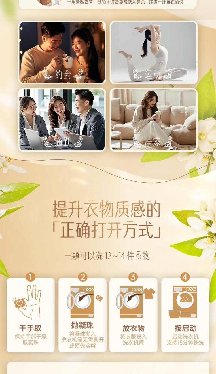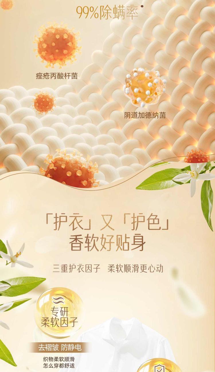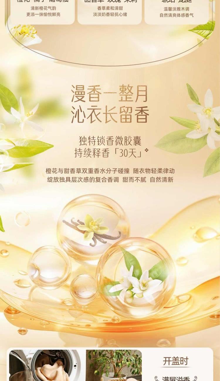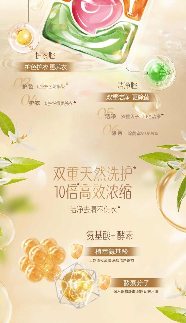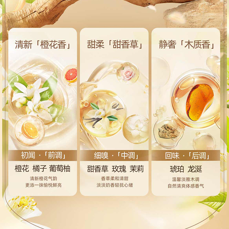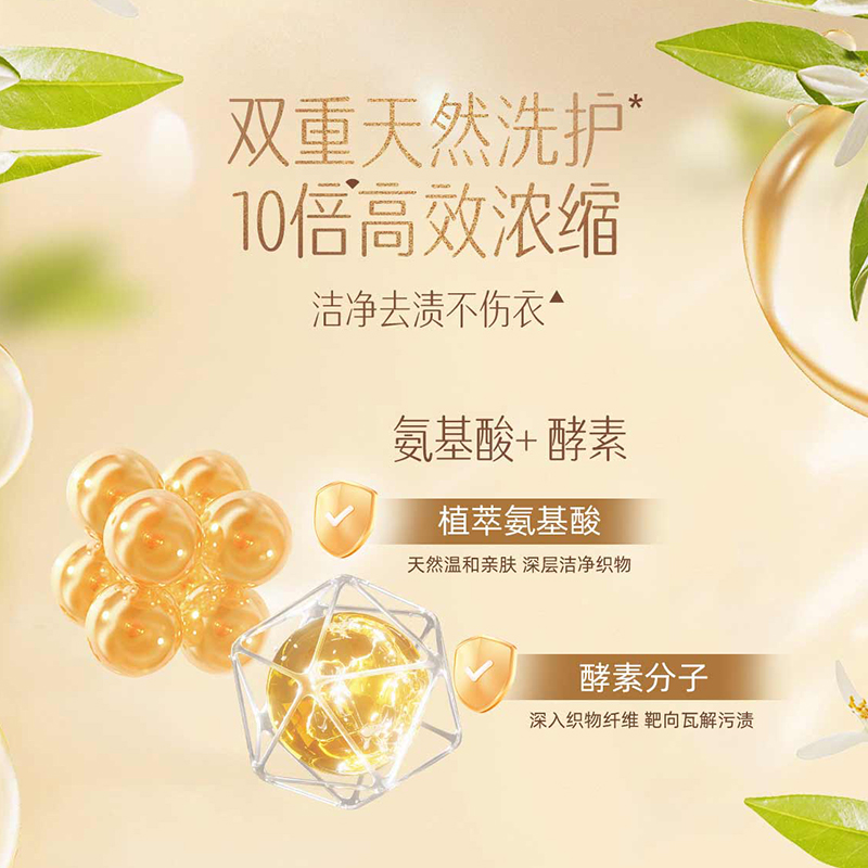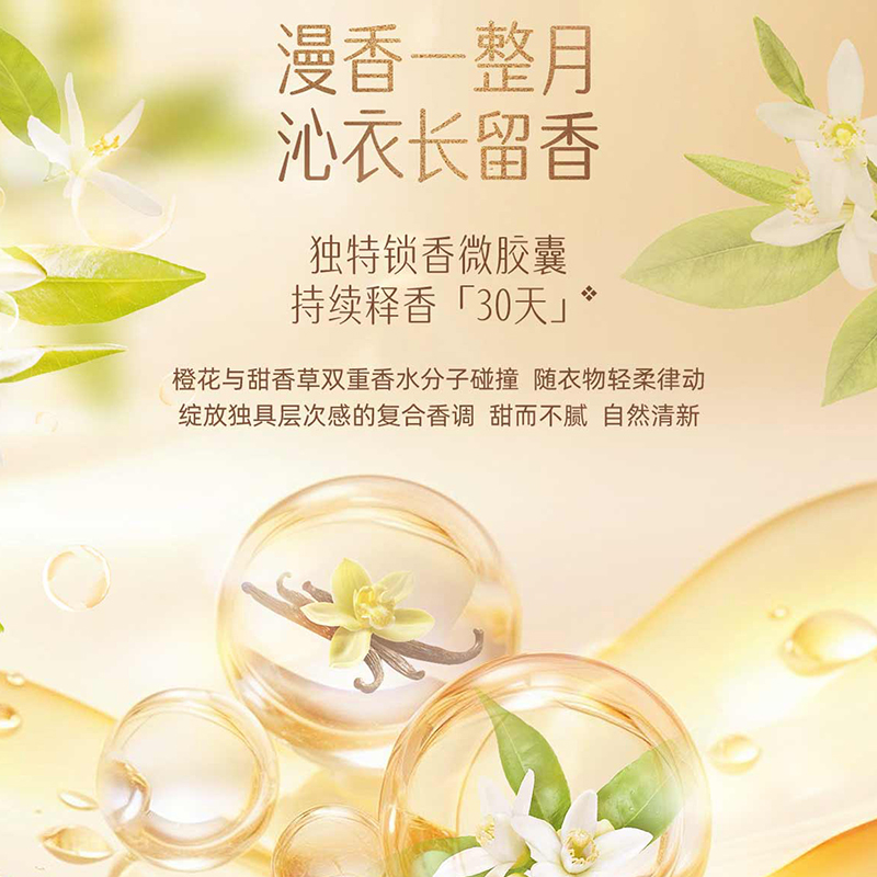 参数: 保质期:3年 香型:甜香草与橙花 产品成分:天然酵素(酶制剂)、表面活性剂(含氨基酸表面活性剂)、榄油精华、椰子油精华、污垢分散剂、稳定剂、杀 菌剂、护色因子、小麦蛋白精华、香精、着色剂 卖点: 1.多效洗护 独占沙龙奢香 2.双重天然洗护 10倍高效浓缩 3.独特锁香微胶囊 持续释香30天
