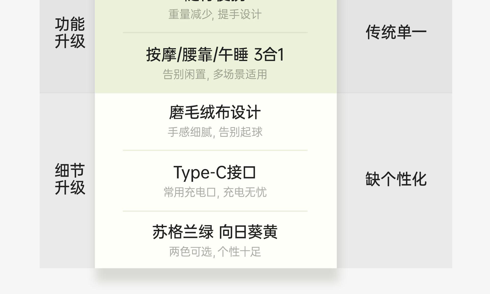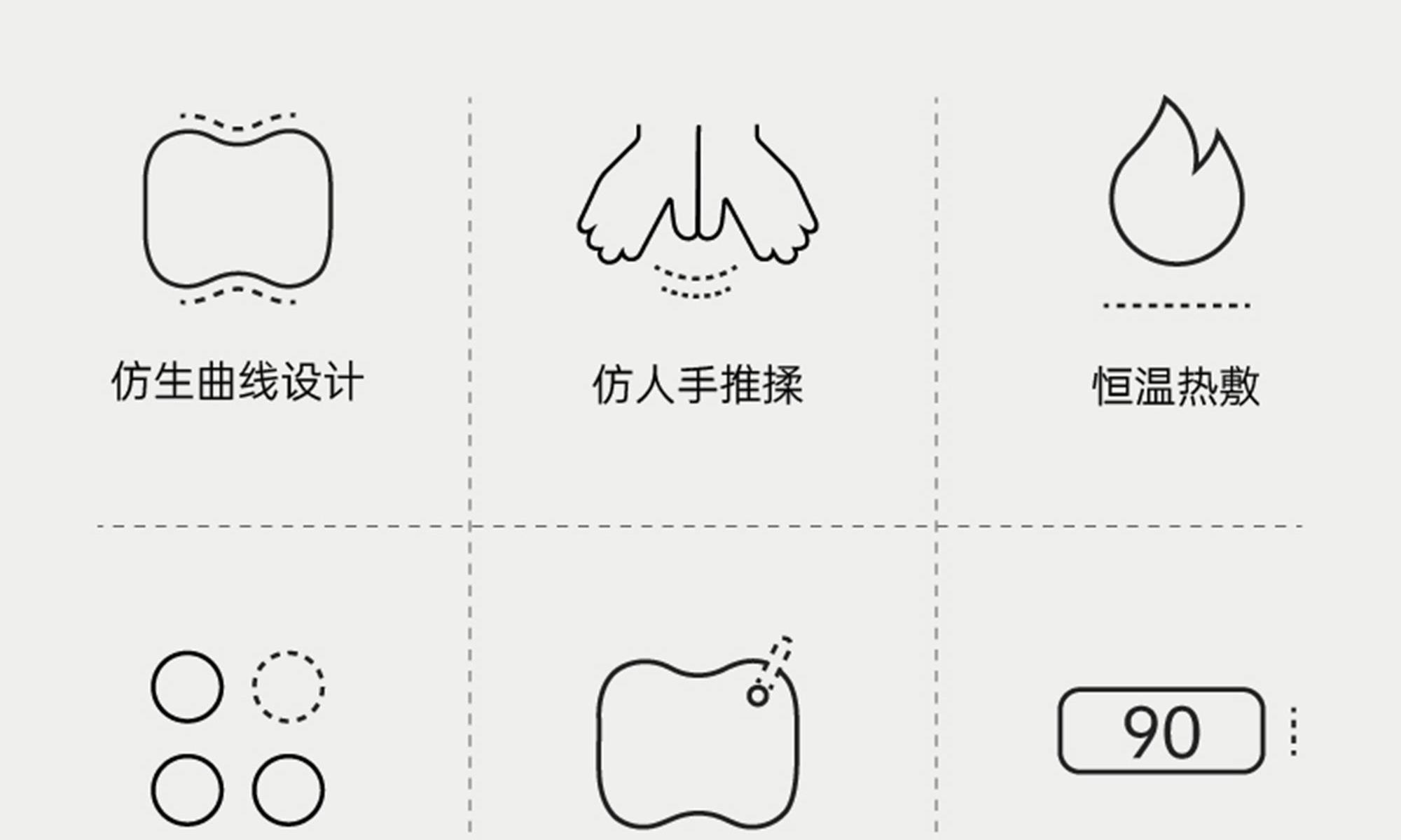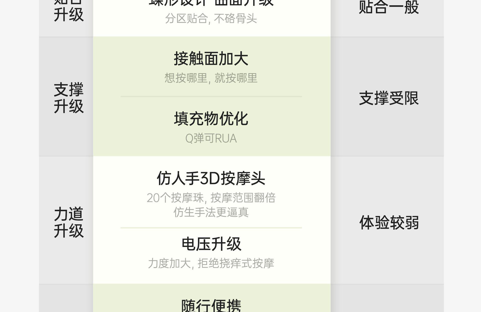 产品规格:310mm*250mm*120mm 产品净重:1.35kg 外箱毛重:2.1kg 外箱尺寸:335*262*119mm 包装方式:彩盒 产品颜色:苏格兰绿/向日葵黄 1、仿指腹按捏,体感舒适 2、体积小,便携利收纳 3、仿人手推揉技法 4、双人工曲线设计,贴合度更高 5、恒温热敷,帮助促进血液循环 6、Type-c充电口,无线使用,居家、办公、车载、出行多场景使用 7.噪音小,续航时间长