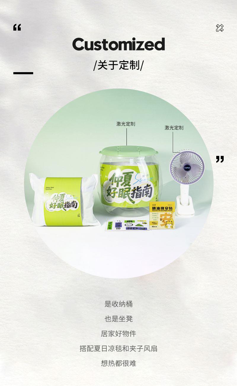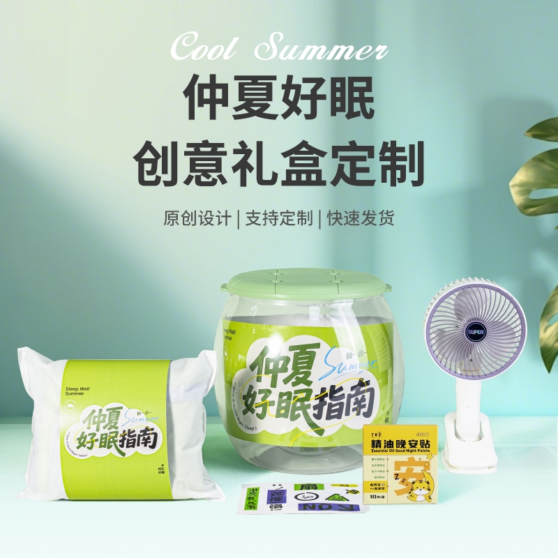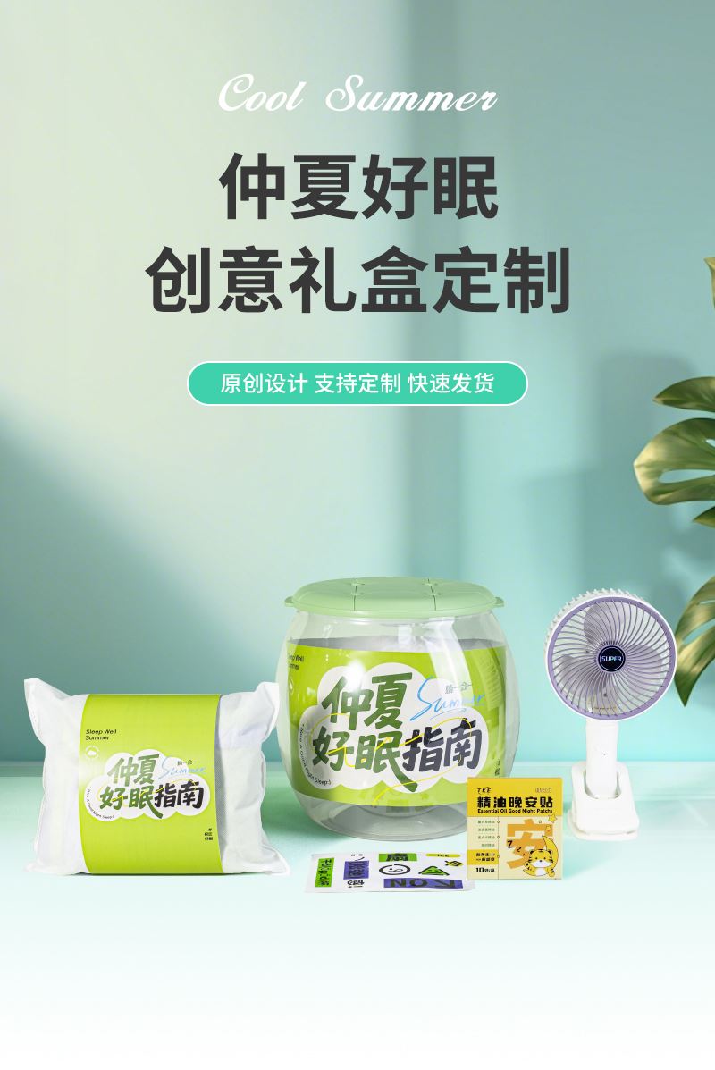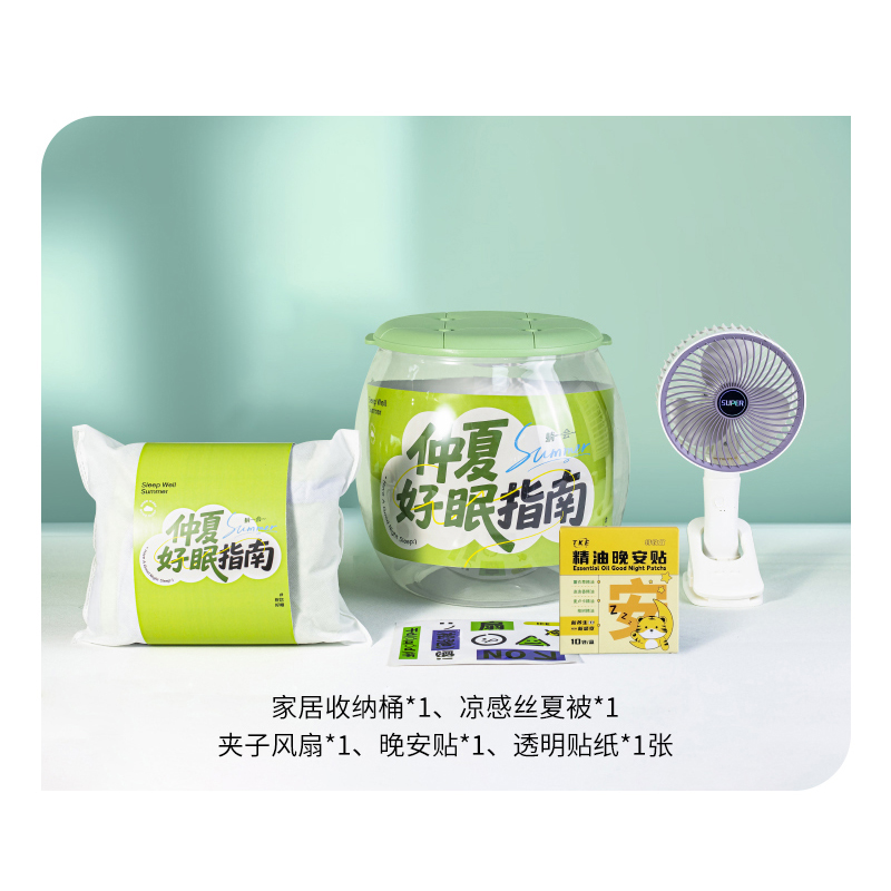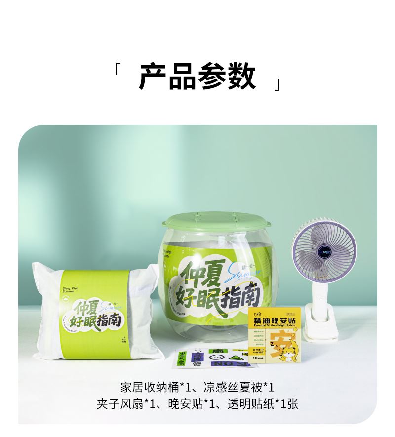 礼盒参数: 收纳桶尺寸:29.5*31*25cm 套装重量:1597g/套 详细介绍: 1.凉感夏凉被 面料成分:聚酯纤维(凉感纤维) 填充物成分:聚酯纤维(整张羽丝棉) 产品尺寸:100*150cm 2.夹子风扇 功能:360°旋转、可立、可夹、可手持 风速档位:三挡风速可调节 充电接口:type-c充电 电池类型:2000mah锂电池 3.精油晚安贴 规格:1贴/袋10袋/盒 尺寸:60*60MM 成分:薰衣草精油、迷迭香精油、麦卢卡精油、树桉精油等 4.趣味贴纸