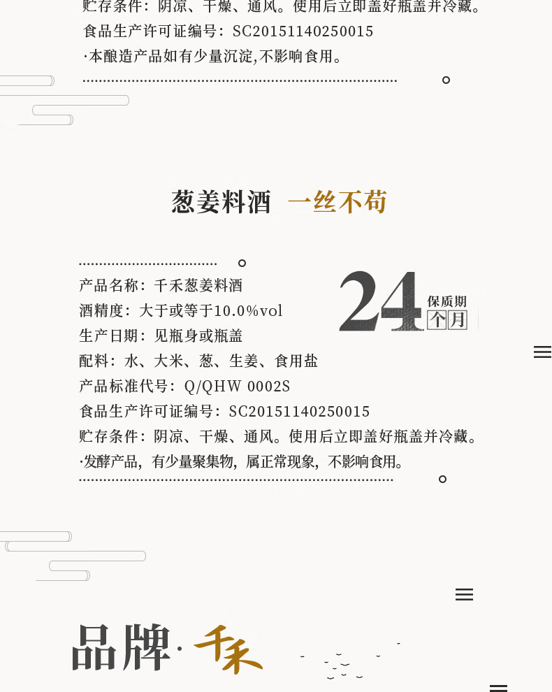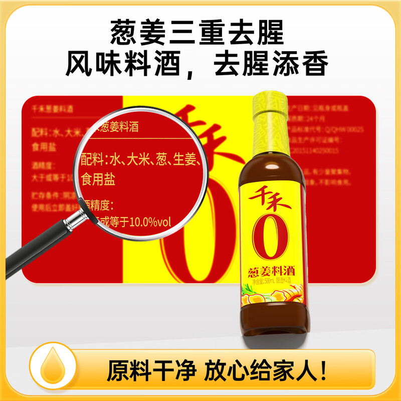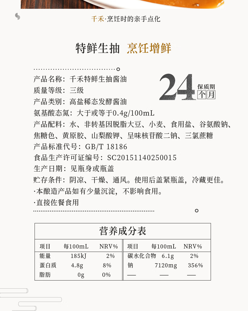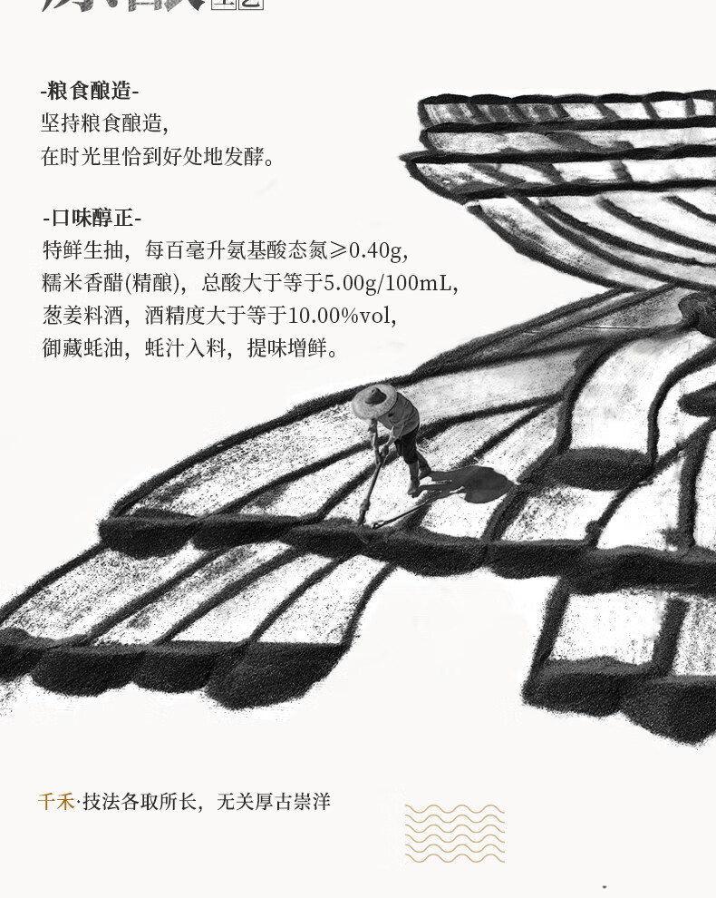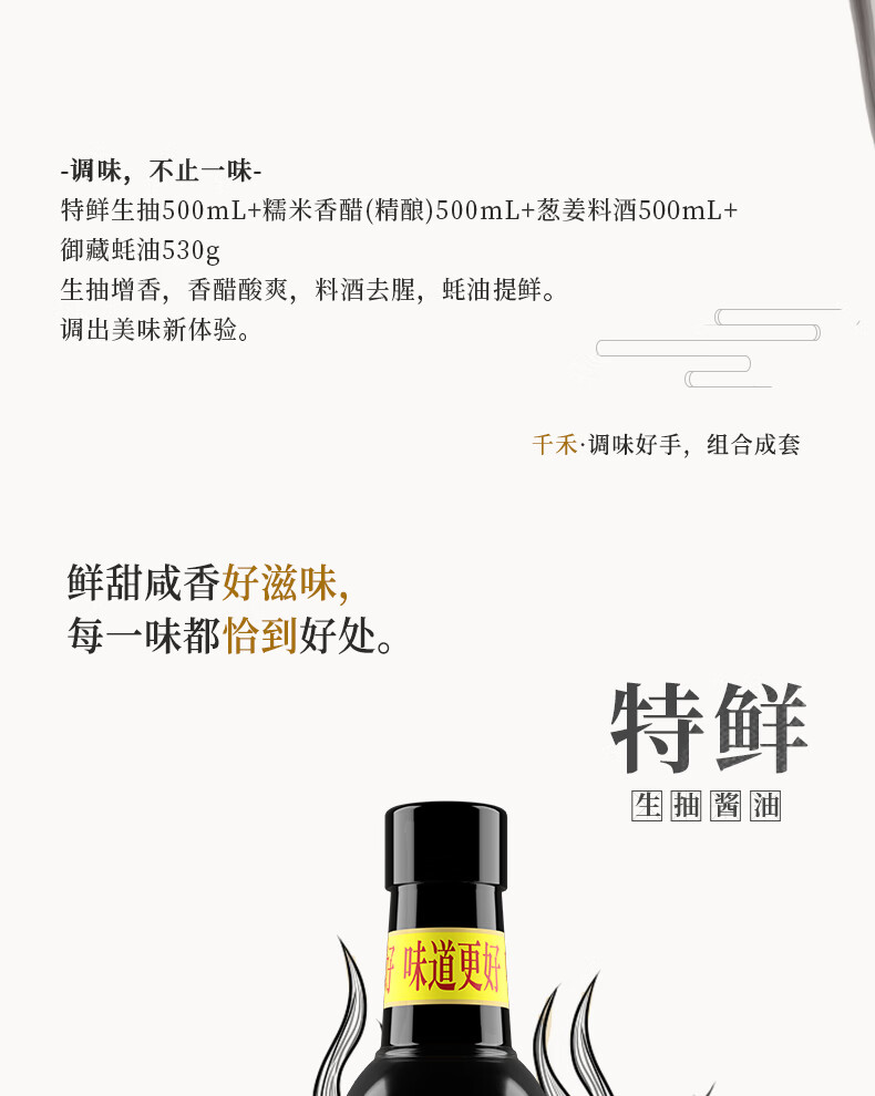 内配: 千禾特鲜生抽酿造酱油500ml 千禾零添加糯米香醋精酿500ml 千禾零添加葱姜料酒500ml 千禾御藏蚝油12%510g