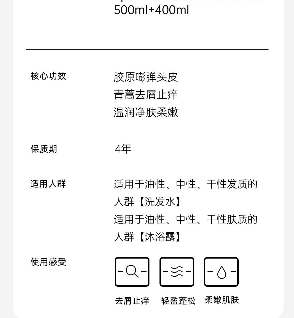 Spēs诗裴丝胶原青蒿洗沐套装(500ml+400ml) 核心功效: 胶原嘭弹头皮 青蒿去屑止痒 温润净肤柔嫩 适用人群 适用于油性、中性、干性发质的 产品卖点: 去屑止痒 轻盈蓬松 柔嫩肌肤