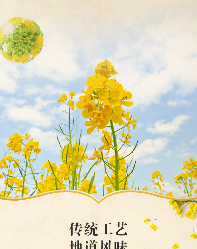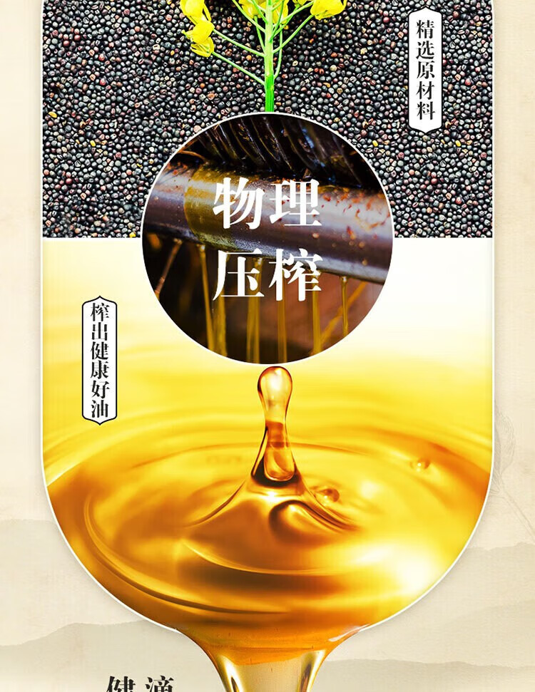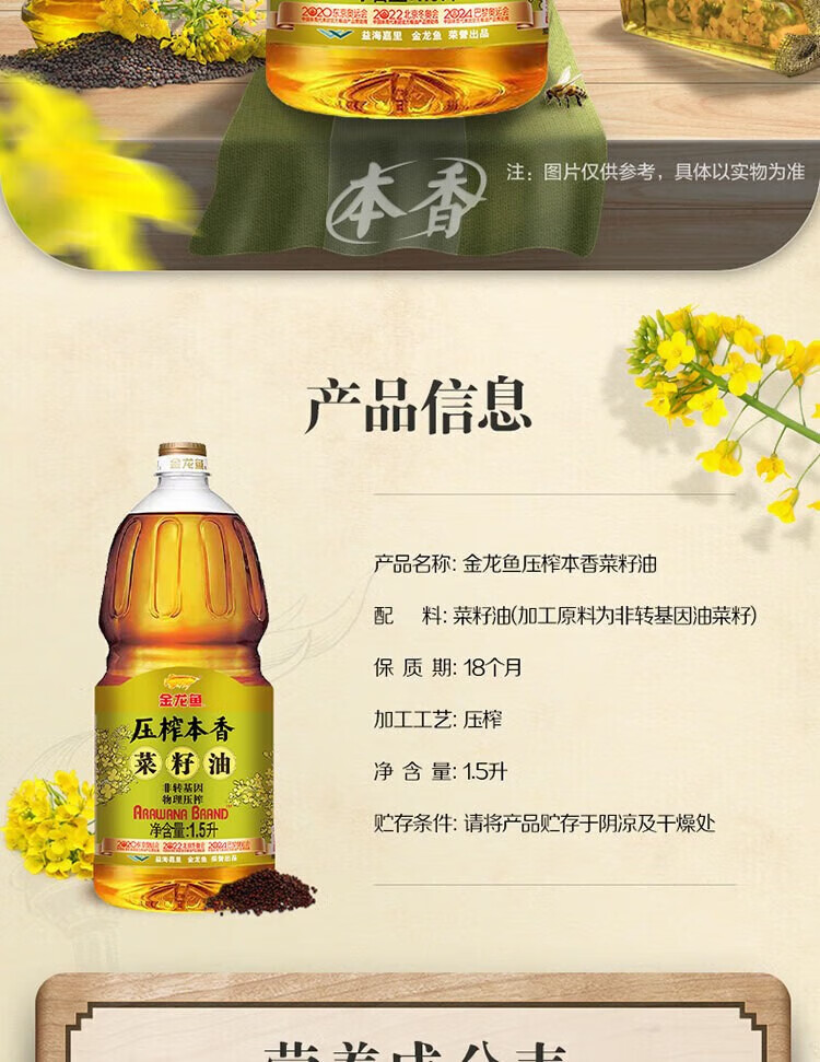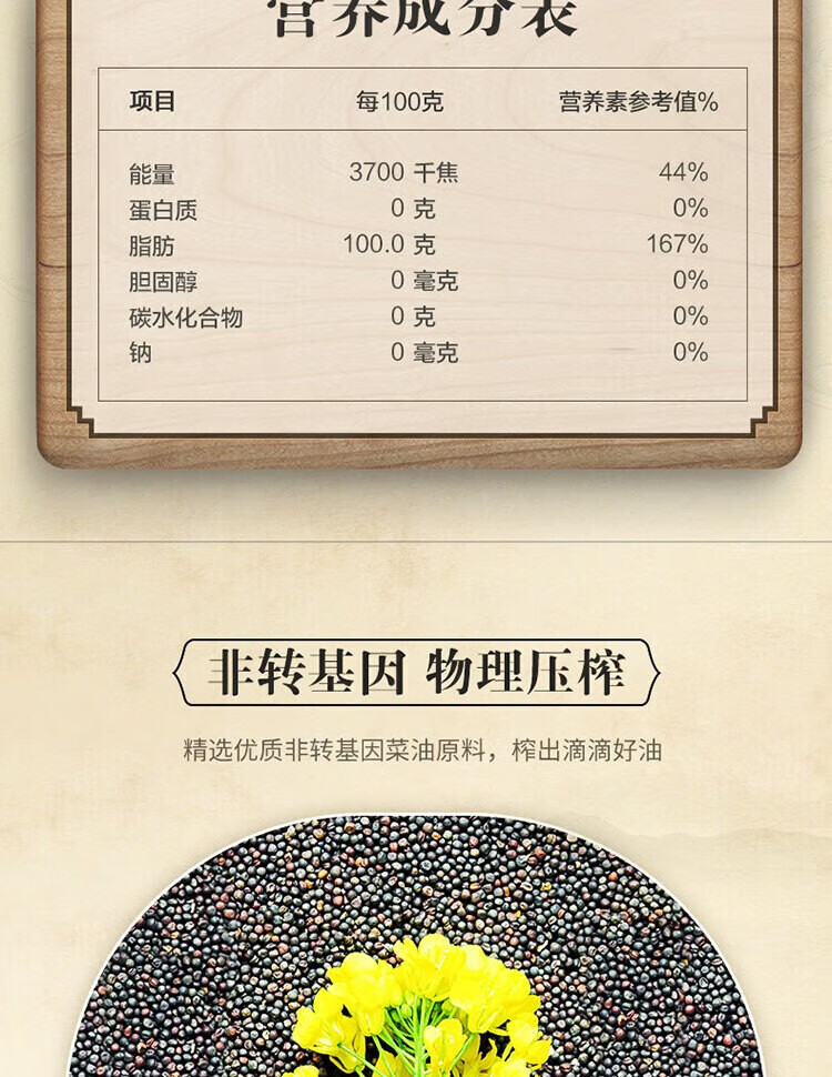 配料:菜籽油(加工原料为非转基因油菜籽) 保质期:18个月 加工工艺:压榨 净含量:1.5升 贮存条件:请将产品贮存于阴凉及干燥处