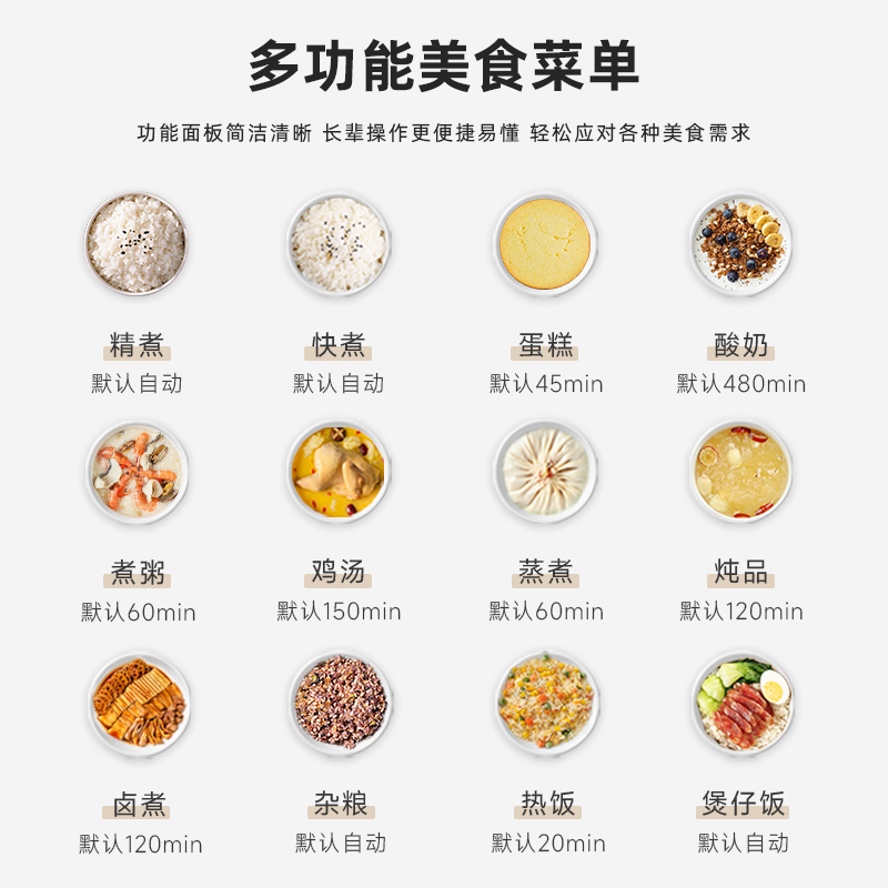 额定功率:400W 额定容量:2.0L 精致小容量 IMD大彩屏操作界面、方形独特设计 陶瓷油不粘内胆、12小时智能预约功能 14大功能菜单 包装方式: 彩包+邮购箱