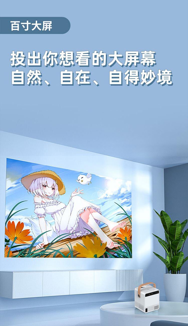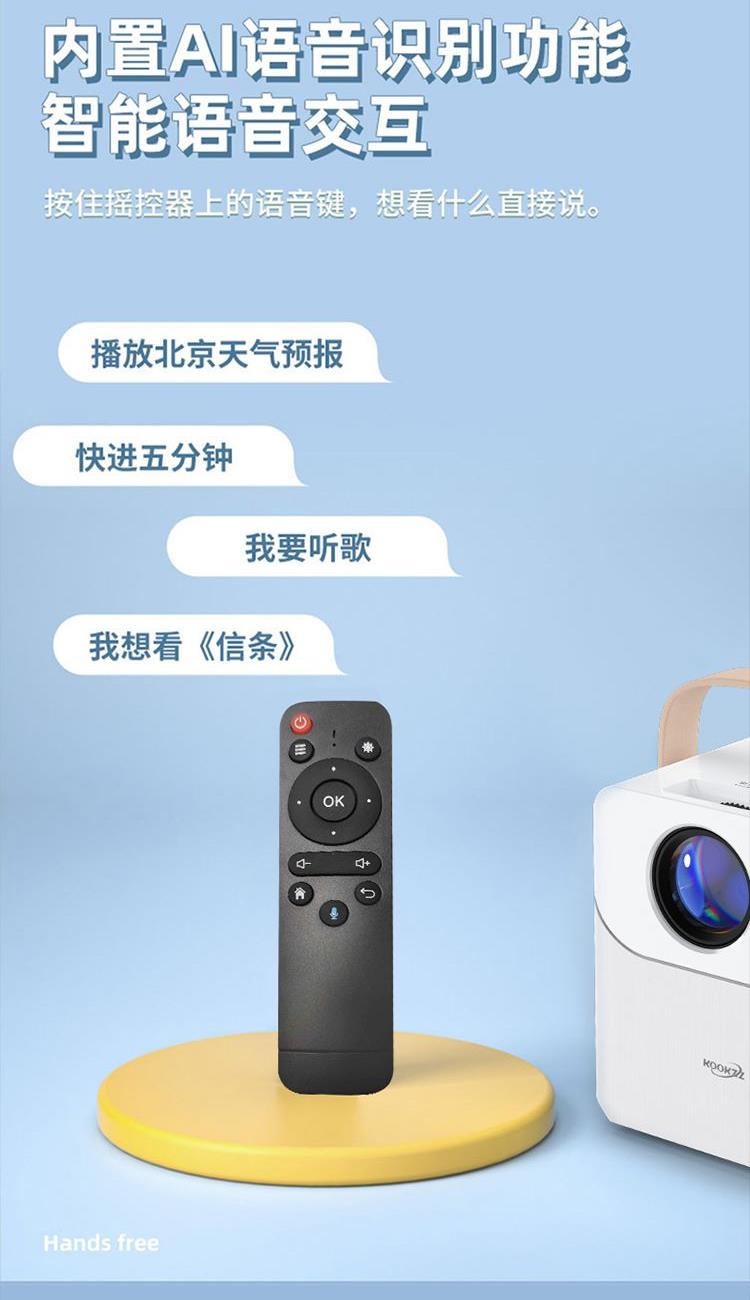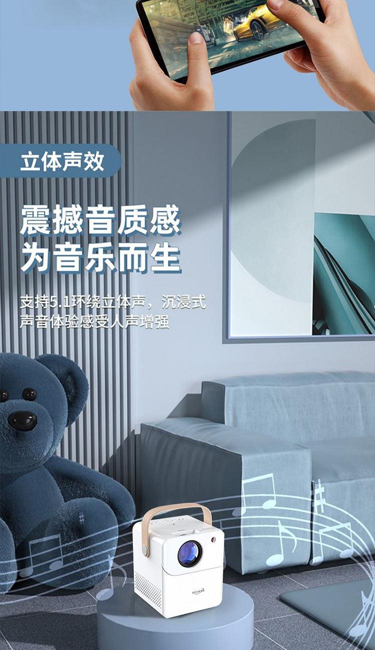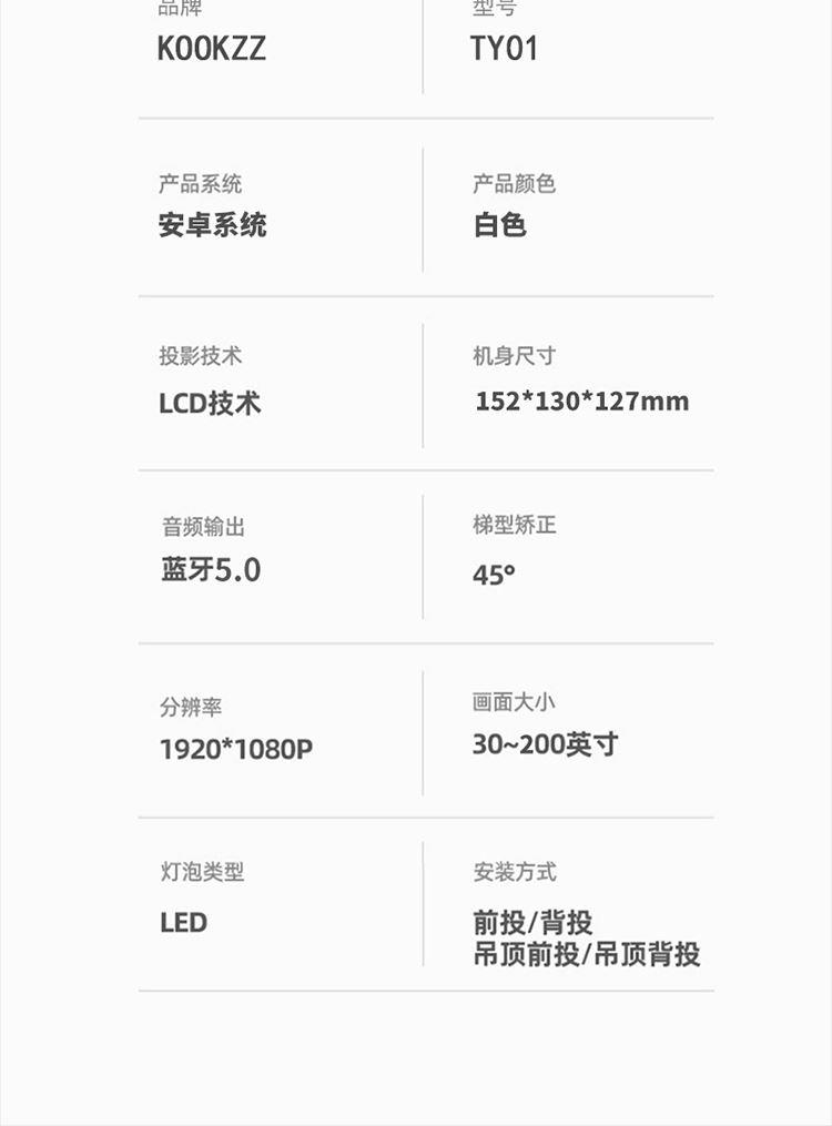 型 号 :TY01 颜 色:白色 扬声器: 3W*2 系统版本:安卓语音版 蓝 牙:5.0 投影技术:3.5“LCD显示 投影比:16:9 支持高分辨率:1920*1080P 梯形矫正:支持 亮度: 120ANSI Lumens 对比度:2000:1 投影尺寸:30-200英寸 一箱 :12/件 输入电压:110V-240V(±10%) 产品尺寸:152*130*127mm Ai智能控制系统,老人孩子都可操作 支持侧投四点梯形矫正,护眼模式,随心摆放更灵活 支持苹果安卓手机同屏/投屏,内置安卓系统海量影片可在线观看,便携设计,携带无负担,支持1080高清播放,内置独立音箱,多种设备链接,手机/平板/U盘/移动硬盘/网络盒子等,漫反射原理,呵护眼睛健康
