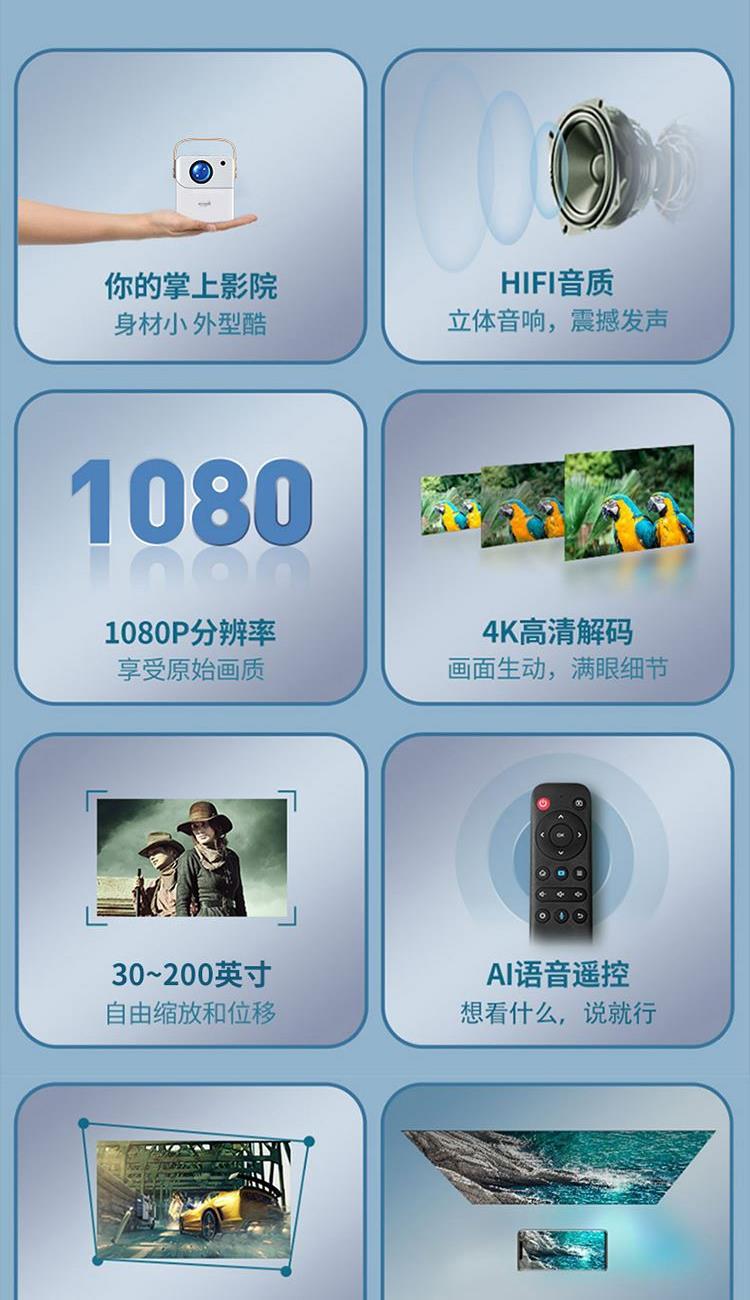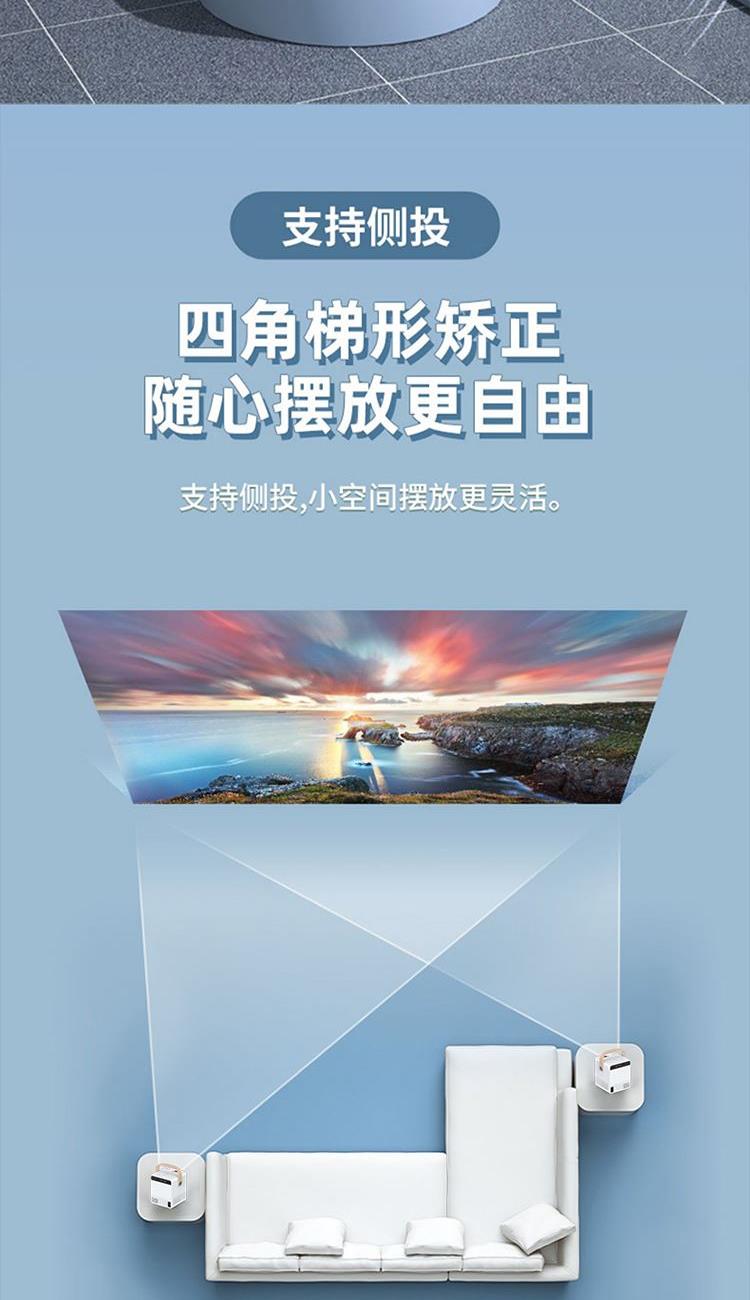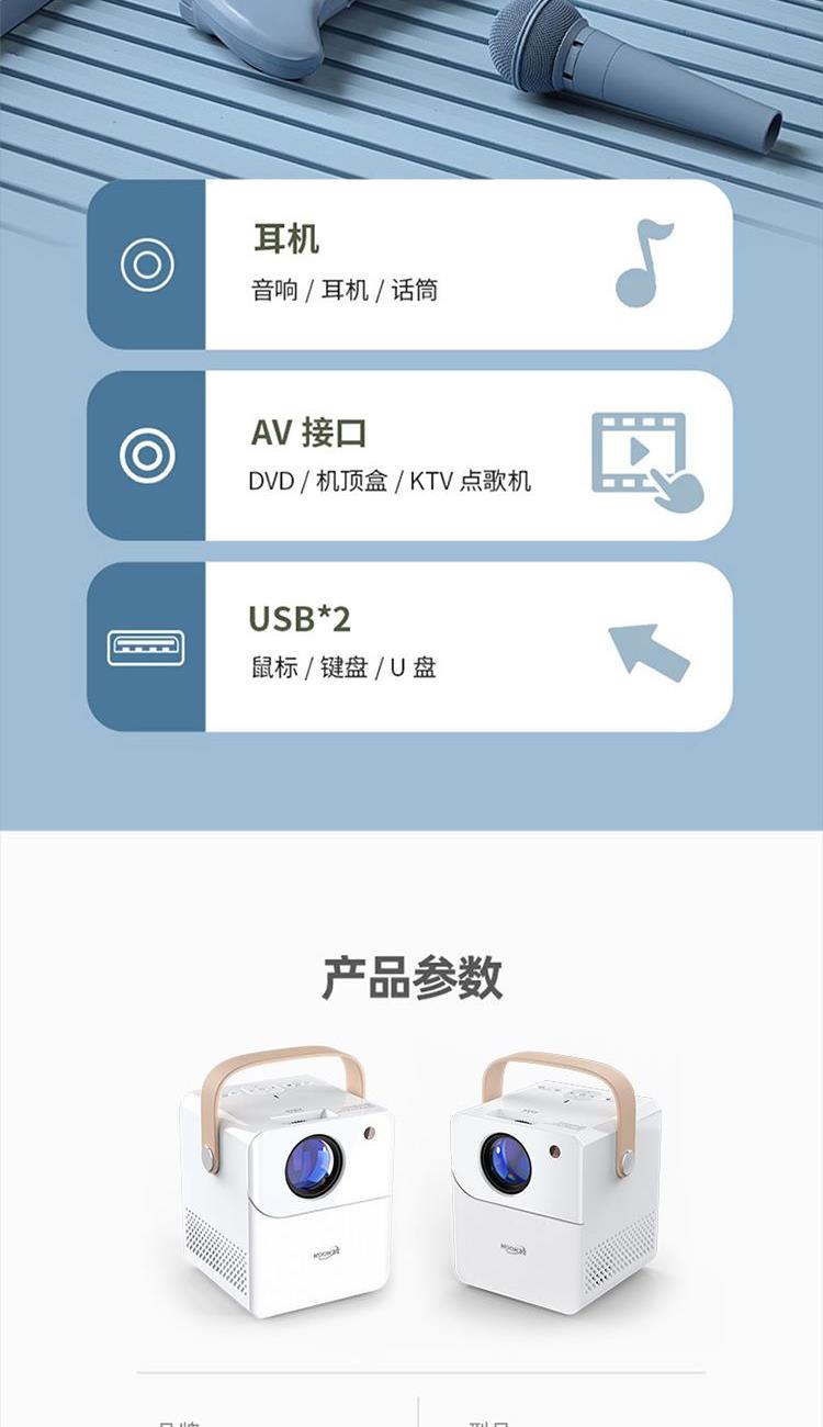 型 号 :TY01 颜 色:白色 扬声器: 3W*2 系统版本:安卓语音版 蓝 牙:5.0 投影技术:3.5“LCD显示 投影比:16:9 支持高分辨率:1920*1080P 梯形矫正:支持 亮度: 120ANSI Lumens 对比度:2000:1 投影尺寸:30-200英寸 一箱 :12/件 输入电压:110V-240V(±10%) 产品尺寸:152*130*127mm Ai智能控制系统,老人孩子都可操作 支持侧投四点梯形矫正,护眼模式,随心摆放更灵活 支持苹果安卓手机同屏/投屏,内置安卓系统海量影片可在线观看,便携设计,携带无负担,支持1080高清播放,内置独立音箱,多种设备链接,手机/平板/U盘/移动硬盘/网络盒子等,漫反射原理,呵护眼睛健康