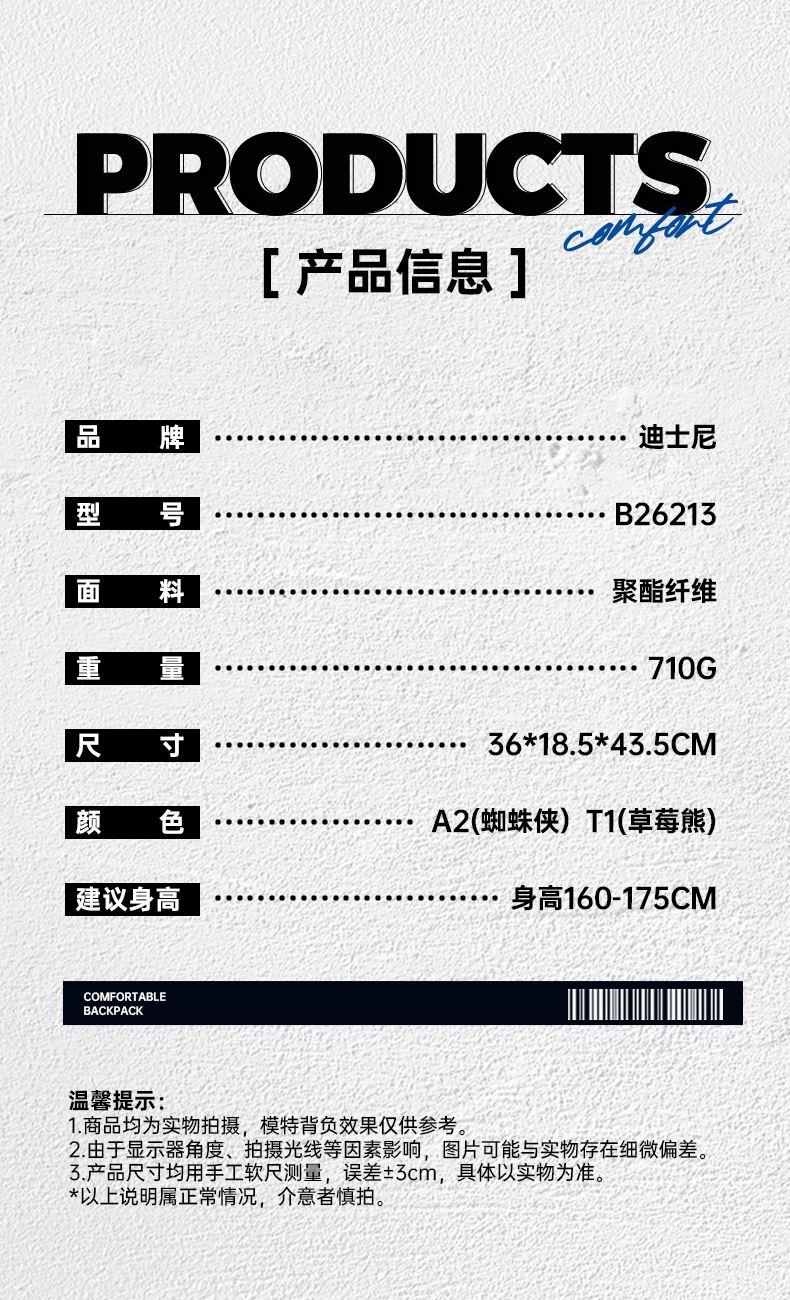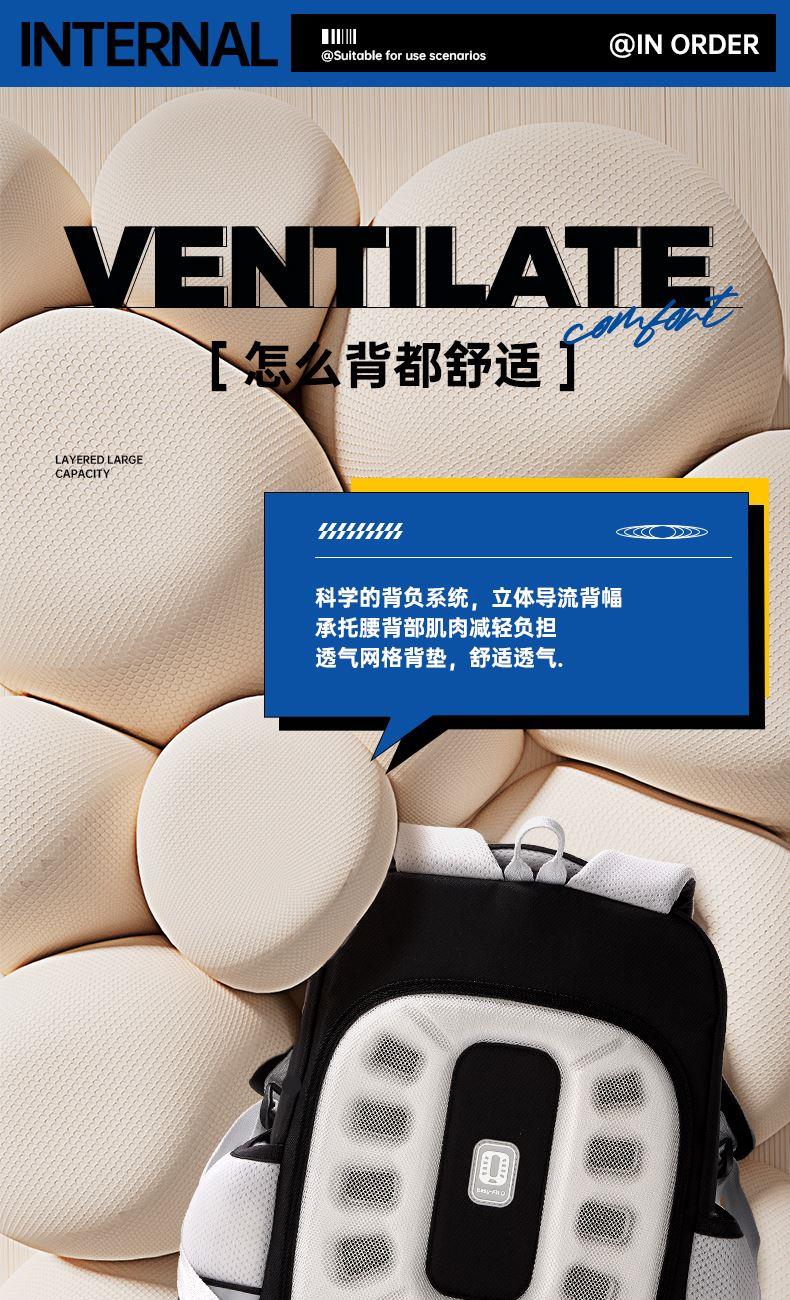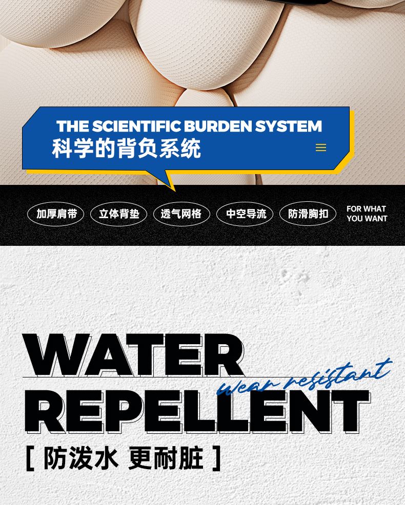 材质:聚酯纤维 尺寸:36*18.5*43.5CM 建议身高:160-175CM 卖点: ①分层大容量设计满足,内部空间大,科学分层便于分类存放和快速找到所需物品 ②科学的背负系统,立体导流背幅承托腰背部肌肉减轻负担透气网格背垫,舒适透气 ③加厚肩带、立体背垫、透气网格、中空导流、防滑胸扣 ④人性化反光条设计,夜晚出行更安全放心 ⑤独特的材料拼接设计赋予它一种沉稳、低调而又时尚的气质能够展现使用者的个性和品味