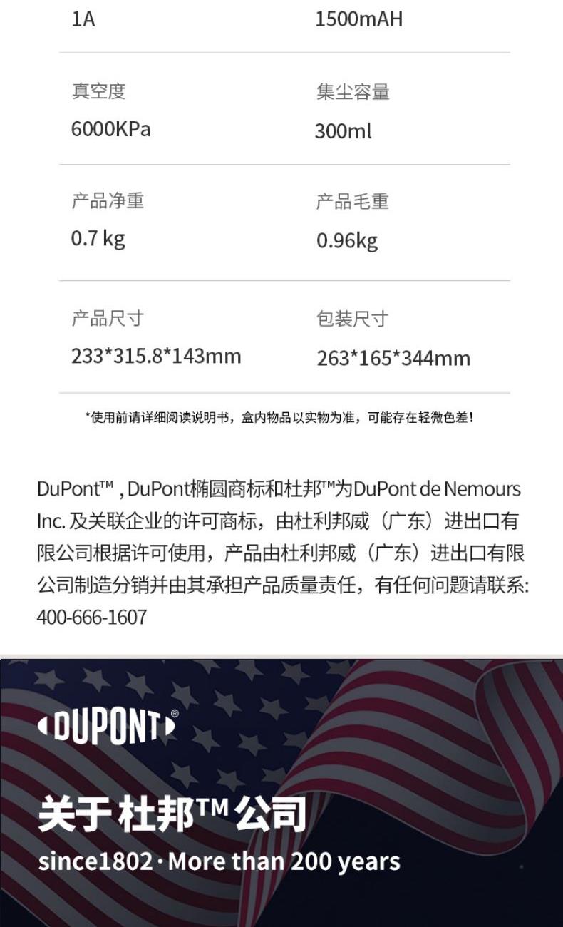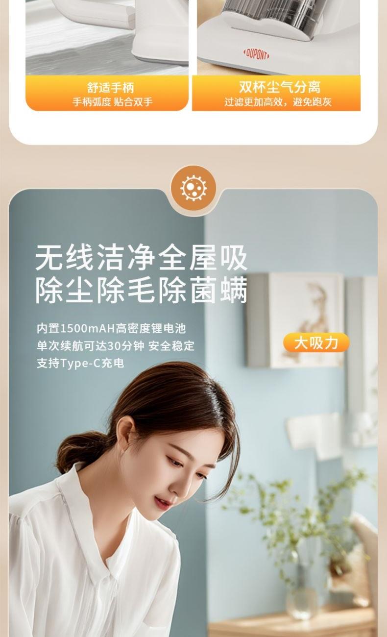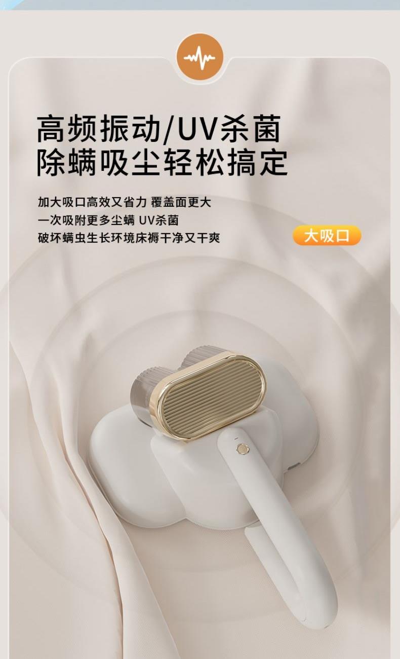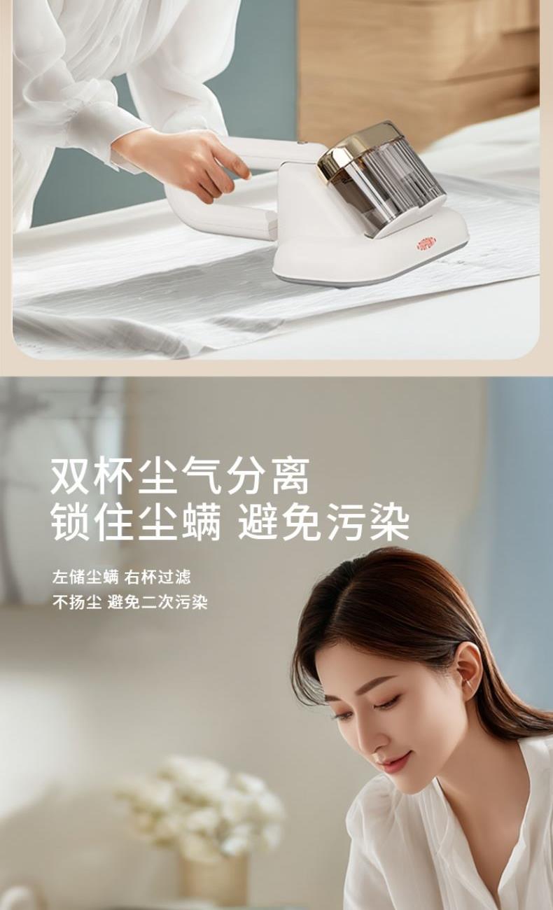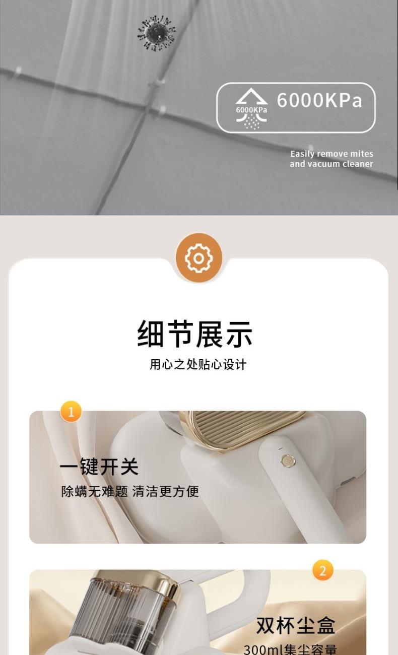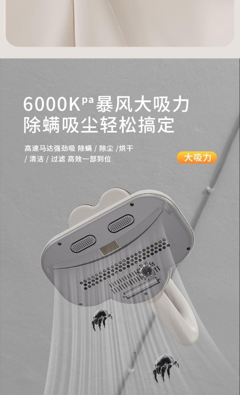 产 品 材 质:ABS 额 定 功 率:150W 输 入 电 压:DC7.4V 输 入 电 流:1A 产 品 净 重:0.7 kg 产 品 毛 重:0.96kg 电 池 容 量:1500mAH 真 空 度:6000KPa 集 尘 容 量:300ml 产 品 尺 寸:233*315.8*143mm 包 装 尺 寸:263*165*344mm 箱 规 尺 寸:720*365*560mm 装 箱 数:8台/箱 无线大吸力,强拍打真除螨,便捷随手吸,全屋除螨自由。 没“螨”生活,一台无线除螨仪搞定,除螨 / 除尘 /烘干 / 清洁 / 过滤,高效一部到位。 暴风大吸力,尘螨瞬吸无影,大动力马达强劲吸附尘螨和过敏原 高频振动,震出更多尘螨,加大吸口高效又省力,覆盖面更大,一次吸附更多尘螨。 热风烘干,如新床般干净,烘干水分,破坏螨虫生长环境,床褥干净又干爽。 一键启动,除螨无难题,清洁更方便。 内置1500mAH高密度锂电池,单次续航可达30分钟,安全稳定,支持Type-C充电。 双杯尘盒设计,容量高达300ml,尘螨分离。