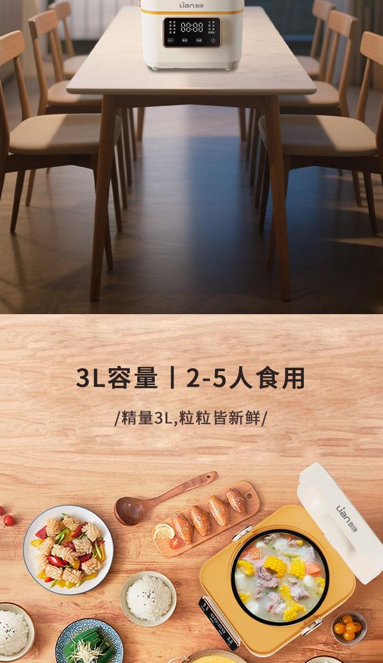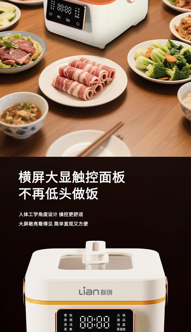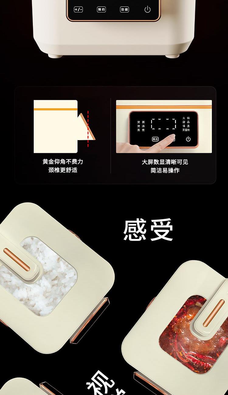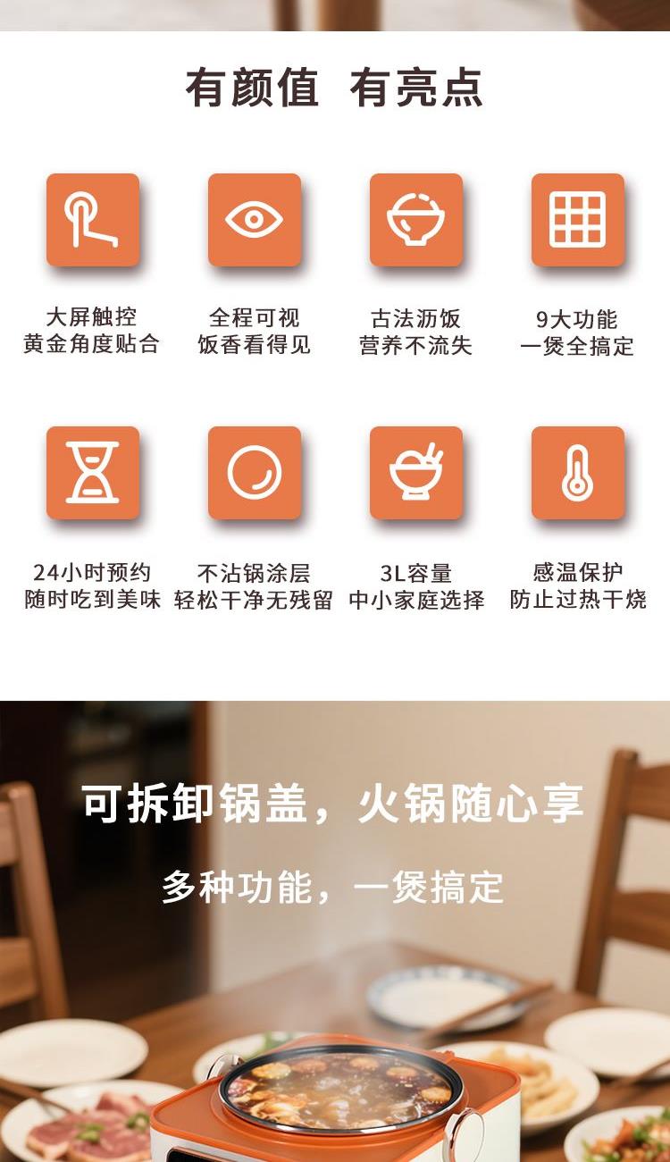 产品参数 额定电压:220V~ 额定频率:50Hz 电热功率:700W 额定容量:3L 产品净重:2.3kg 产品毛重:2.7kg 彩盒尺寸:345X286X237mm 外箱尺寸:592X360X494mm 产品特点 1、黄金仰角横屏大数码显示触控面板; 2、创新高颜值可视上盖,实时查看烹饪状态; 3、锅盖采用旋钮把手方式开合,锅、盖分离即可享受 火锅带来的欢乐; 4、3L精巧容量,满足全家需求; 5、24小时智能预约功能。