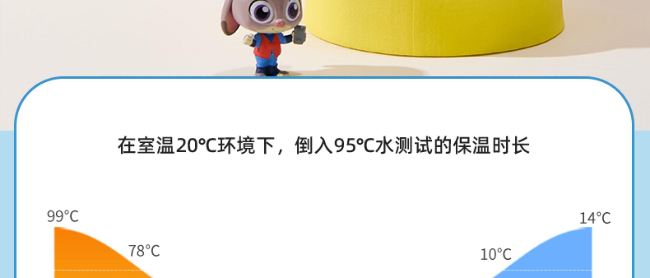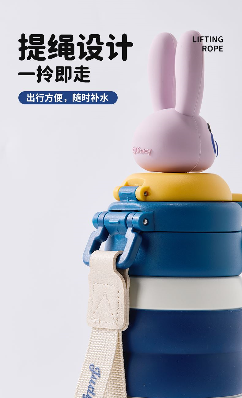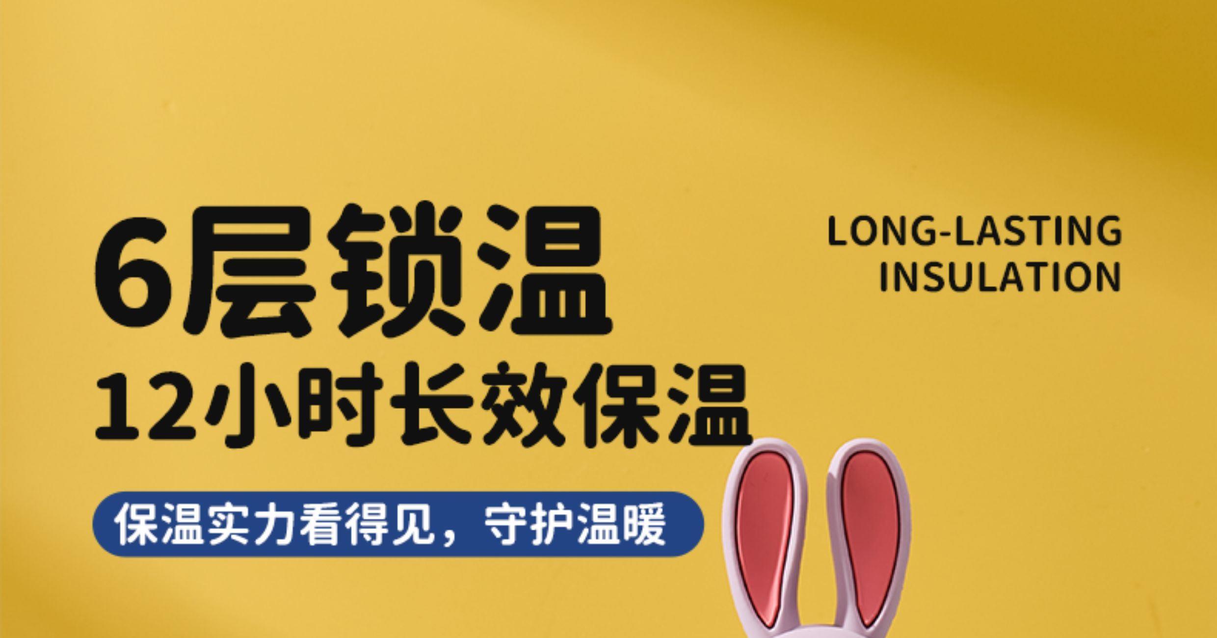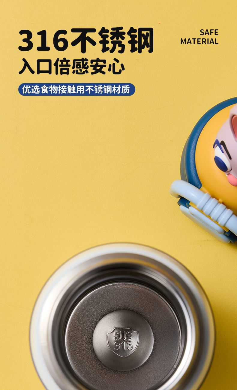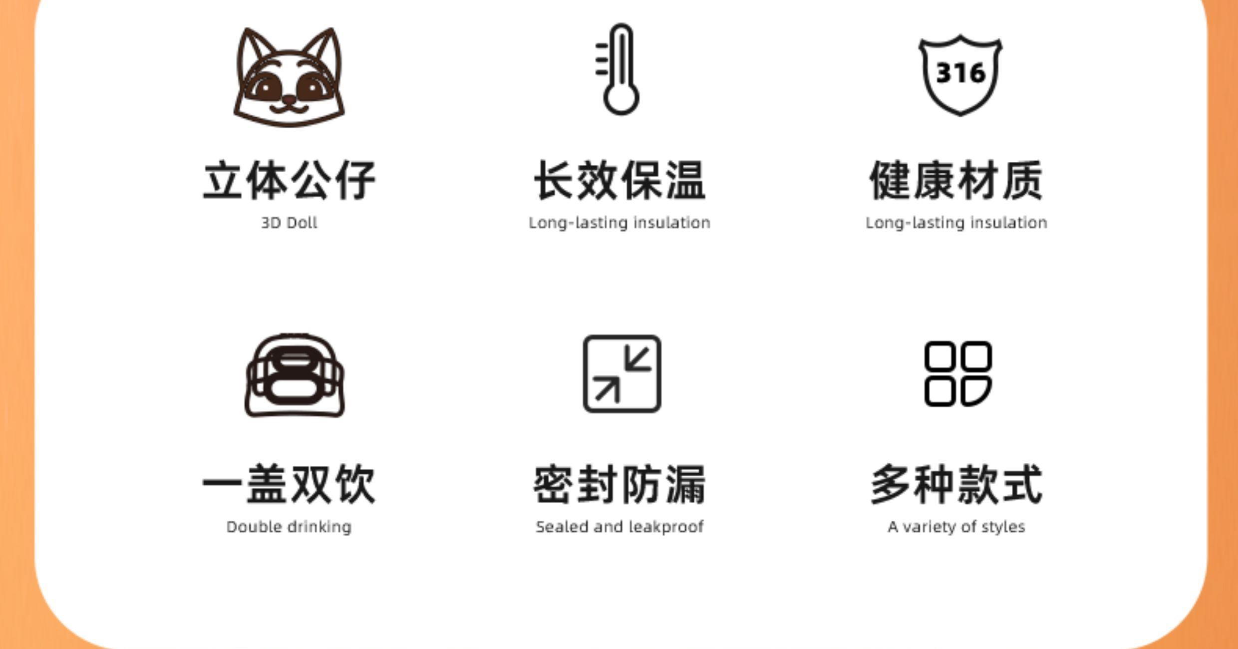 容量:480ml 尺寸:7.2*7.2*28CM 材质:PP、硅橡胶、内胆:316材质 卖点: ①一盖双饮,吸管&直饮不设限 ②密封锁扣,防止误触 ③6层锁温,12小时长效护航 ④316不锈钢入口倍感安心,优选食物接触用不锈钢材质 ⑤提绳设计一拎即走出行方便 ⑥防滑硅胶圈、立体公仔、防滑杯垫