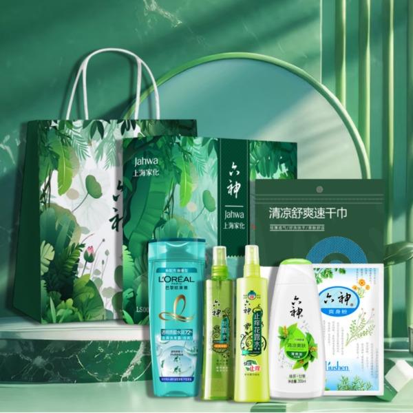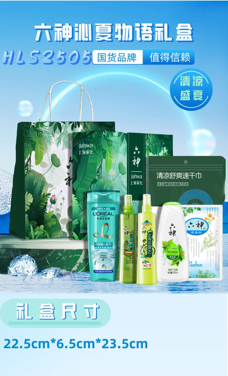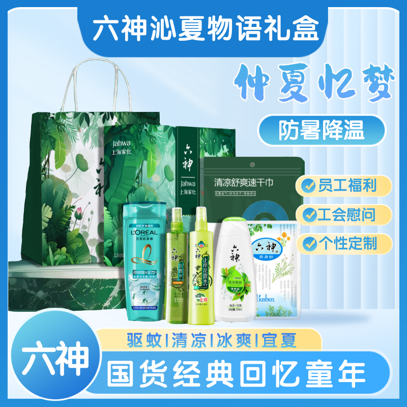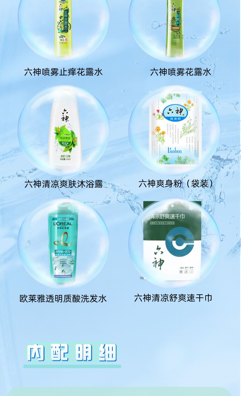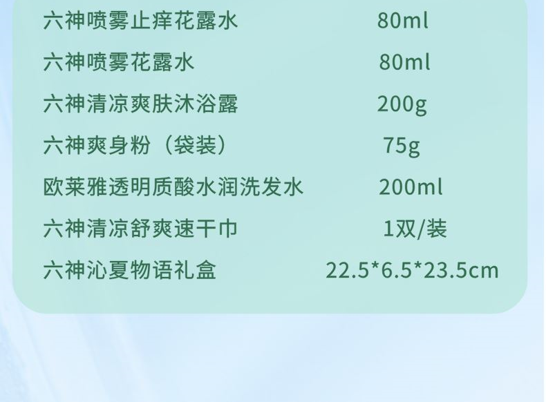 套装配置: 六神喷雾止痒花露水80ml 六神喷雾花露水80ml 六神清凉爽肤沐浴露200g 六神爽身粉(袋装)75g 欧莱雅透明质酸水润洗发水200ml 六神清凉舒爽速干巾1双/装 六神沁夏物语礼盒 礼盒重量:891g 礼盒尺寸:22.5*6.5*23.5cm