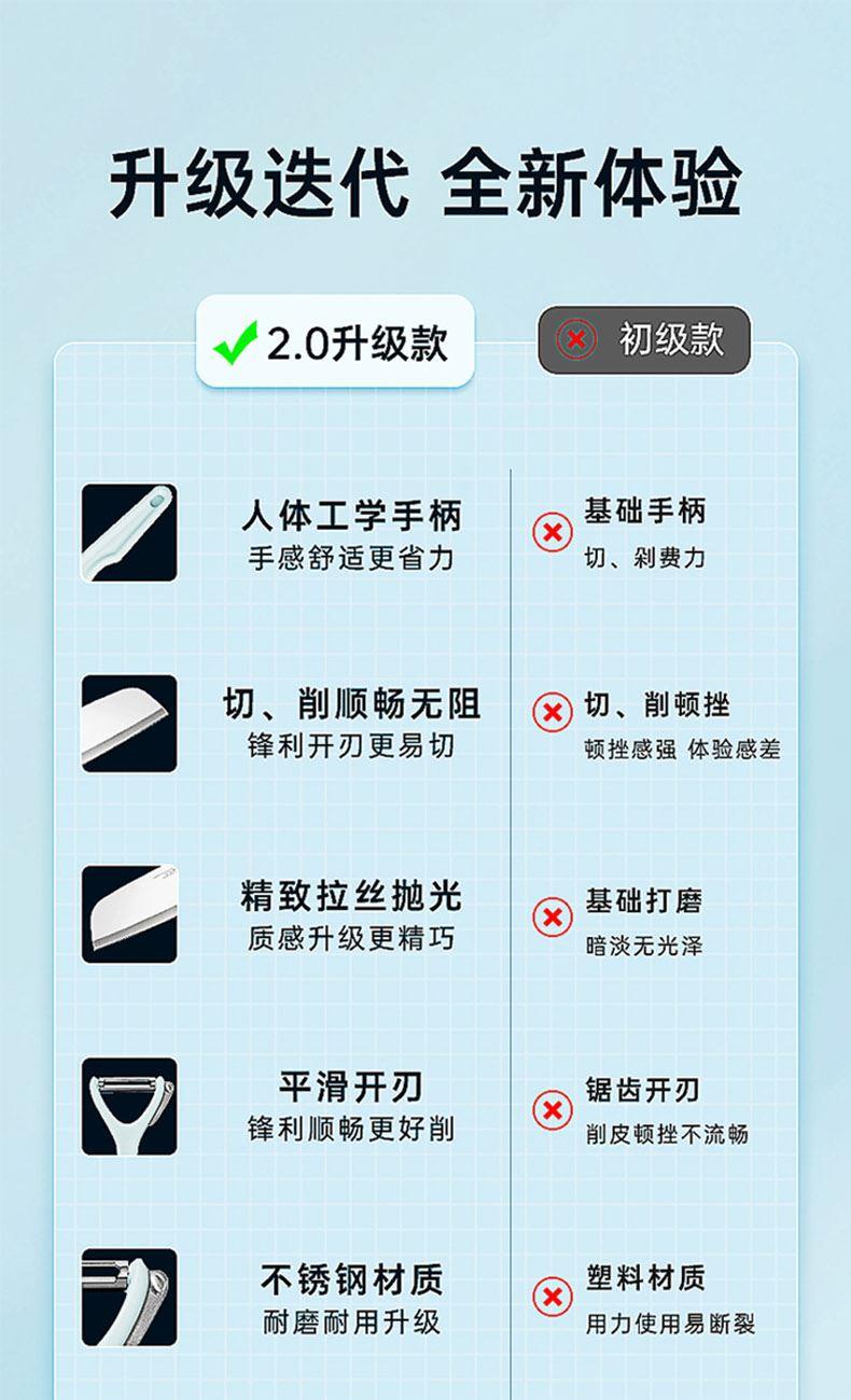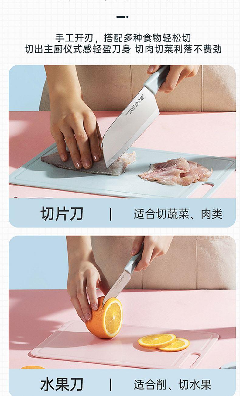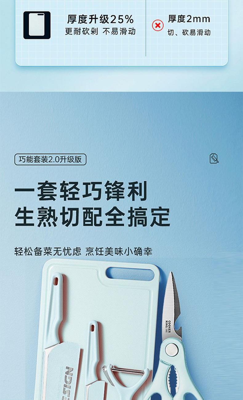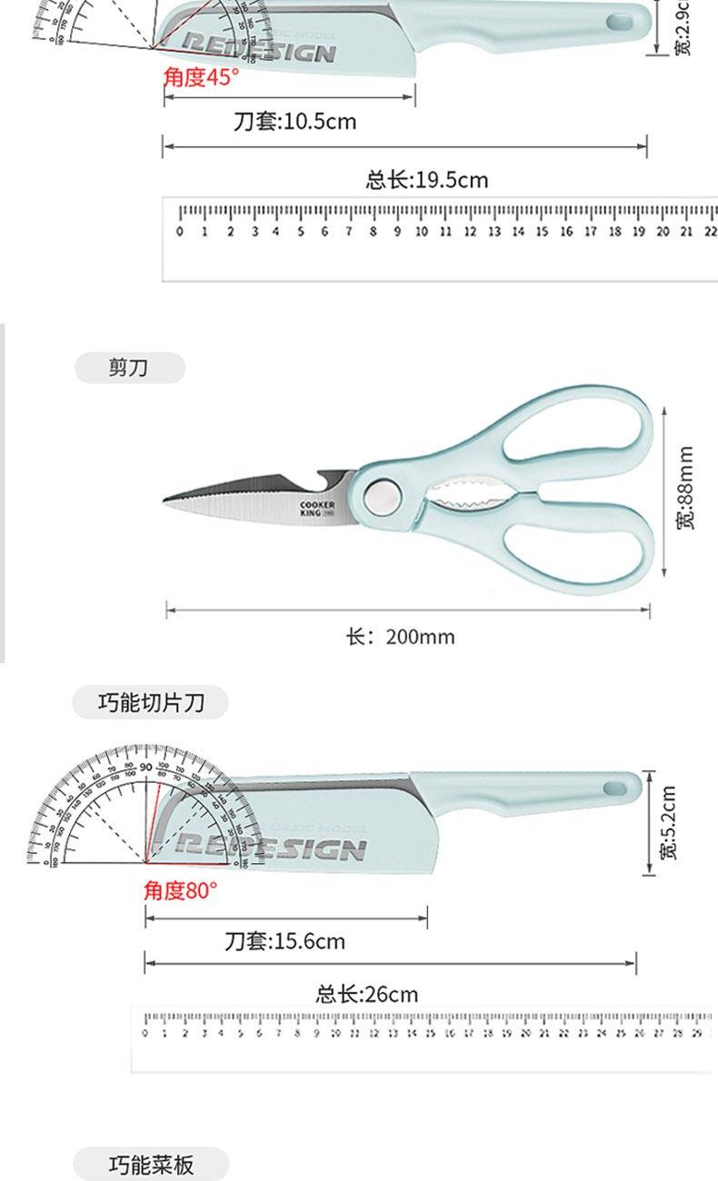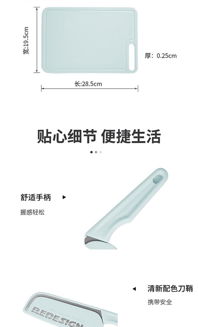 规格:削皮刀:127*72、水果刀:105*29、剪刀:200*88、切片刀:260*520、砧板:285*195*25 材质:PP+不锈钢+3cr13 产品重量:0.3KG 材质:PP+不锈钢+3cr13 特点:刮到底不伤果肉、快速锋利、软硬皆可削、手工开刃,搭配多种食物轻松切