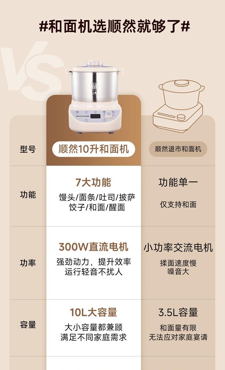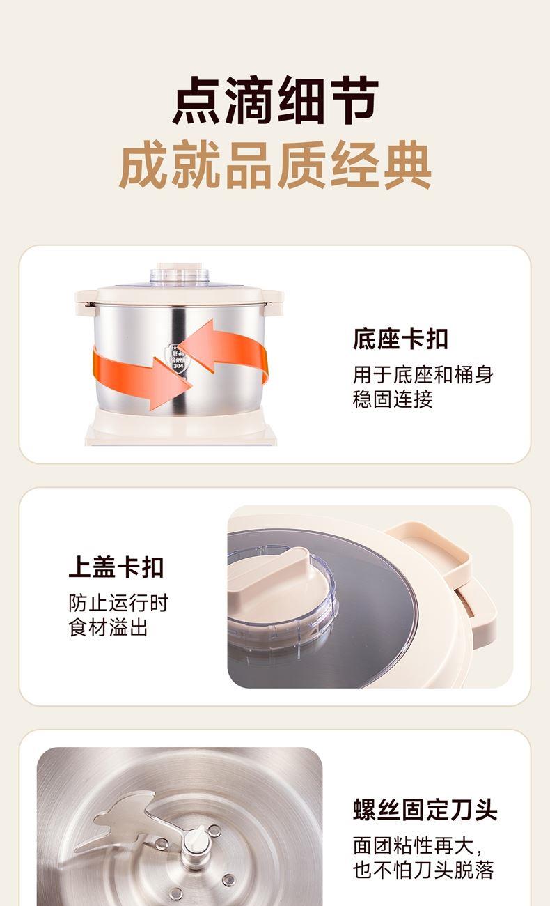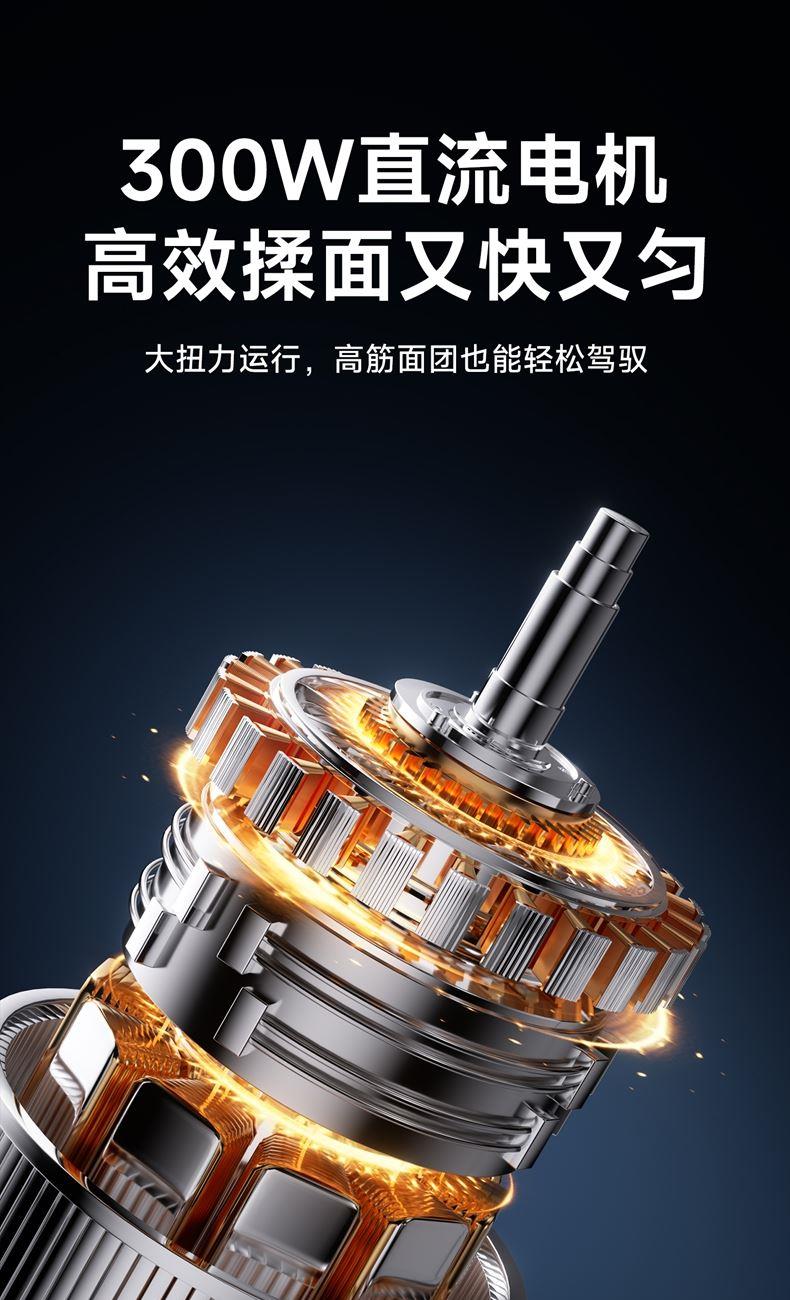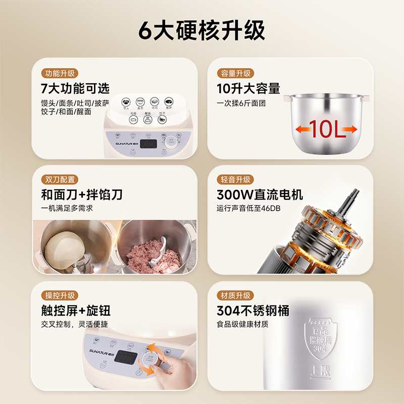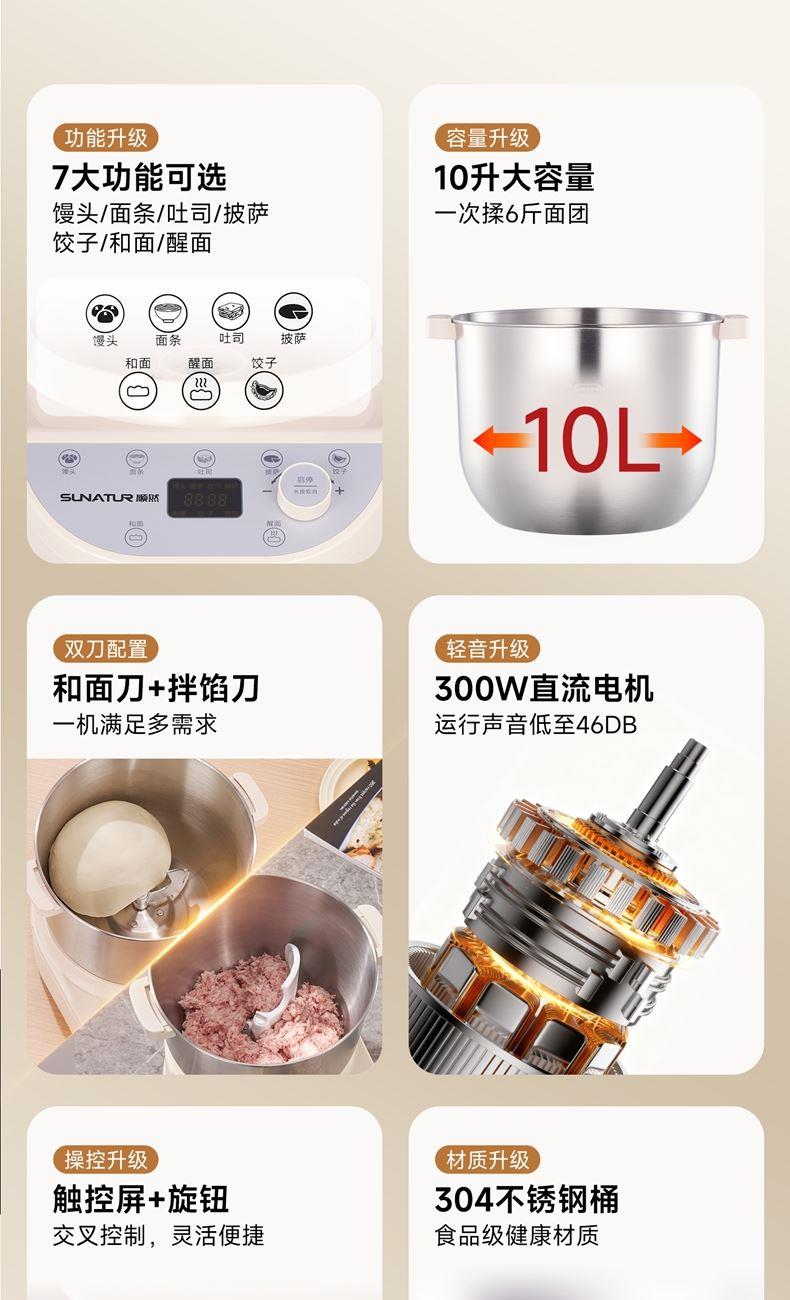 10升容量具备全自动和面、发酵、醒面功能、搅拌肉馅等;带有304 不锈钢和面桶; 300W直流电机,轻音设计,带有微电脑定时功能,智能揉面 + 恒温醒面; 7档调速,旋钮 + 触控双操控,7大功能可选,双刀配置,透明投料口;