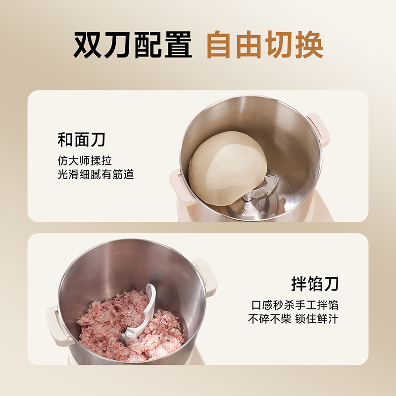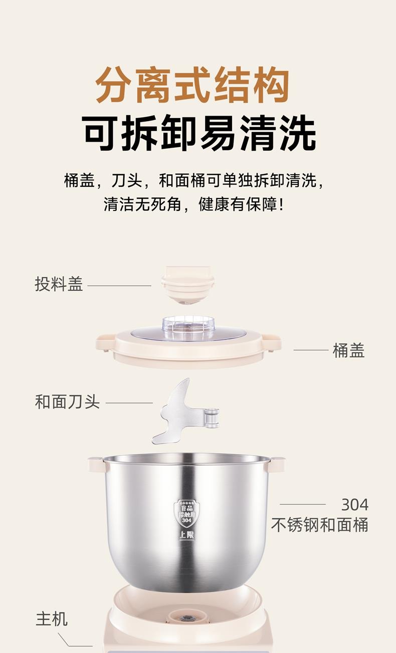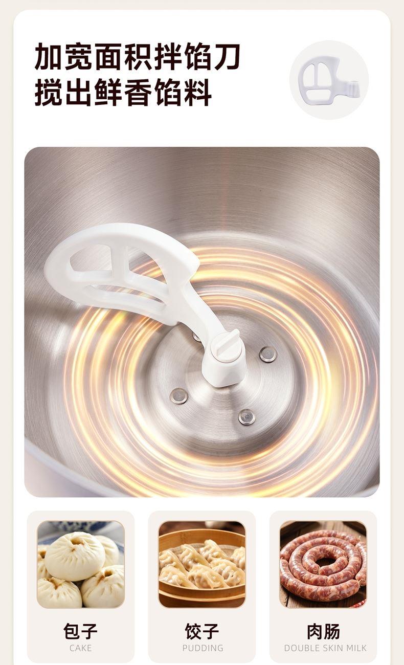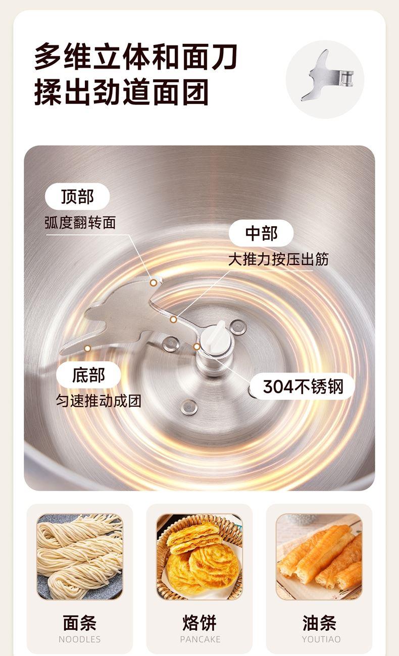 10升容量具备全自动和面、发酵、醒面功能、搅拌肉馅等;带有304 不锈钢和面桶; 300W直流电机,轻音设计,带有微电脑定时功能,智能揉面 + 恒温醒面; 7档调速,旋钮 + 触控双操控,7大功能可选,双刀配置,透明投料口;