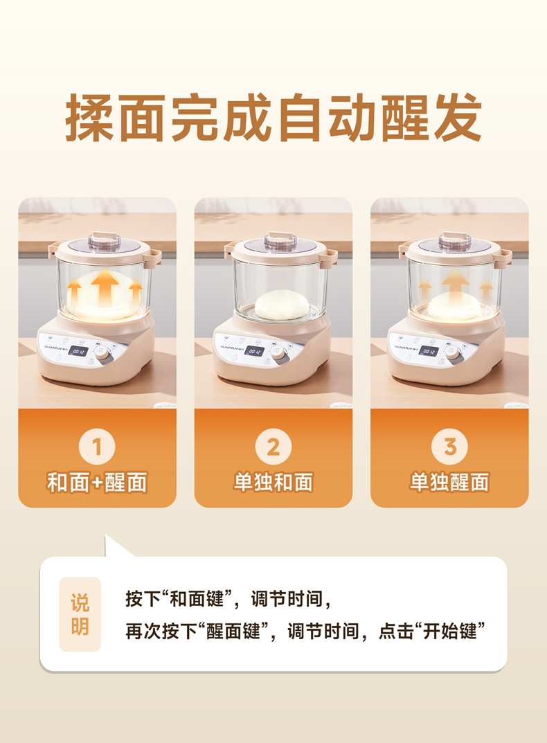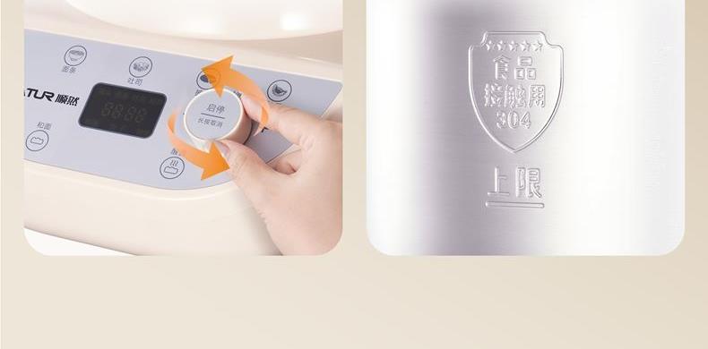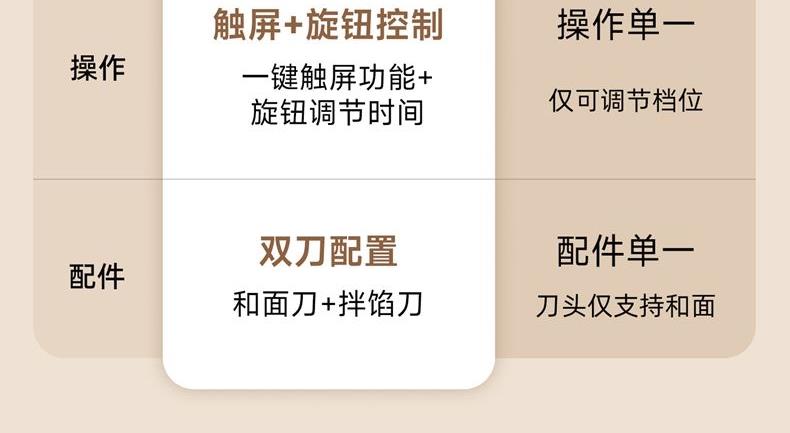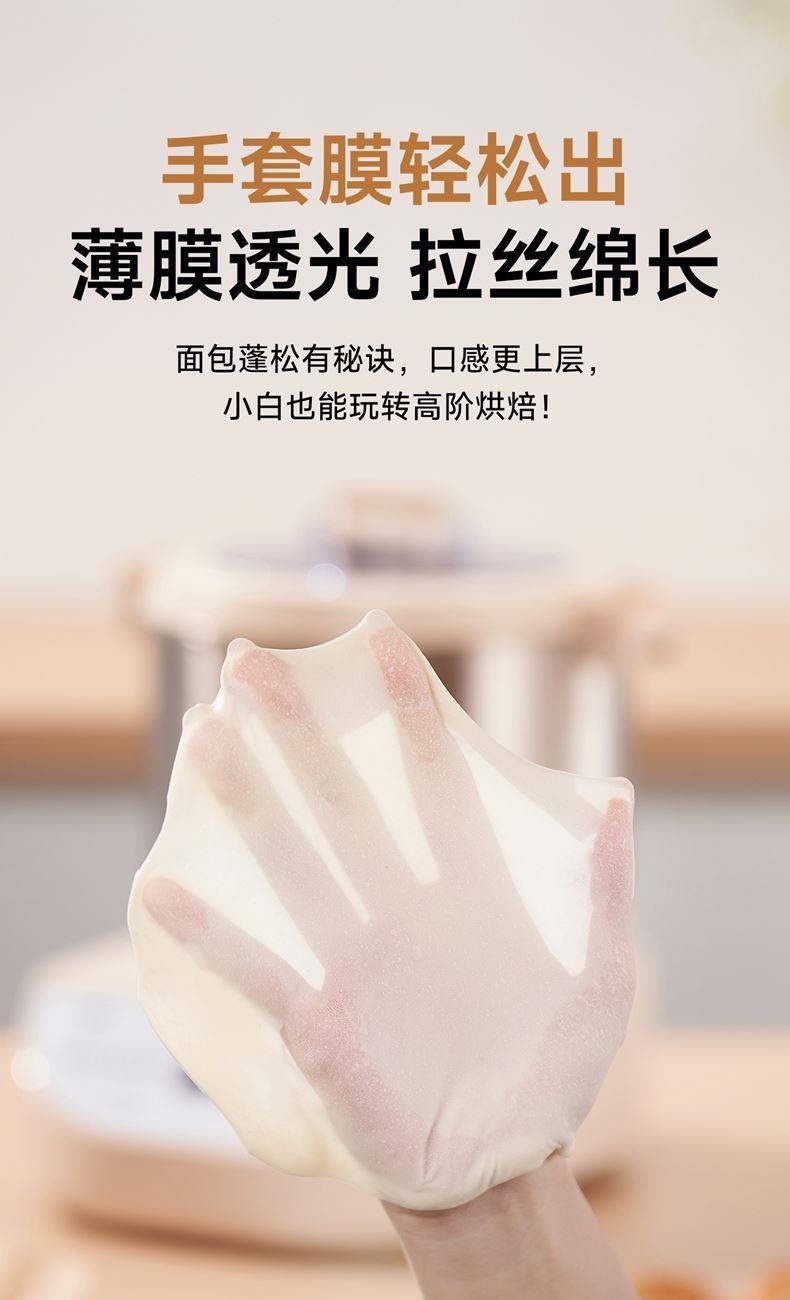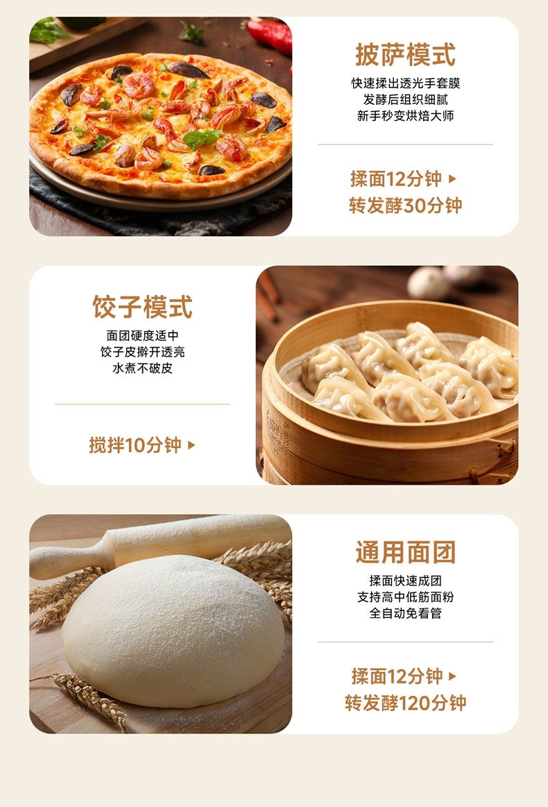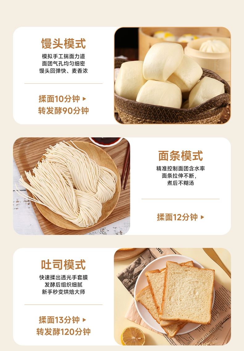 10升容量具备全自动和面、发酵、醒面功能、搅拌肉馅等;带有304 不锈钢和面桶; 300W直流电机,轻音设计,带有微电脑定时功能,智能揉面 + 恒温醒面; 7档调速,旋钮 + 触控双操控,7大功能可选,双刀配置,透明投料口;