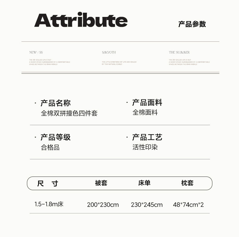 被套:200×230cm 床单:230×245cm 枕套:48×74cm 适用:1.5M-1.8M床 面料:棉 风格:轻奢风格 包装:精美天地盖礼盒 套件整体奢华感与仪式感并存空间质感瞬间升级 不经意间彰显出主人的优雅品质期待与你共赴一场生活美学之约。