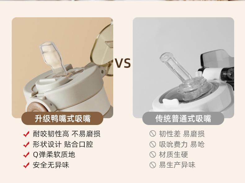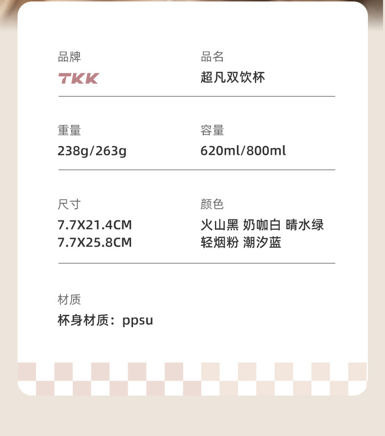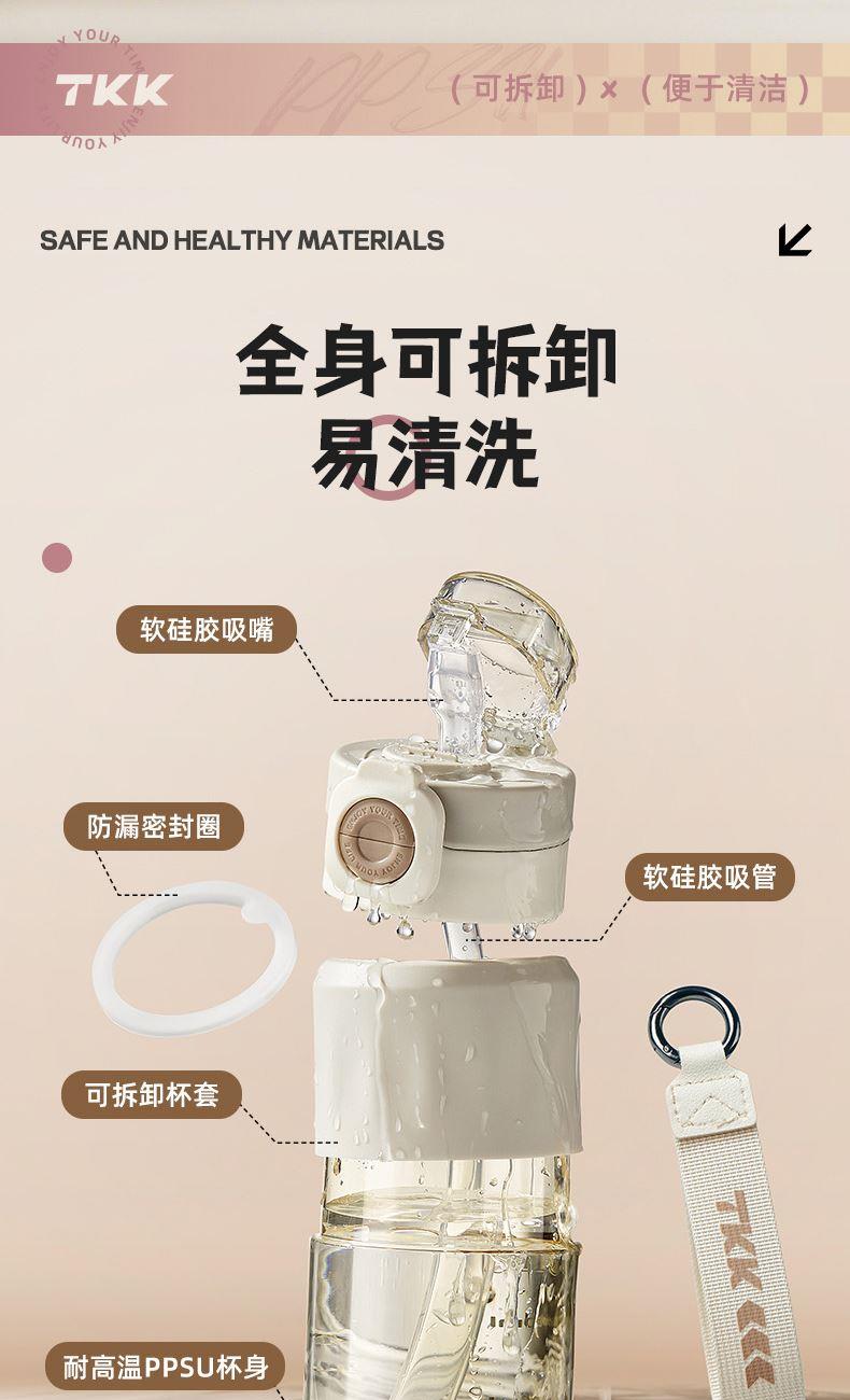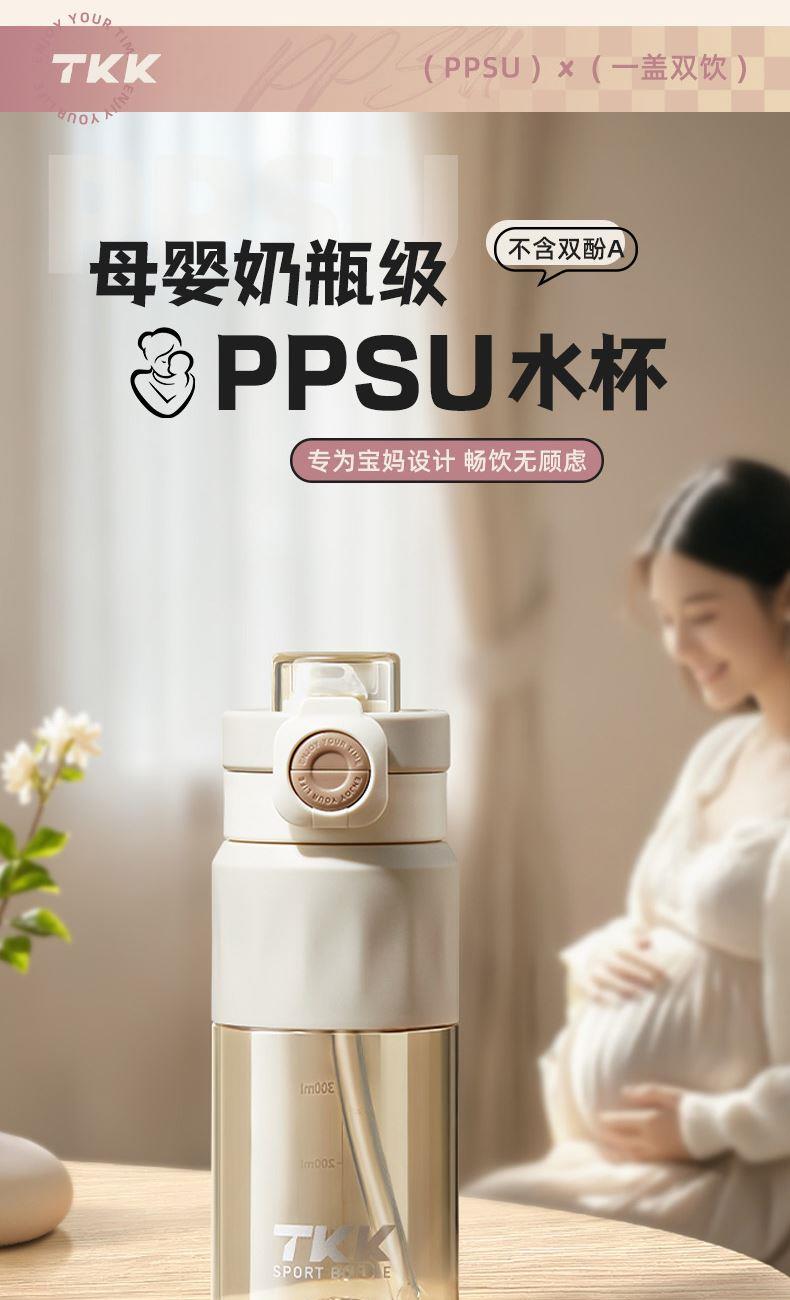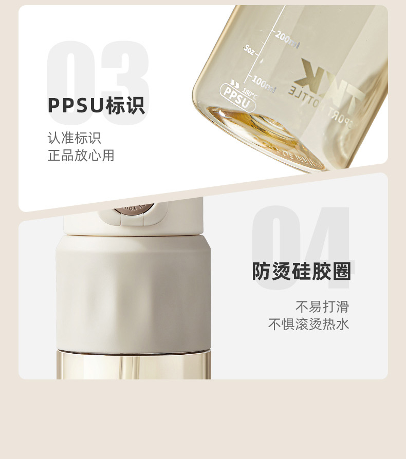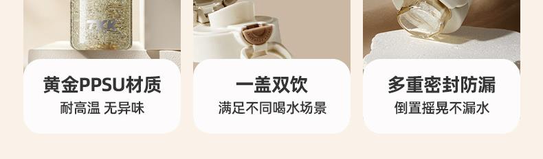 商品容量:620ML 杯身材质:PPSU 杯盖材质:PP+TPE 商品毛重:295G ★ 德国巴斯夫(ppsu)公司直供母婴级材质,加厚杯身, 180°耐高温,硅胶杯套不烫手,放心饮用 。 ★ 可水煮消毒,可紫外线消毒,杯身可微波炉加热水。 ★ 多种防漏设计,精密密封圈,倒置不漏。 ★ 一杯双饮,单手开盖无压力,不易呛口,够喝一整天。 ★ 安全锁扣,按压上翻开盖,可固定翻盖。 ★ 便携式加宽提绳设计,方便出行。 ★ 不藏污纳垢,容易清洗。 ★ 静音放置,耐磨杯底座,防滑工艺耐磨抗摔。