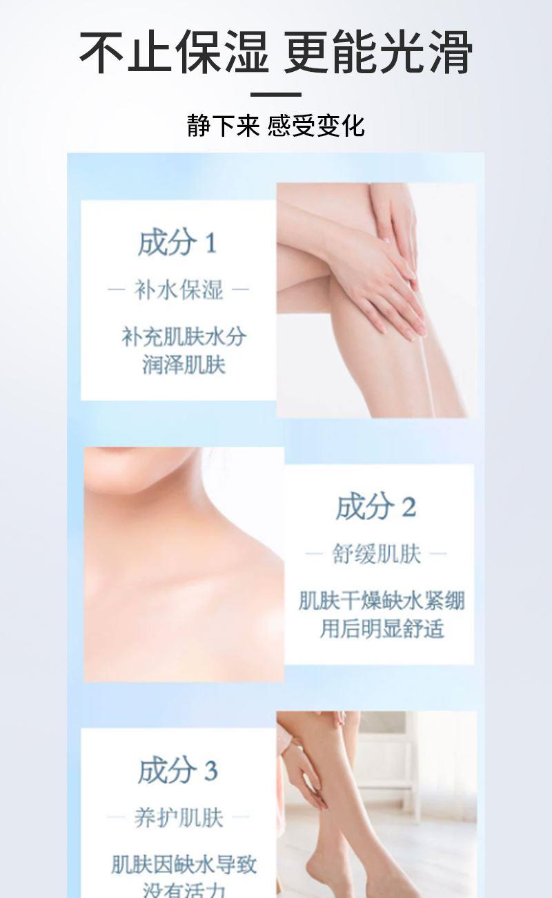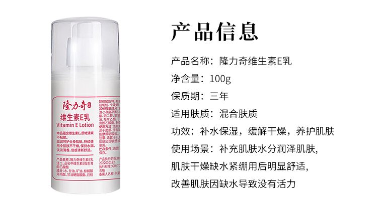 货号:LLQ-202502017 保 质 期:3年 适用肤质:混合肤质 功效:补水保湿,缓解干燥,养护肌肤 含量:100g/瓶 产品卖点: 1.维生素E滋养,深层保湿修护 2.温和低敏配方,全身适用不黏腻 3.舒缓干燥肌肤,长效锁水润泽