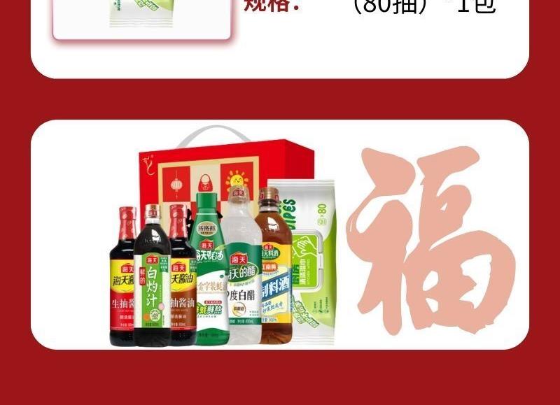产品配置: 海天生抽酱油500mL(PET瓶)*1瓶 海天老抽酱油500mL(PET瓶)*1瓶 海天金字装蚝油680g(PET瓶)*1瓶 海天鲜的白灼汁500mL(PET瓶)*1瓶 海天9度白醋800mL(PET瓶)*1瓶 海天精制料酒800mL(PET瓶)*1瓶 海氏海诺乐一享三厨房清洁湿巾(80抽)*1包 卖点: 可选产品丰富多样,礼箱随心组合,多种价位因需而定,充分满足各种送礼需求,是商务送礼、单位福利的用心之选。