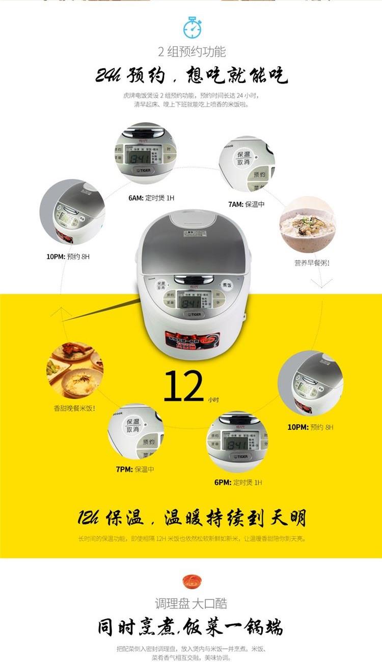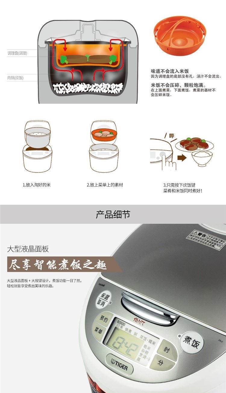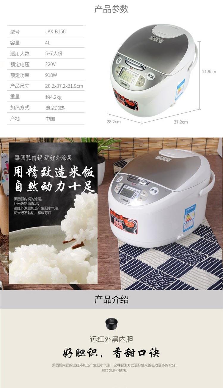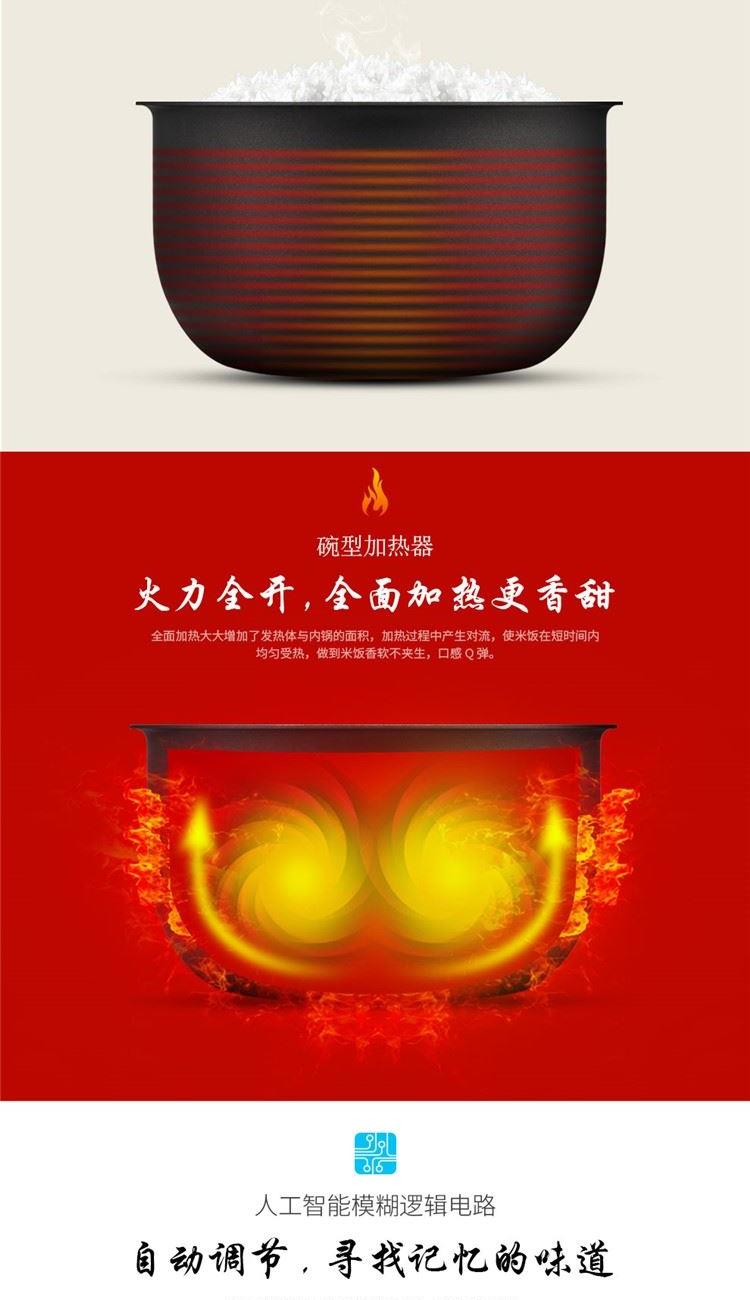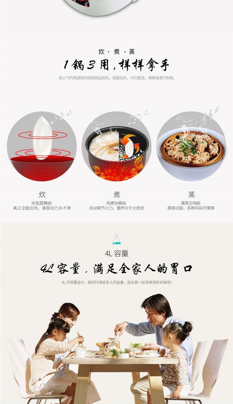 类别:家用电饭煲; 操作方式:按键式: 容量:4L; 功能:预约,蛋糕,粥,炖汤;内胆材质:黑晶;加热方式:三维立体加热; 包装清单: 电饭煲、内胆、调理盘、饭勺、汤勺、说明书、质保卡、食谱。