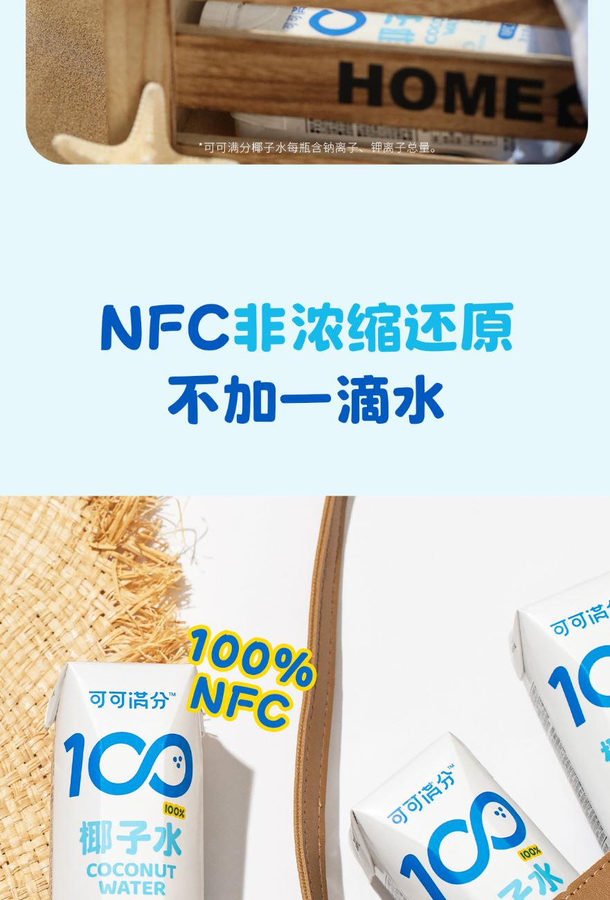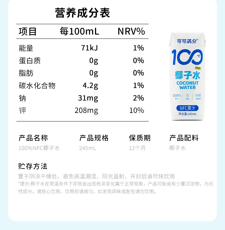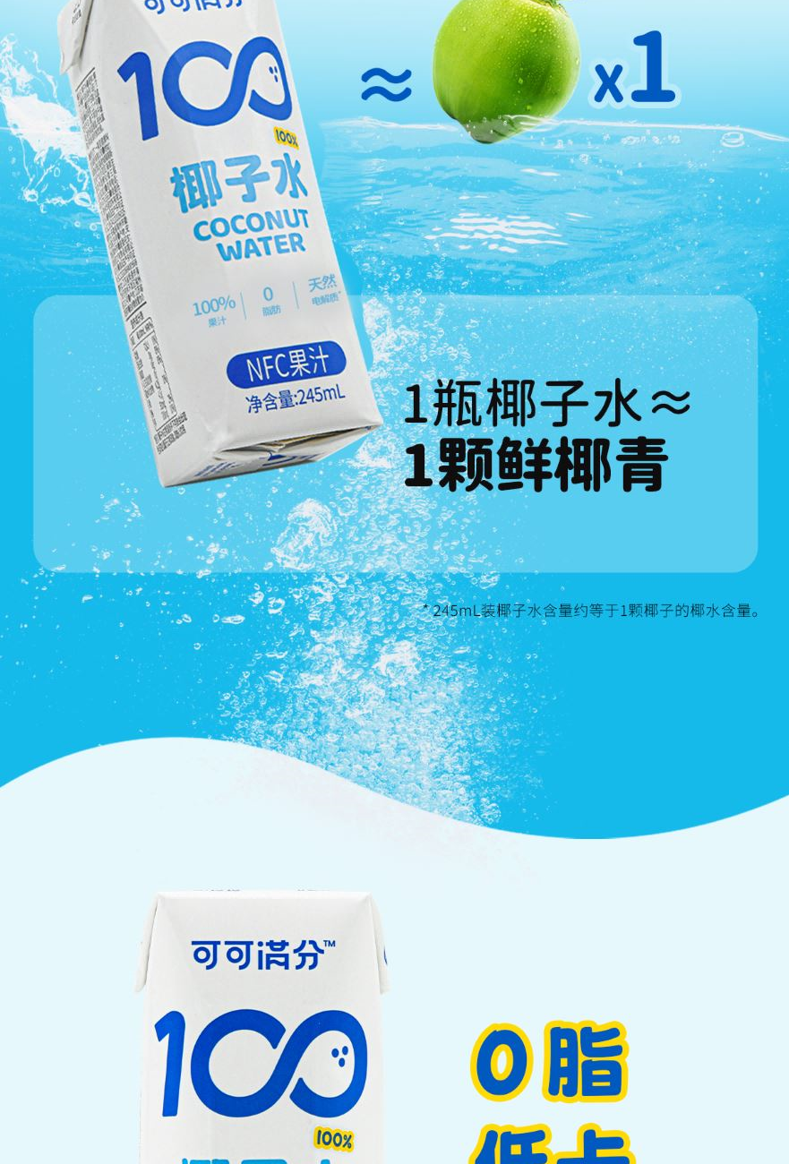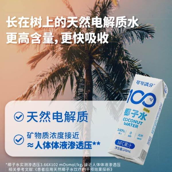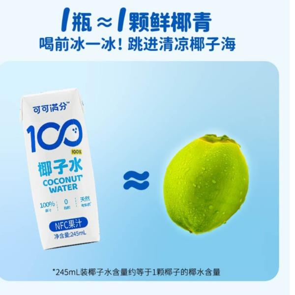 1、富含天然电解质≈8倍普通运动饮料 2、NFC鲜椰水,1瓶≈1颗鲜椰青 3、真正0添加,鲜椰直取,清冽微甜
