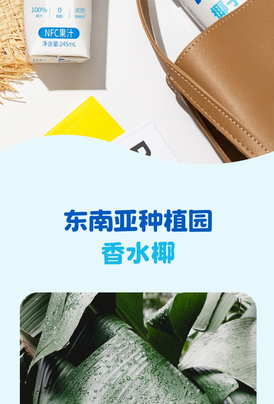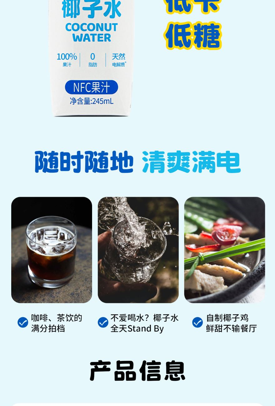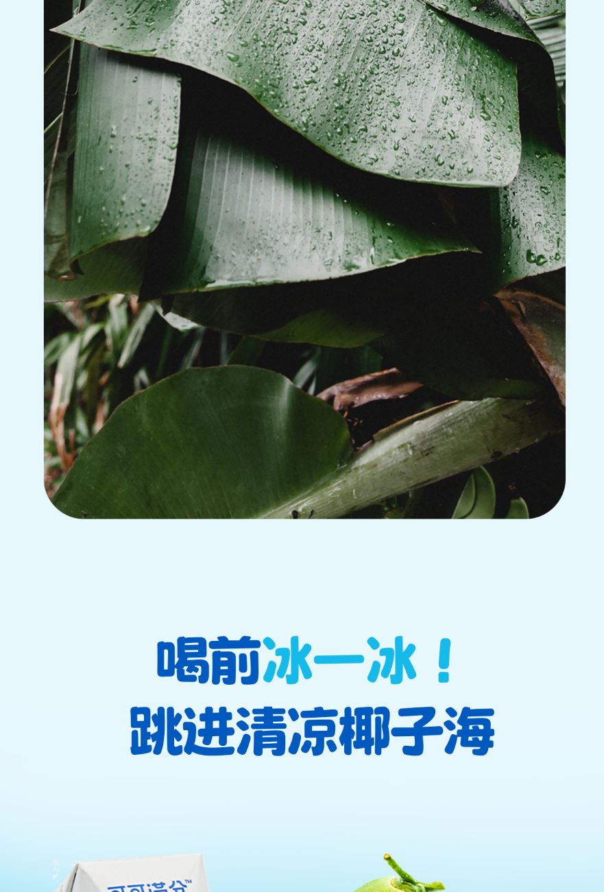 1、富含天然电解质≈8倍普通运动饮料 2、NFC鲜椰水,1瓶≈1颗鲜椰青 3、真正0添加,鲜椰直取,清冽微甜