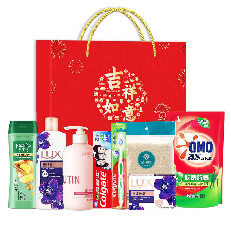 礼盒尺寸:32*8.5*24.5cm 包装尺寸:66* 46.5*51 CM 产品配置:(香型随机) 夏士莲洗发水400ml 力士洗发水350ml 力士香皂105g 洁丽雅毛巾(69*33cm) 高露洁牙膏90g 高露洁牙刷 香氛身体乳300ml 奥妙洗衣液400g 精美礼盒