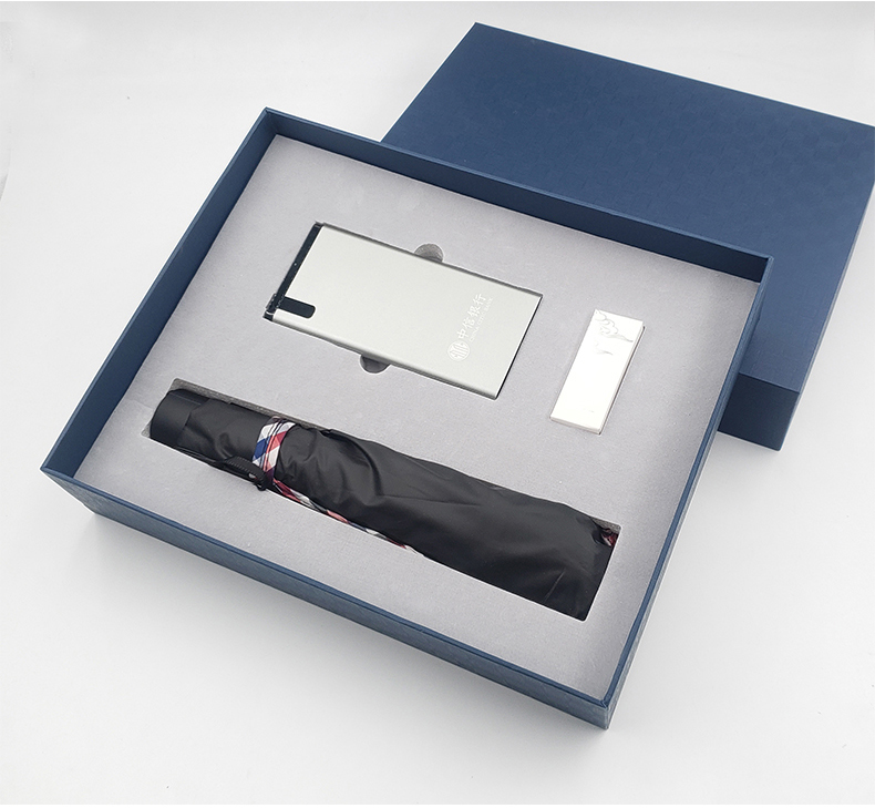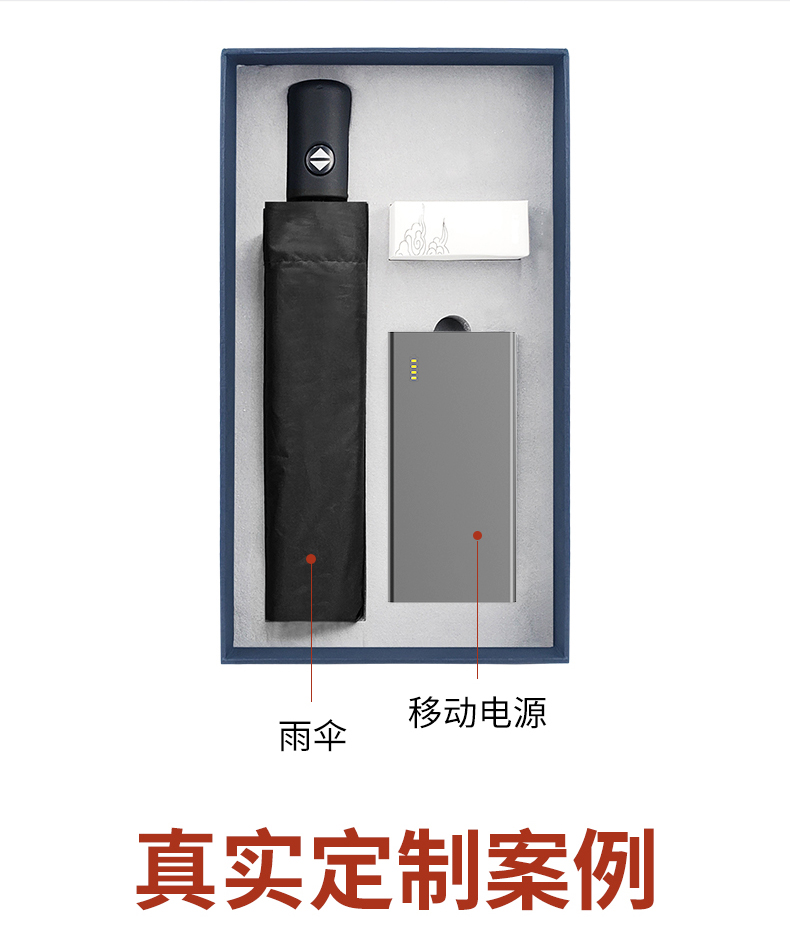 礼盒配置 : 1、10000mAh移动电源 2、全自动8骨三折伞 尺寸:280x56mm 3、蓝色包装盒尺寸:182x326x75mm 4、蓝色手提袋尺寸:192x346x85mm 5、颜色:黑色 6、重量:28kg/箱
