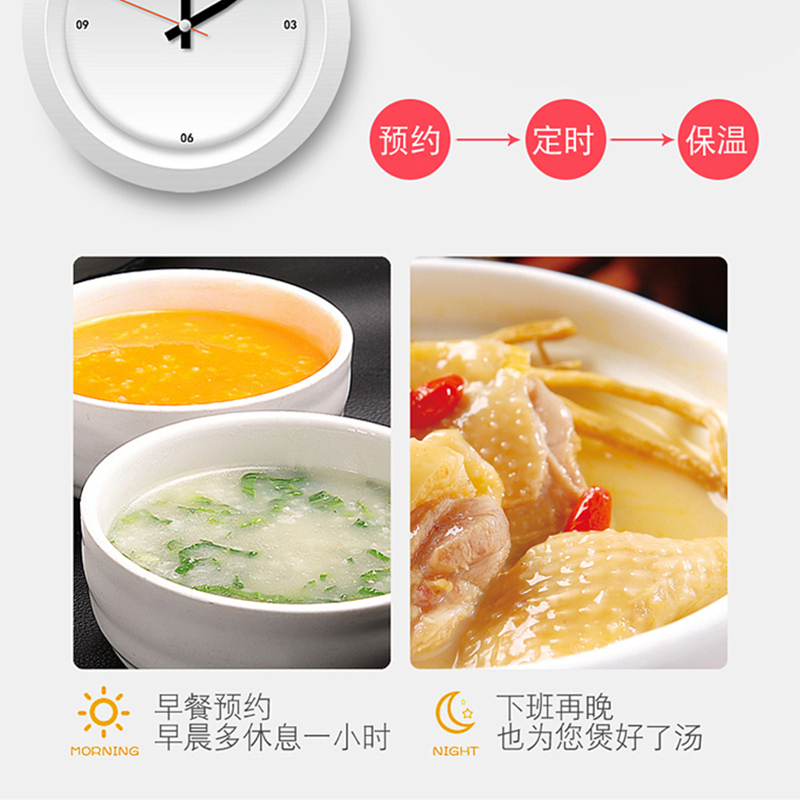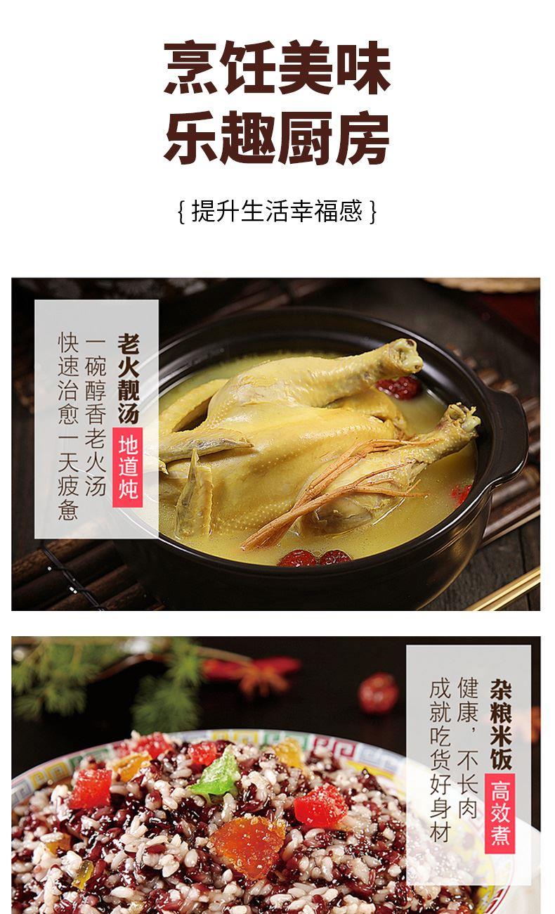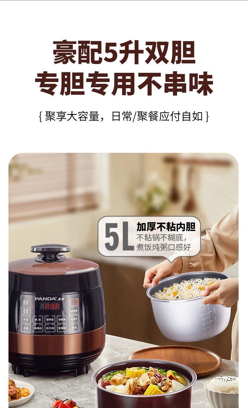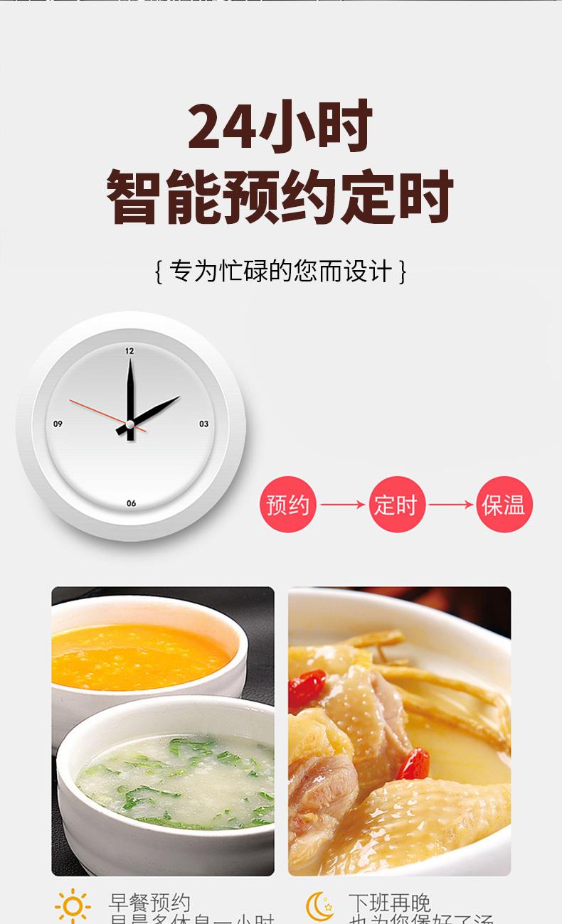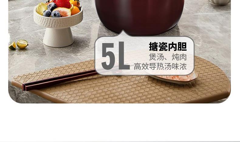 5L双胆大容量,一锅双胆加厚不粘内胆(不粘糊,蒸米煮粥口感好)+搪瓷内胆(煲汤、焖炖肉类高效导热汤香味浓) 900W大火力,美味不用久等 24小时智能预约,准时为您准备好饭菜 十大功能:煲粥、营养炖、杂粮粥、排骨、自动保温、预约 升级防水按键屏,十大安全保证。