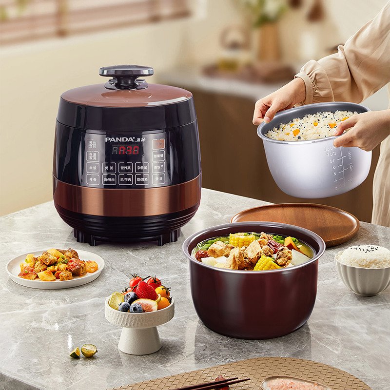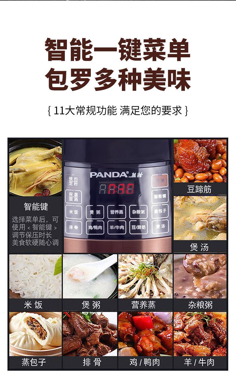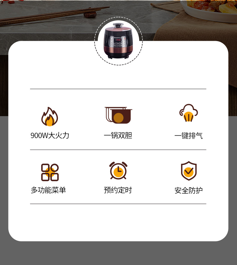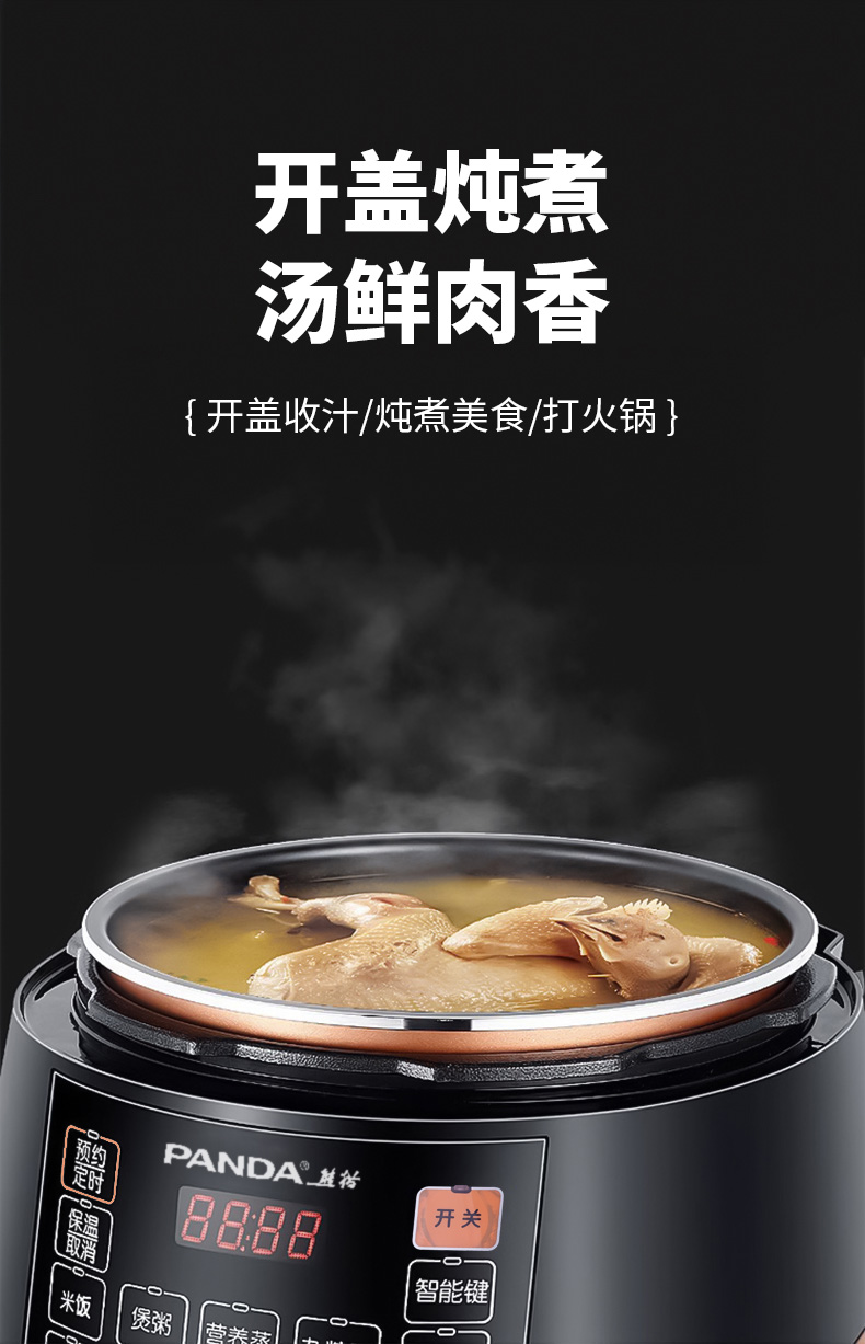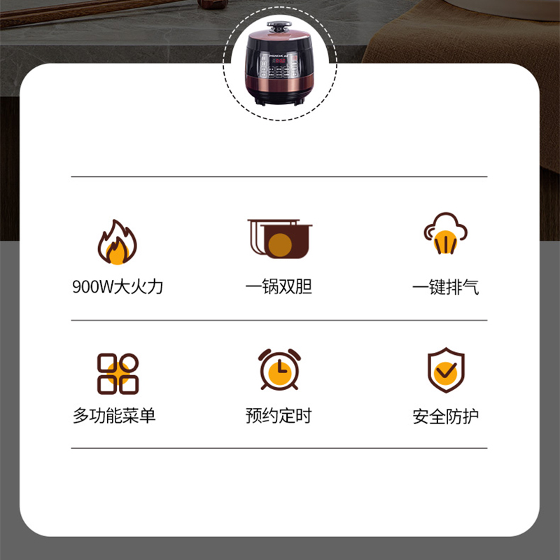 5L双胆大容量,一锅双胆加厚不粘内胆(不粘糊,蒸米煮粥口感好)+搪瓷内胆(煲汤、焖炖肉类高效导热汤香味浓) 900W大火力,美味不用久等 24小时智能预约,准时为您准备好饭菜 十大功能:煲粥、营养炖、杂粮粥、排骨、自动保温、预约 升级防水按键屏,十大安全保证。