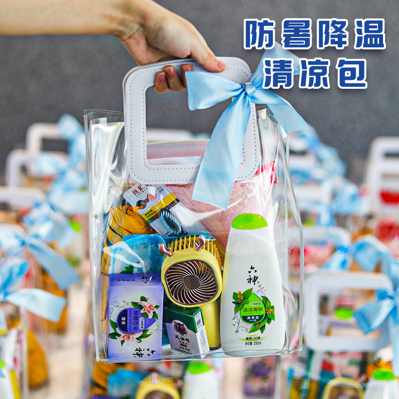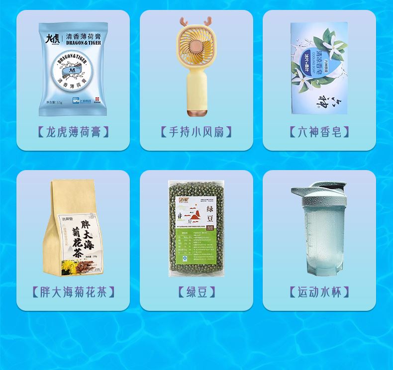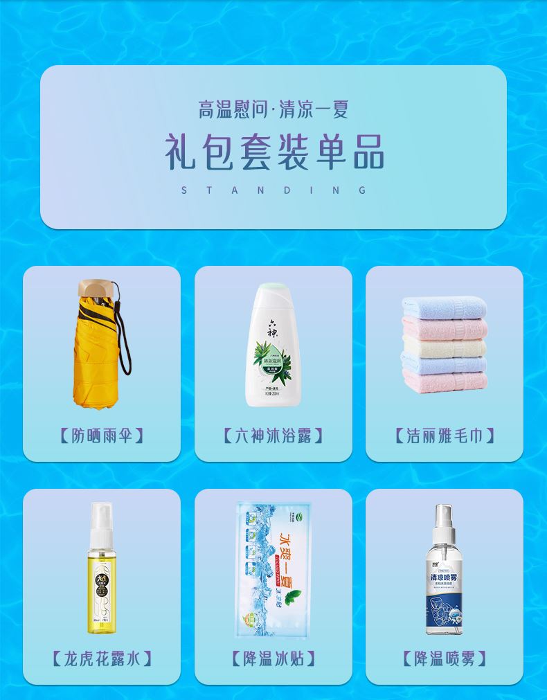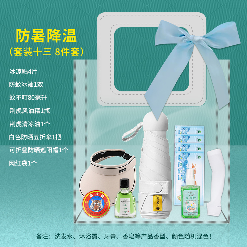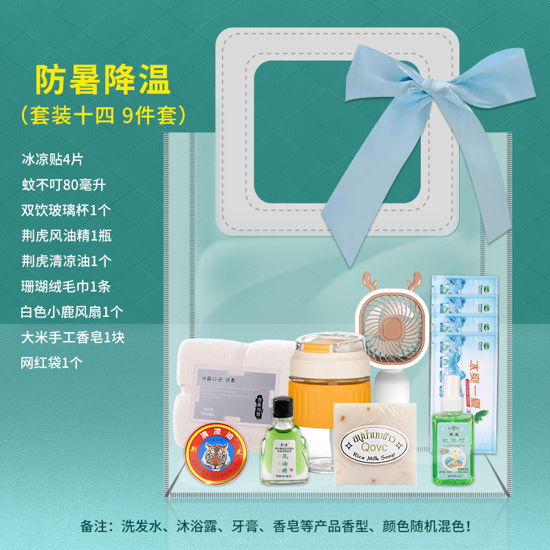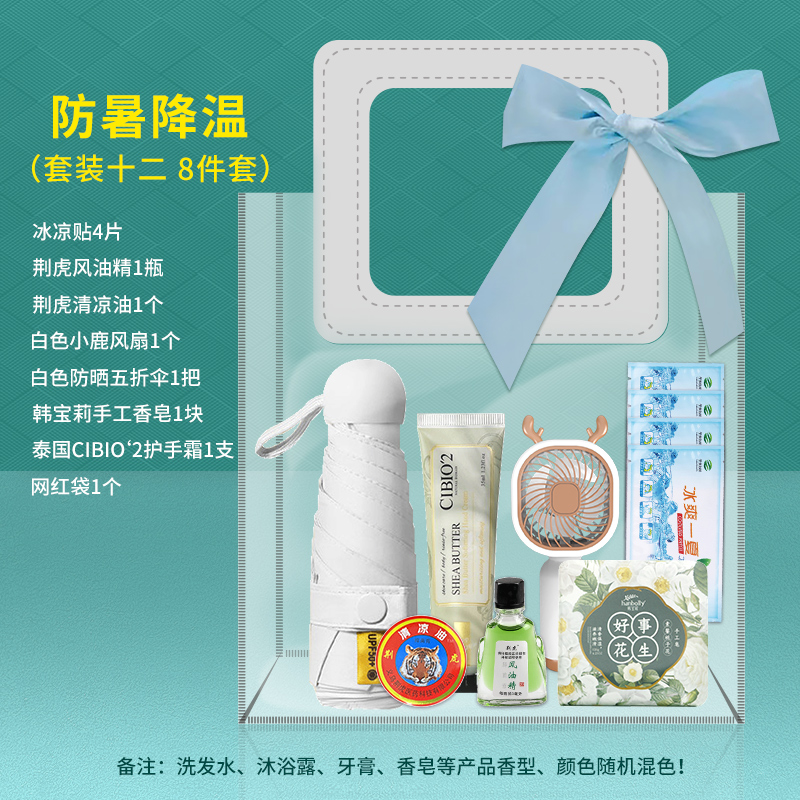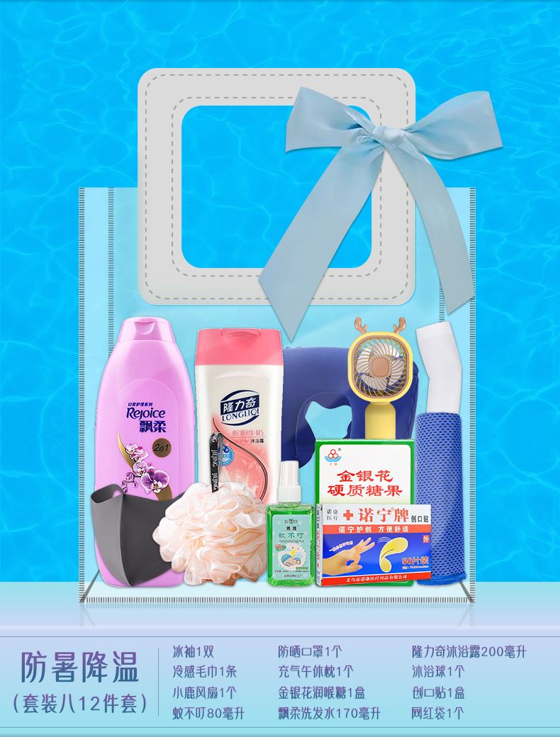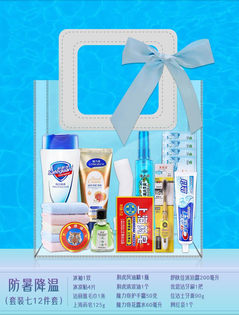 1.注:商城报价对应首张主图款式! 其他套装参考细节图,费用另计! 2. 咨询下单请备注好产品信息! 3.首图款式产品明细:防暑降温(套装十一 12件套):龙虎精油1瓶,洁丽雅毛巾1条,上海药皂125g,龙虎清凉霜1袋,高露洁牙刷1支,佳洁士牙膏90g,多芬护发素195g,潘婷洗发水200毫升,六神沐浴露200毫升,沐浴球1个,驱蚊贴1盒,网红袋1个