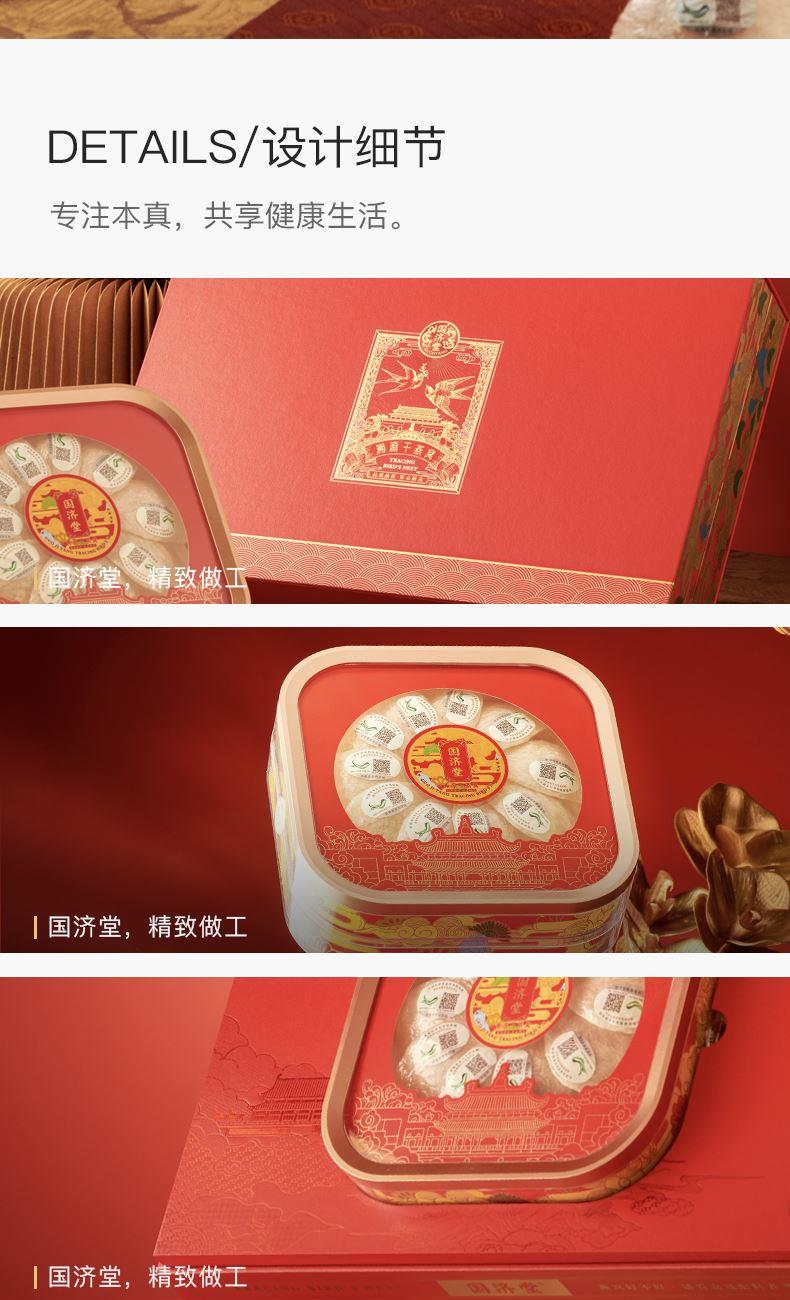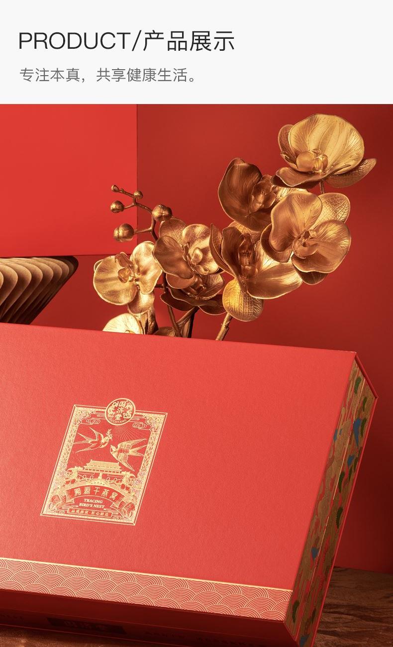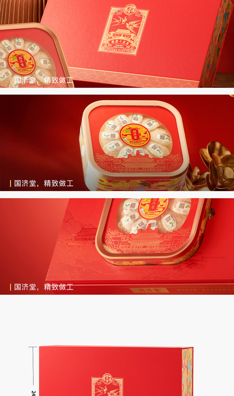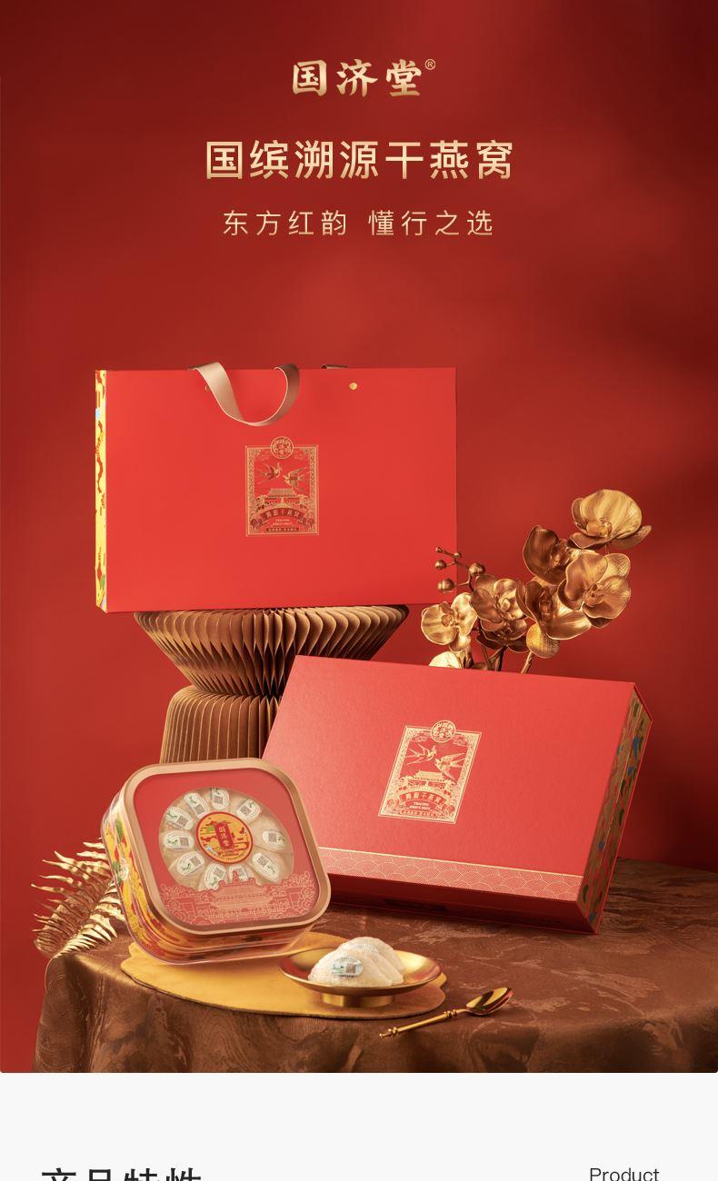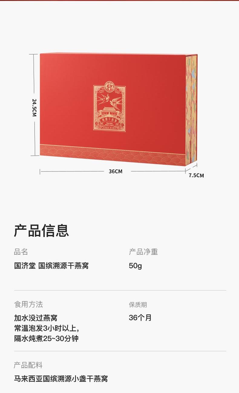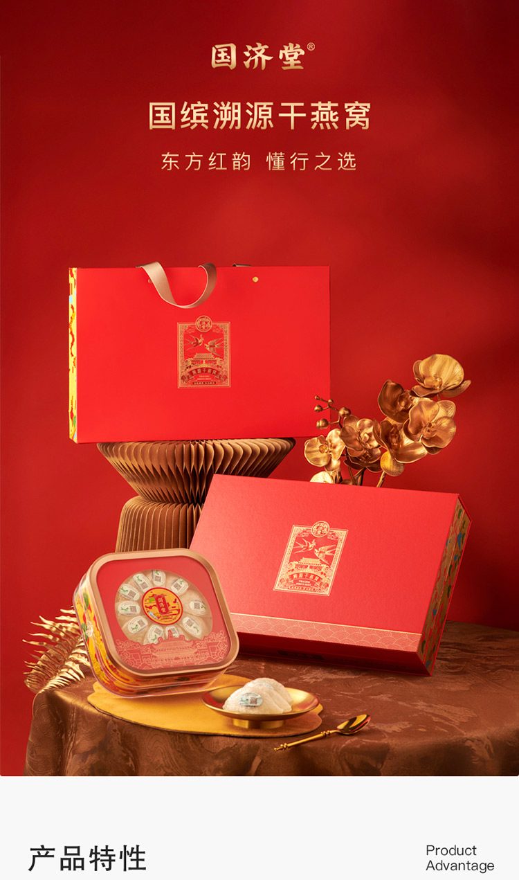 规格:50g装小盏干燕窝 配料:马来西亚溯源干燕窝 采用大气传统红颜色,常见但不俗气, 礼盒设计图案融合国风和欧式风格, 并将国济堂logo融入其中