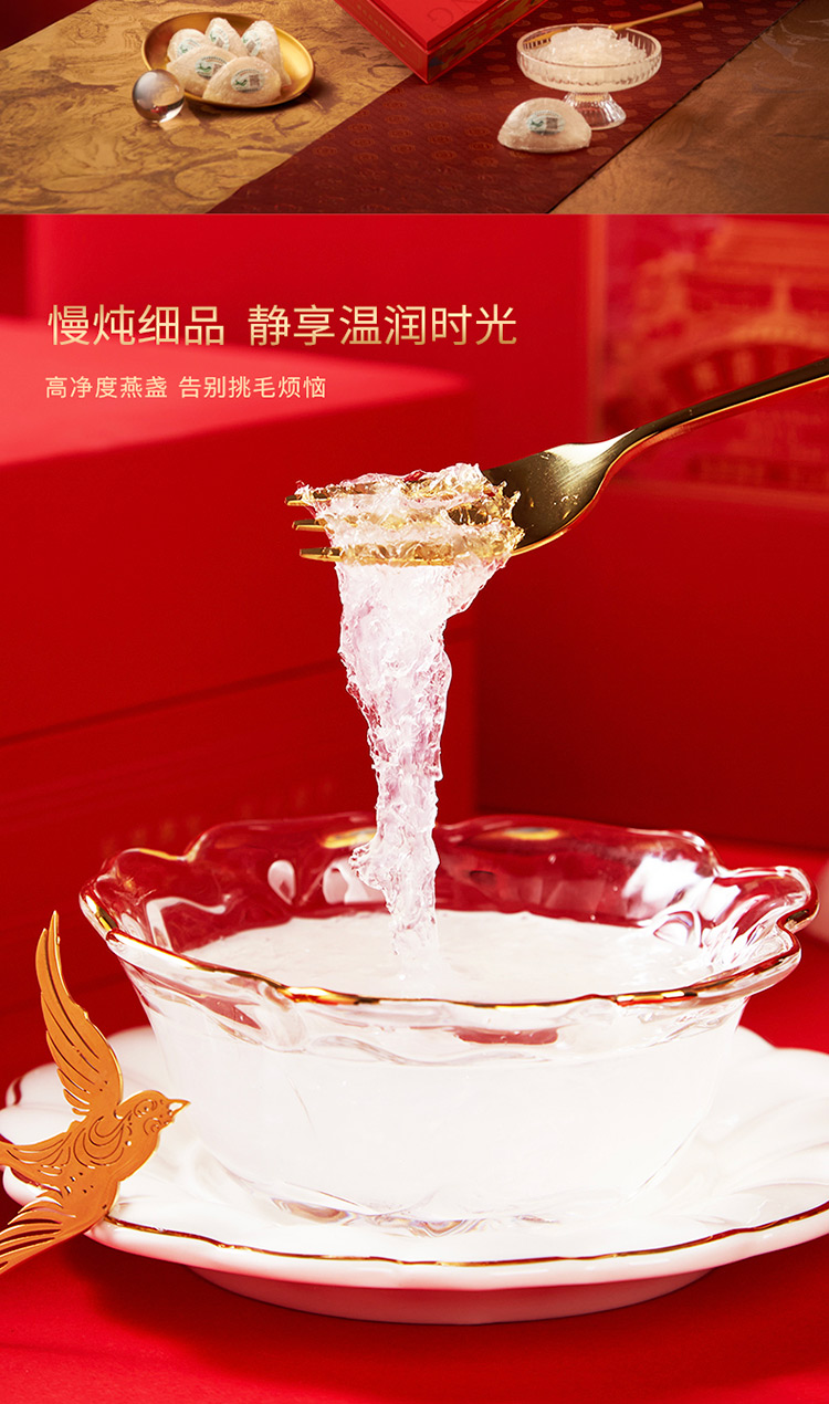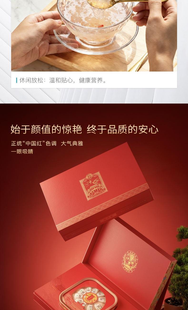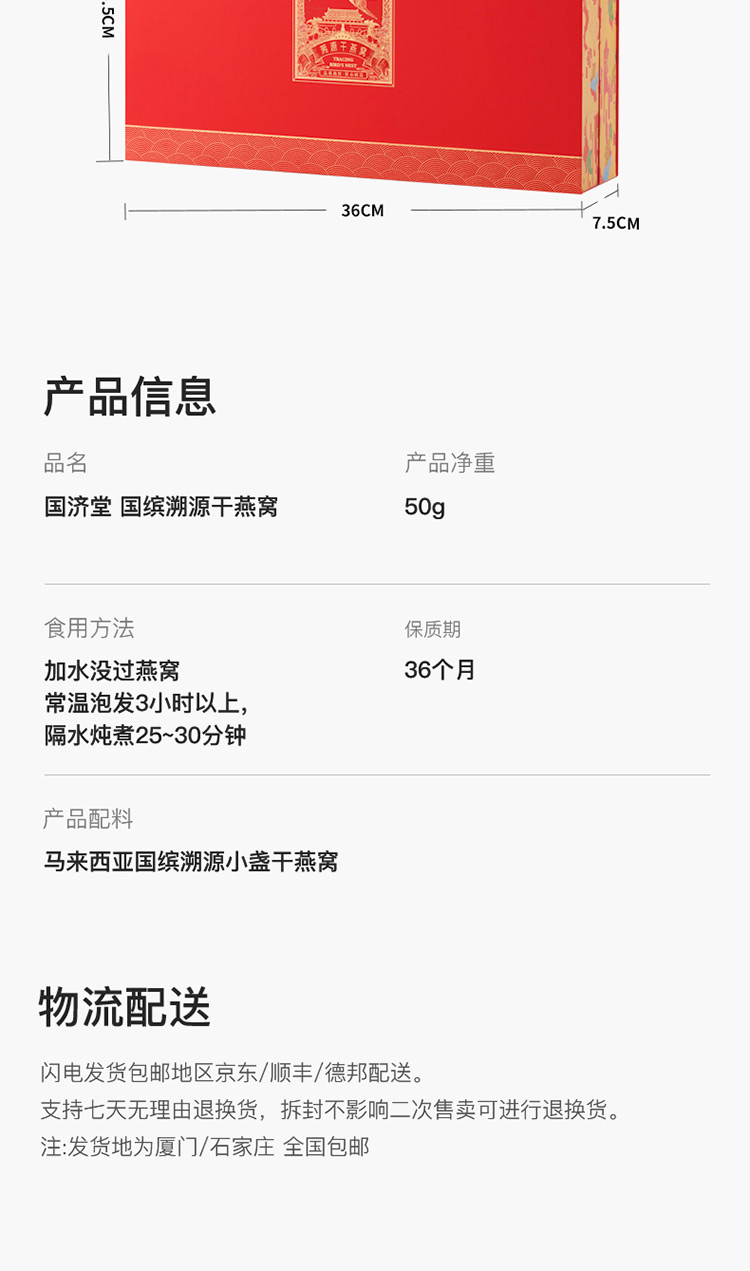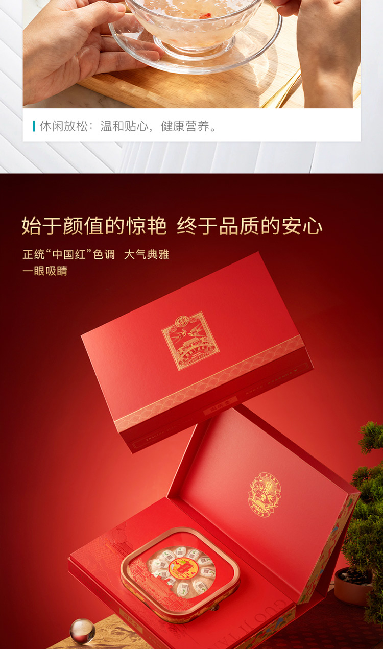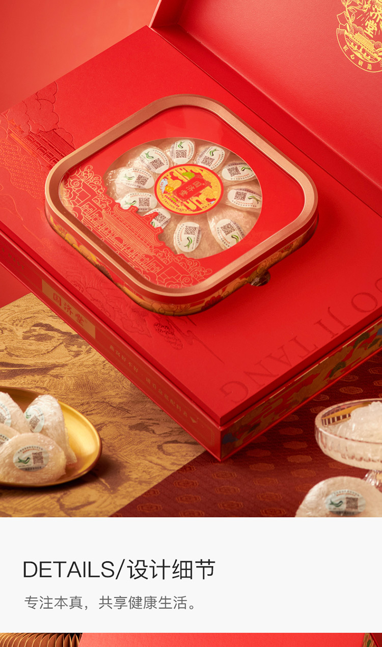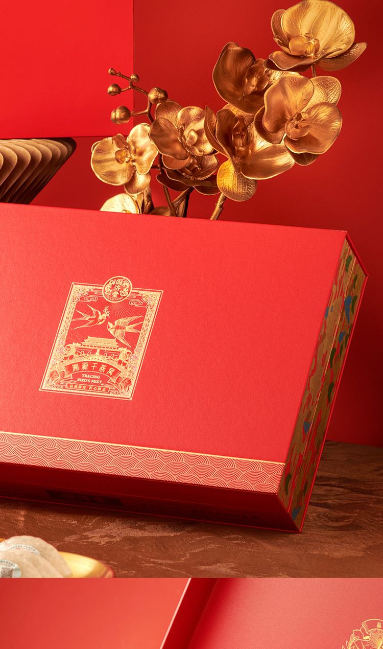 规格:50g装小盏干燕窝 配料:马来西亚溯源干燕窝 采用大气传统红颜色,常见但不俗气, 礼盒设计图案融合国风和欧式风格, 并将国济堂logo融入其中