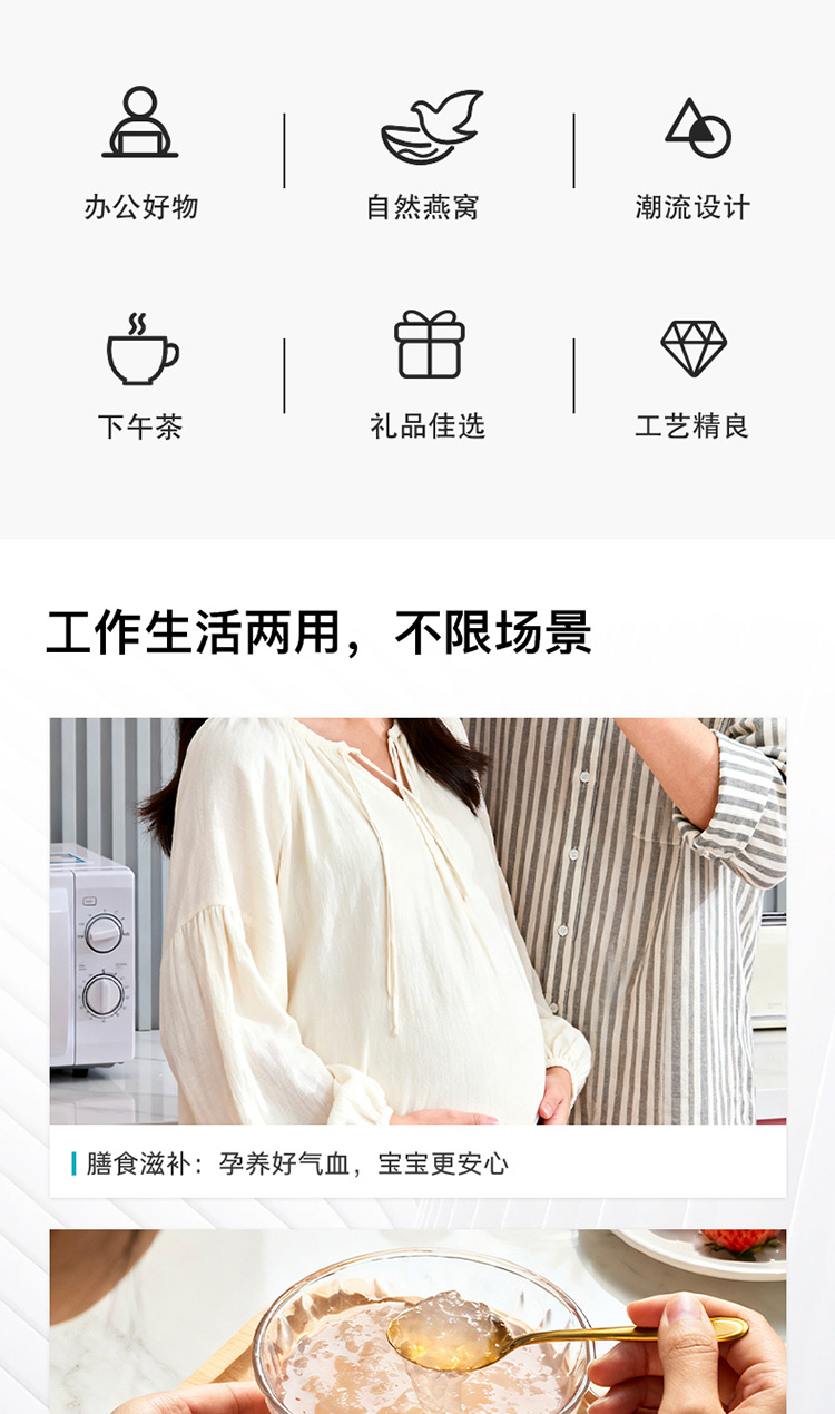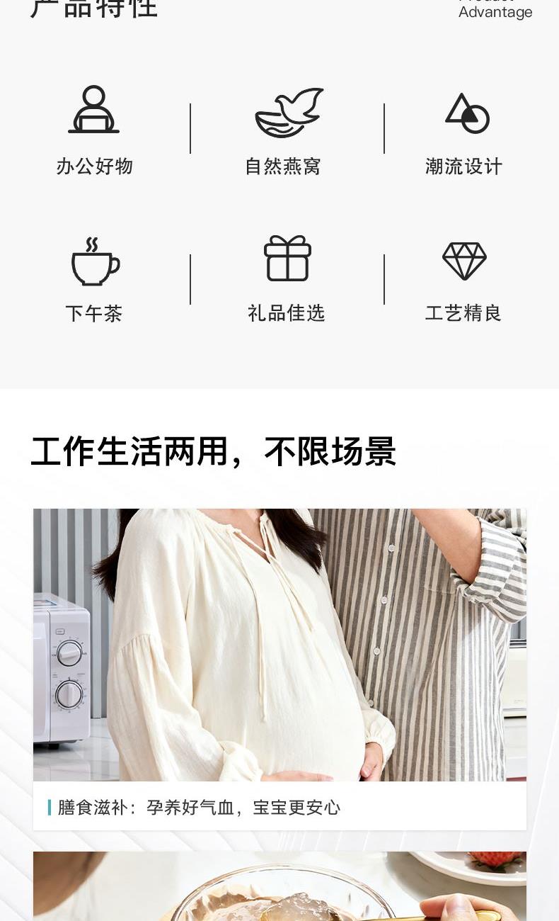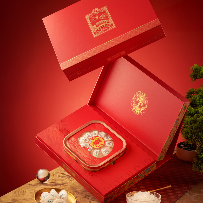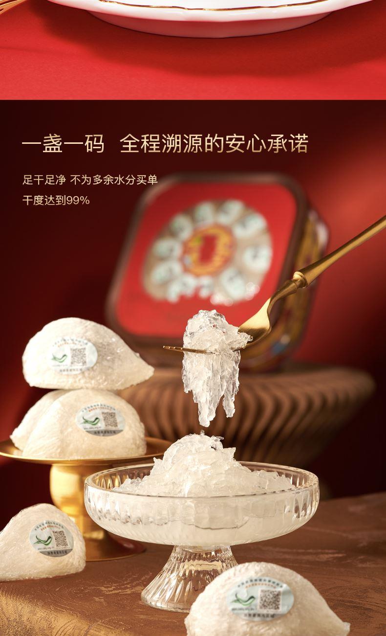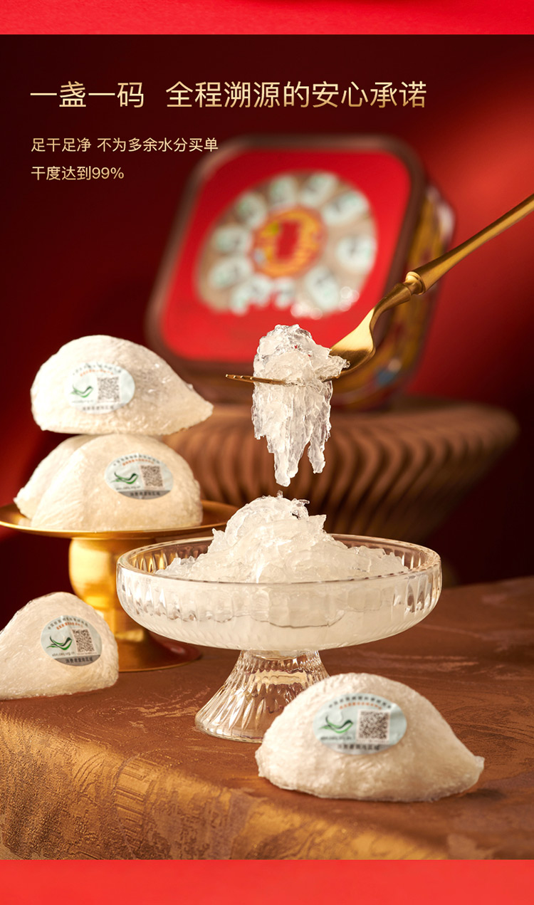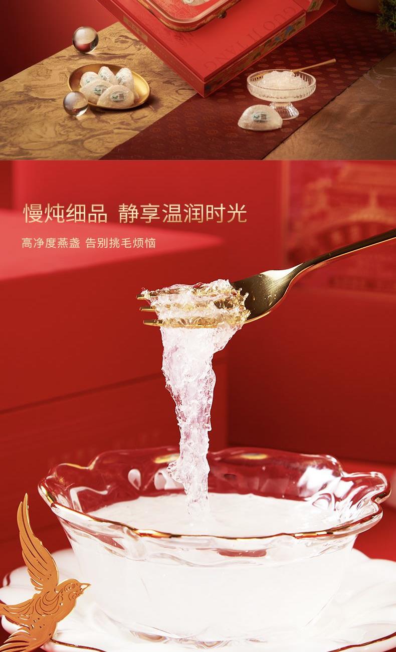 规格:50g装小盏干燕窝 配料:马来西亚溯源干燕窝 采用大气传统红颜色,常见但不俗气, 礼盒设计图案融合国风和欧式风格, 并将国济堂logo融入其中