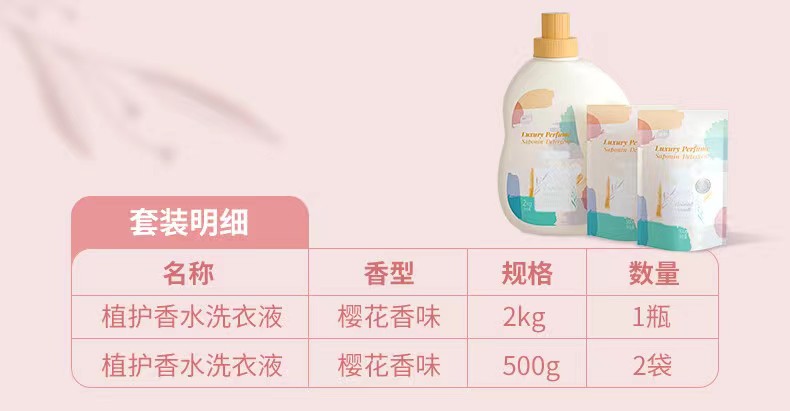 销售规格:植护香水洗衣液2kg瓶装*1瓶+植护洗衣液袋装500g*1袋+植护内衣皂80g*1块+植护地板清洁剂500g*1瓶+植护洗手液480ml*1瓶+植护手口湿巾180X130mm