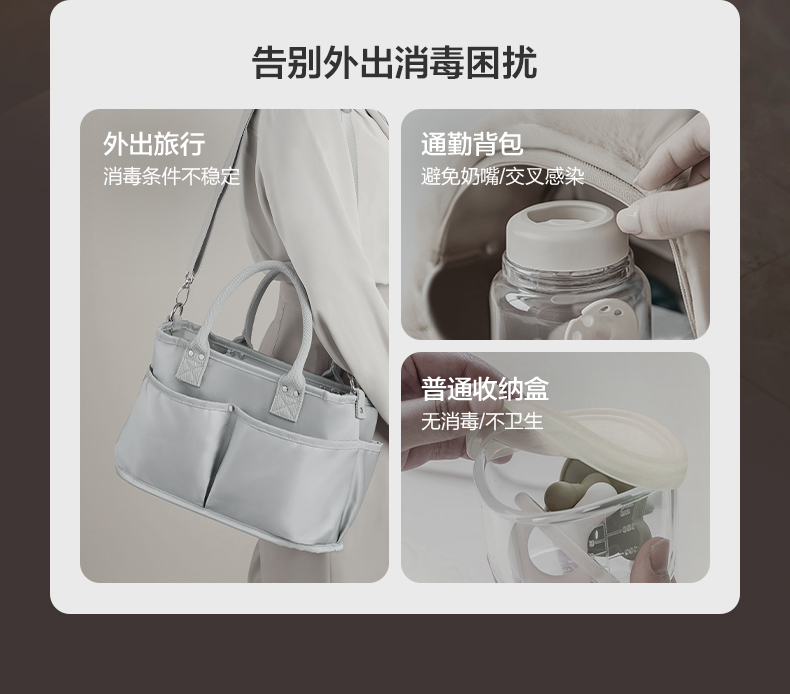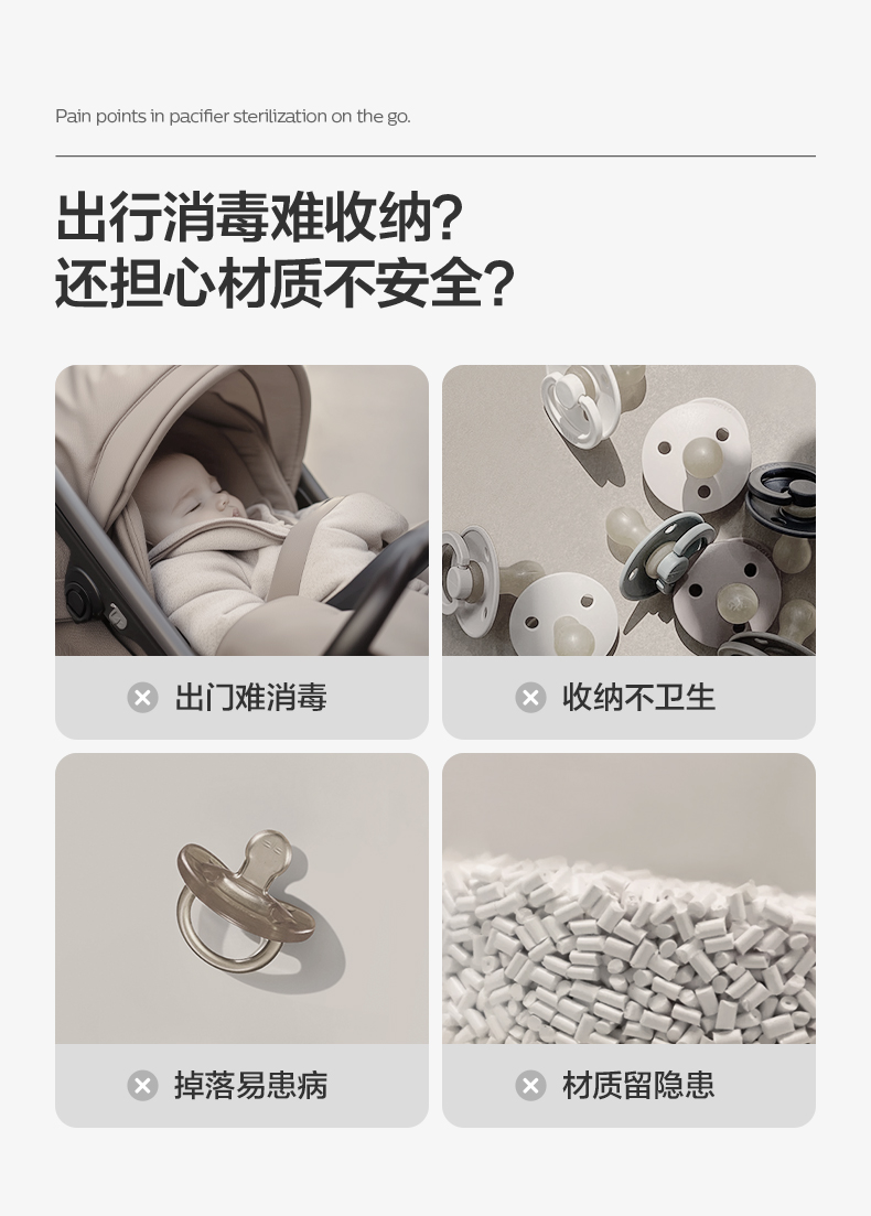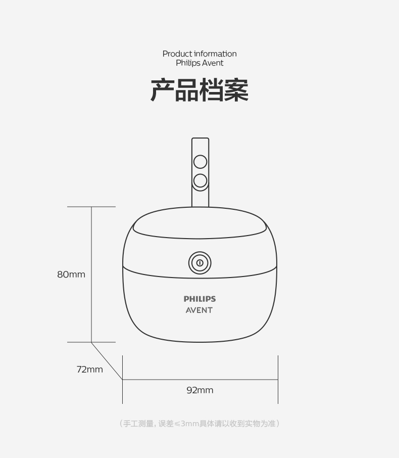 主要材质:ABS+硅胶 颜色:北极白 额定电压:3.7V 额定输入功率:8W 便携UV消毒盒,外出随取随用 4灯珠UV消毒,保护奶嘴安全 严选食品级材质,仅125g,超轻便携 59秒/180秒双档消毒模式 超长续航,满电畅享多次使用