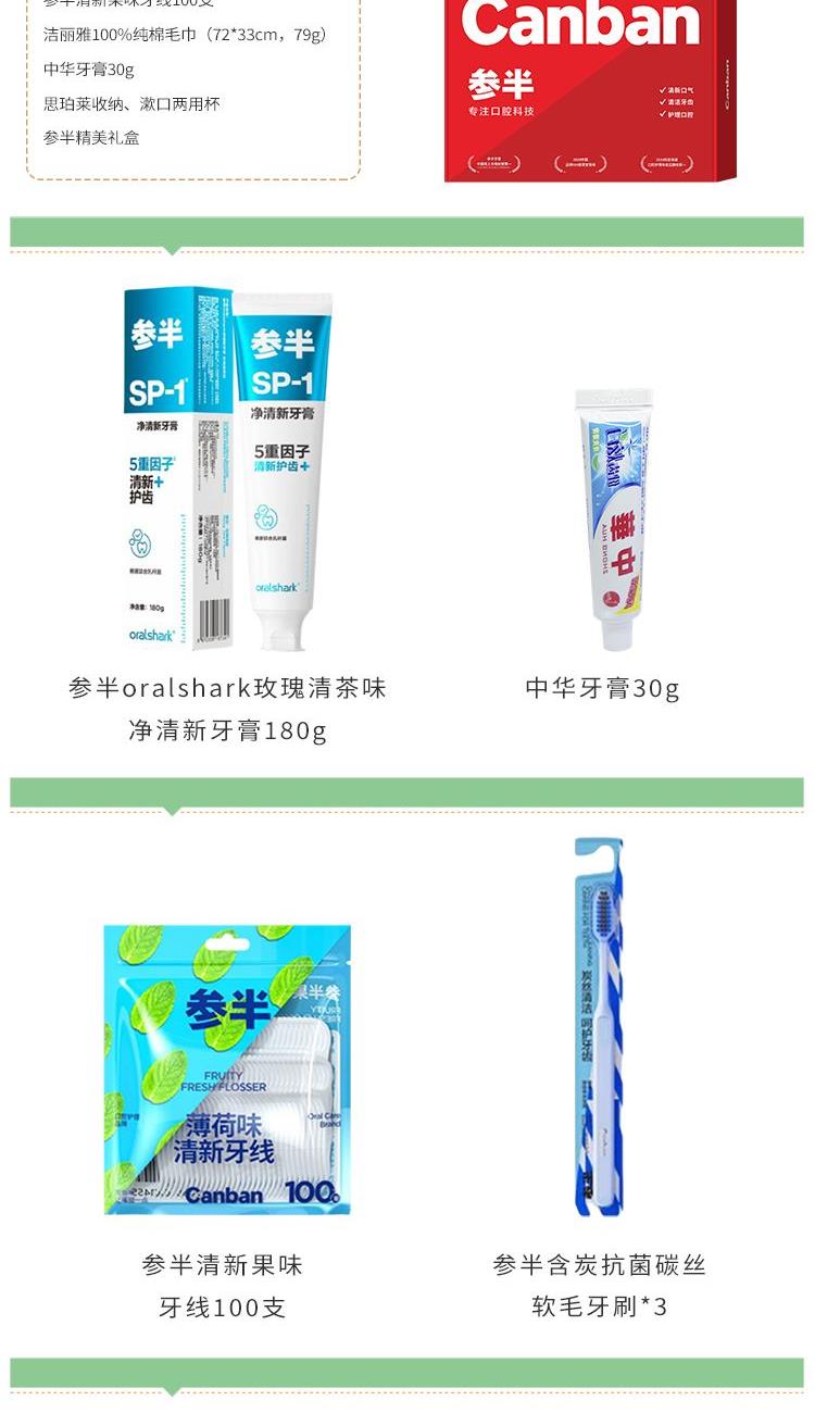 参半oralshark玫瑰清茶味净清新牙膏180g 参半含炭碳丝软毛牙刷 参半含炭碳丝软毛牙刷 参半含炭碳丝软毛牙刷 参半清新果味牙线100支 洁丽雅纯棉毛巾(72*33cm,79g) 中华牙膏30g 思珀莱收纳、漱口两用杯 思珀莱精美礼盒