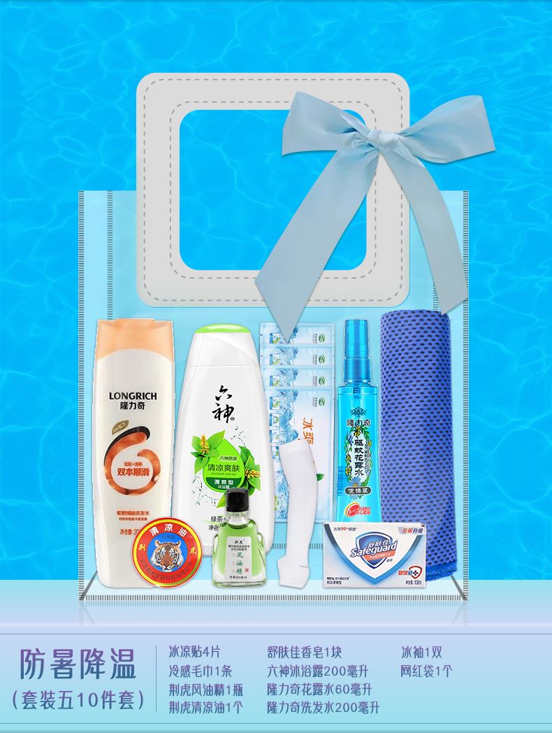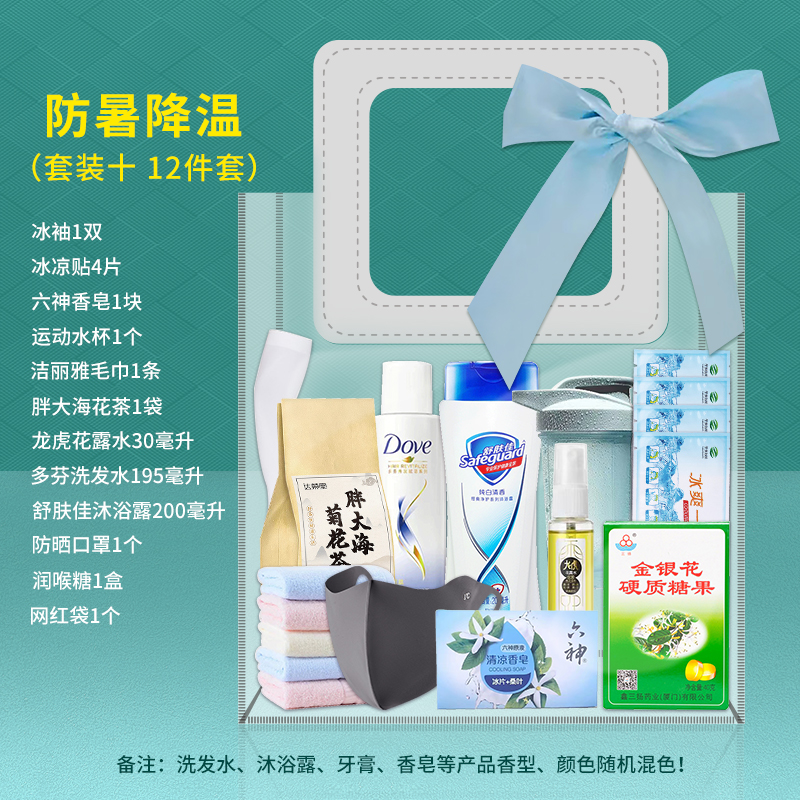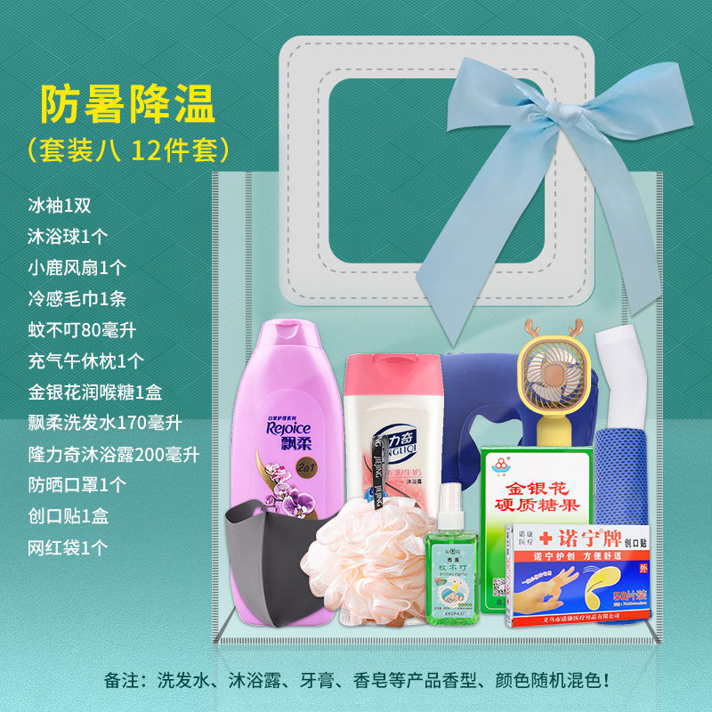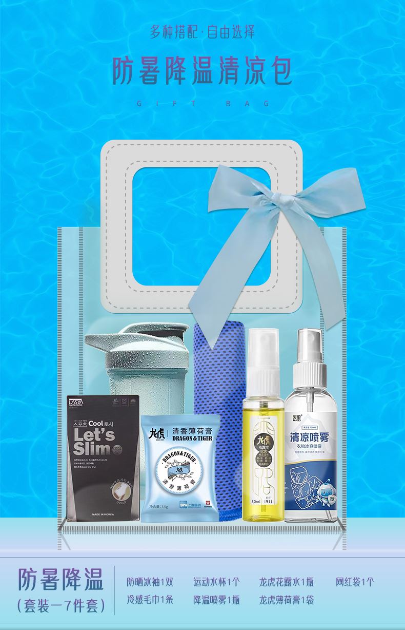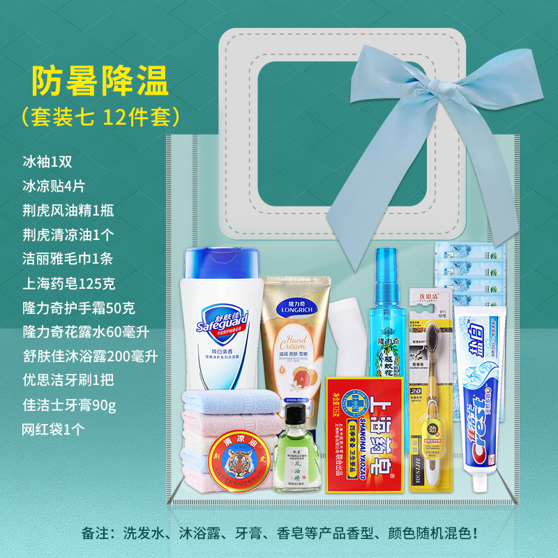 1.注:商城报价对应首张主图款式! 其他套装参考细节图,费用另计! 2. 咨询下单请备注好产品信息! 3.首图款式产品明细:防暑降温(套装六 12件套):冰袖1双 ,冷感毛巾1条,蚊不叮80毫升,荆虎风油精1瓶,荆虎清凉油1个,舒肤佳香皂1块,优思洁牙刷1支,佳洁士牙膏90克,清凉喷雾100毫升,润喉糖1盒,冰凉贴4片,网红袋1个